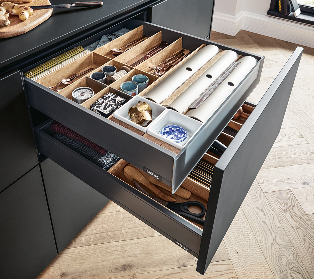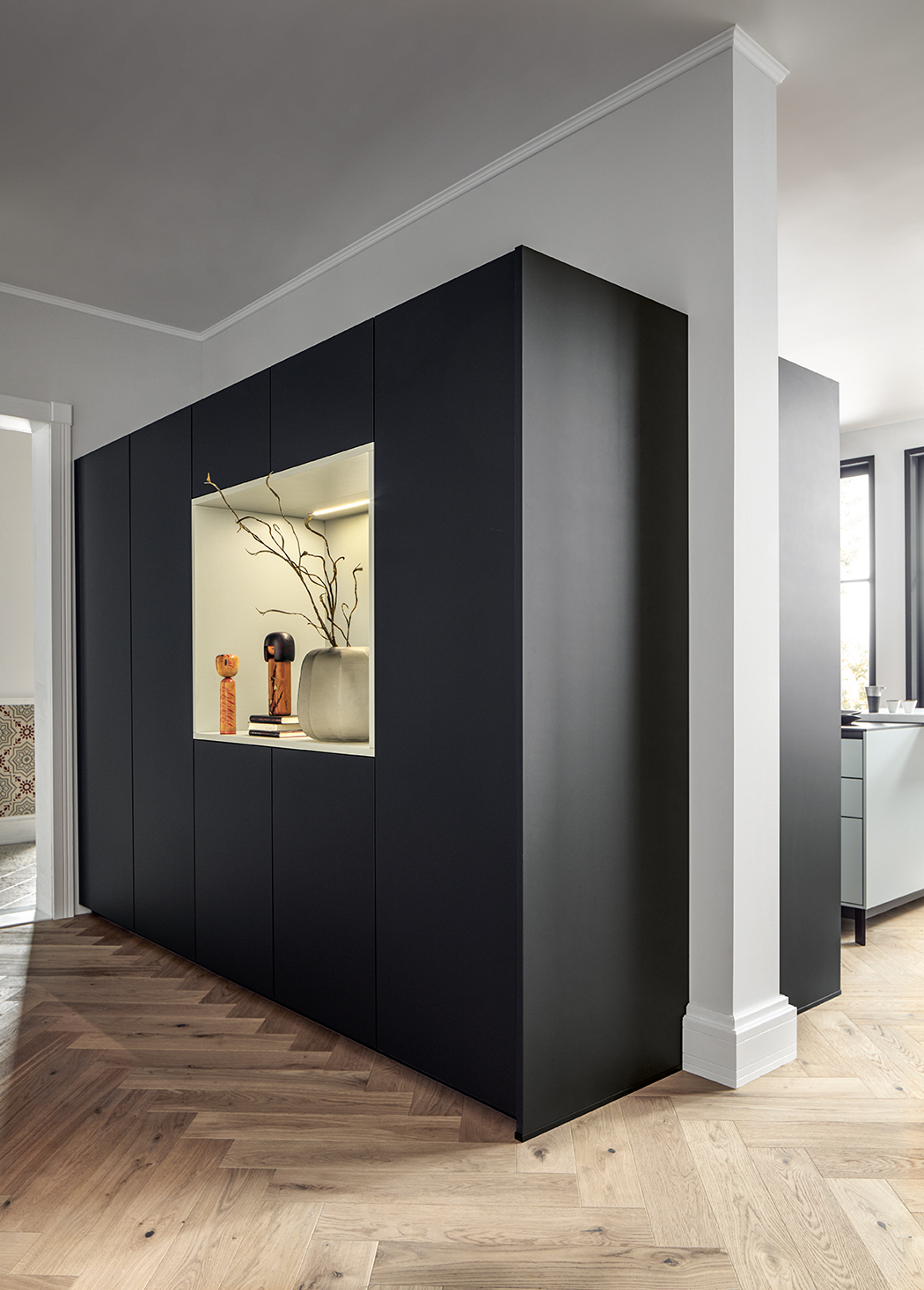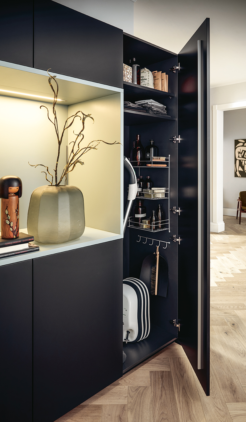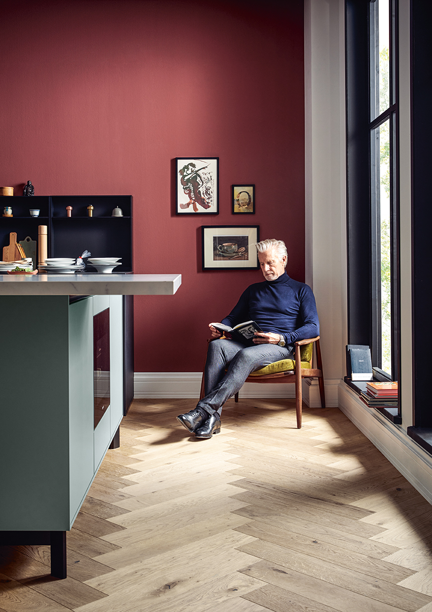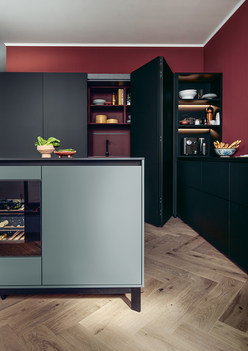 Kuchynské linky za ňou v indickej červenej dávajú vďaka tlmeným farbám odvážny akcent. Po zatvorení dvierok Pocket systému tvoria police na knihy v jedálenskej časti a multifunkčná jednotka v predsieni harmonický celok s hromadami úložného priestoru.