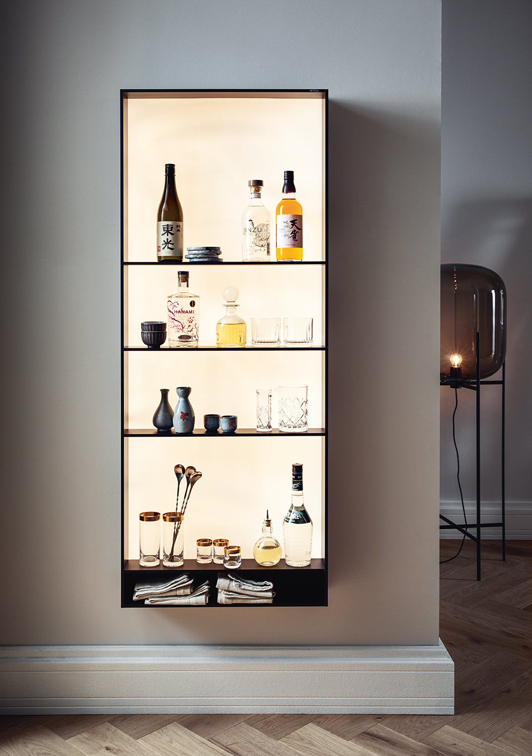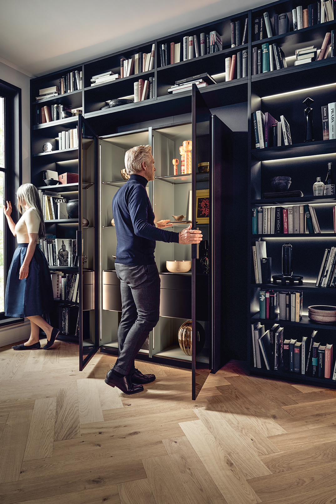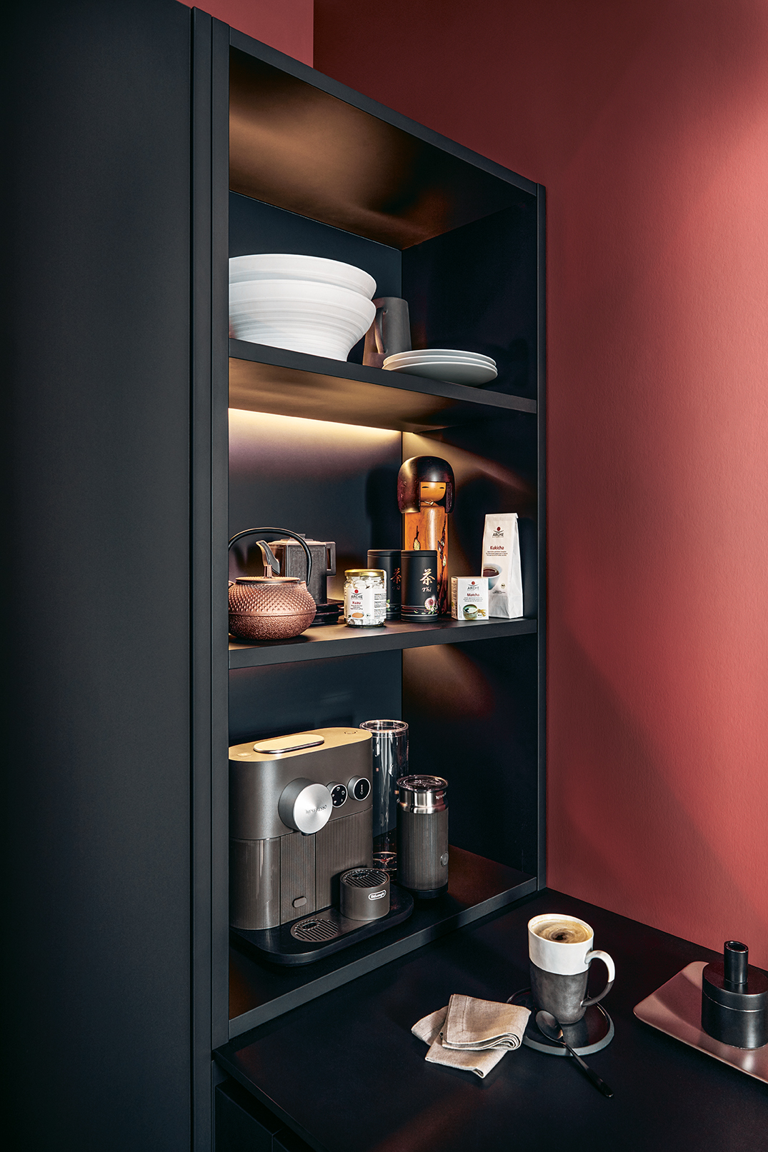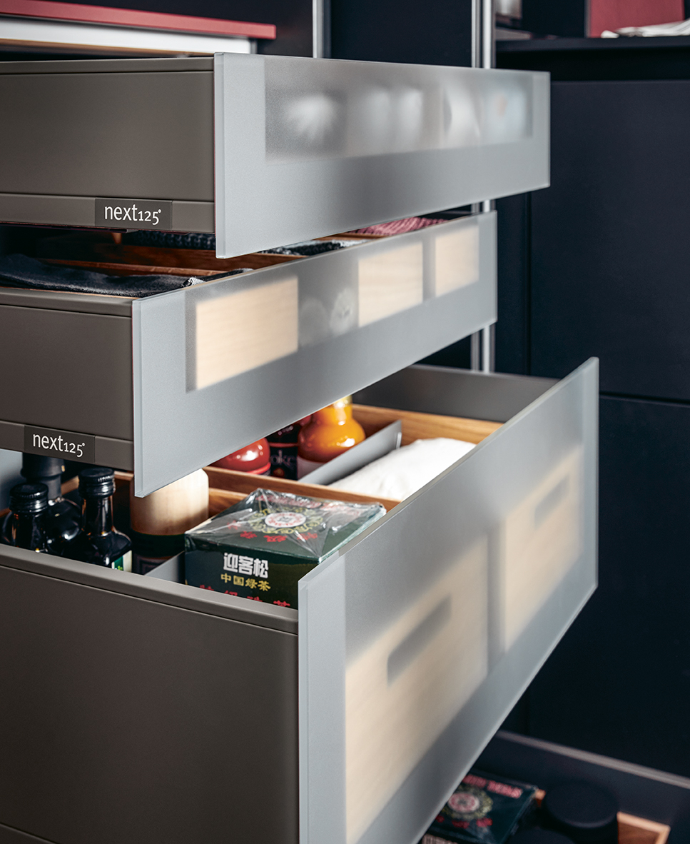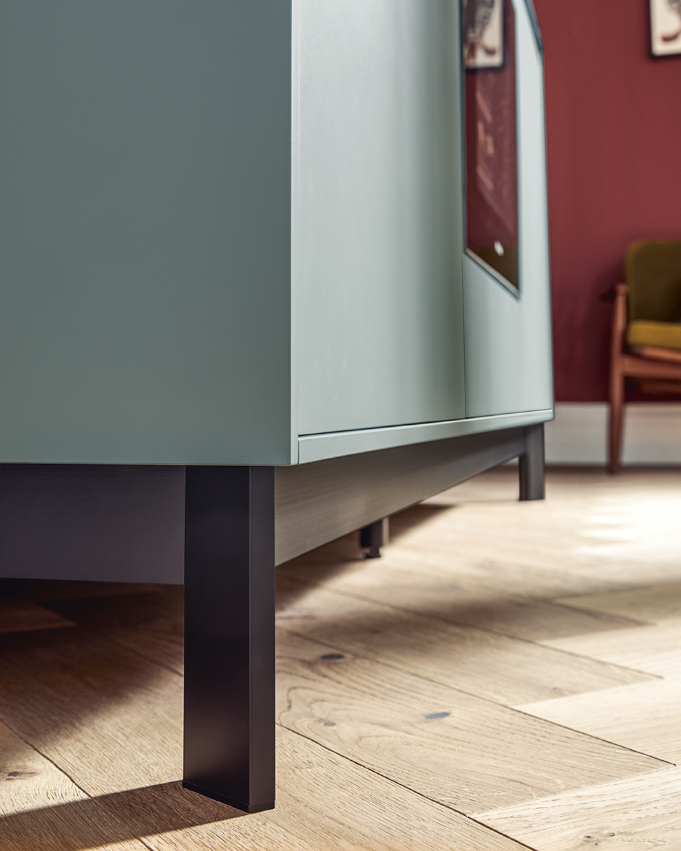 Kuchynské linky za ňou v indickej červenej dávajú vďaka tlmeným farbám odvážny akcent. Po zatvorení dvierok Pocket systému tvoria police na knihy v jedálenskej časti a multifunkčná jednotka v predsieni harmonický celok s hromadami úložného priestoru.