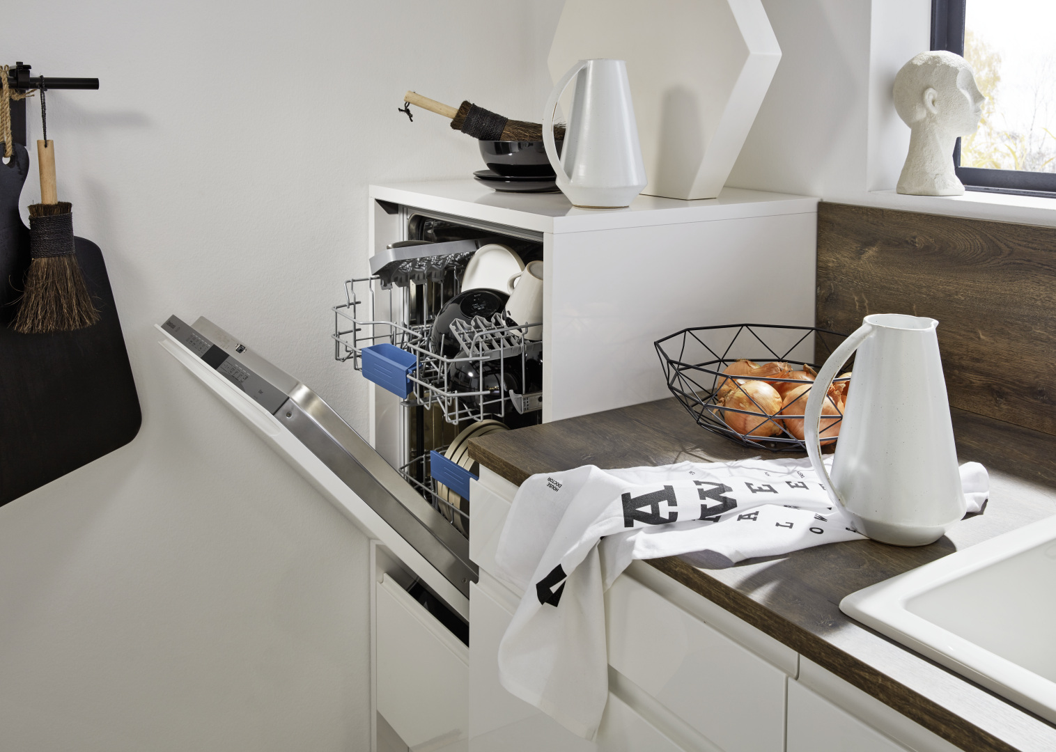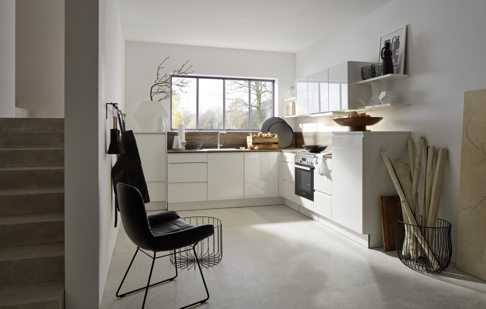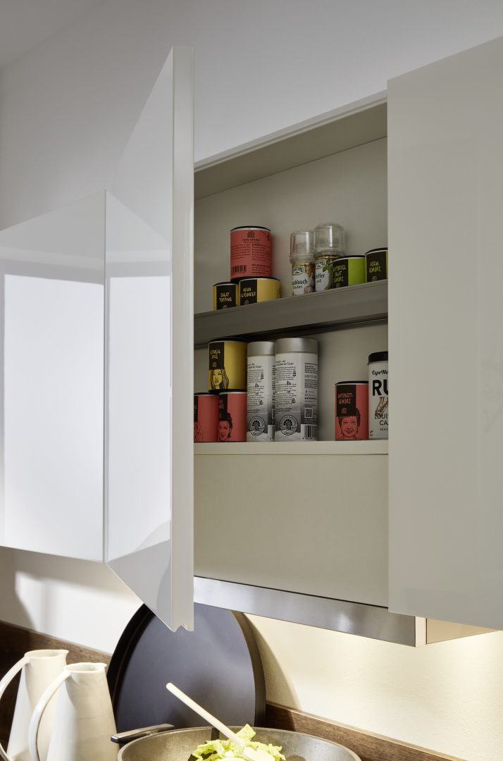 Napriek svojim kompaktným rozmerom ponúka táto kuchyňa pocit veľkorysého priestoru. Okrem toho, že sa upustilo od klasických úchytiek, k tomu prispieva aj to, že sa nepočítalo s bočnými a prístrojovými skrinkami do výšky stropu.