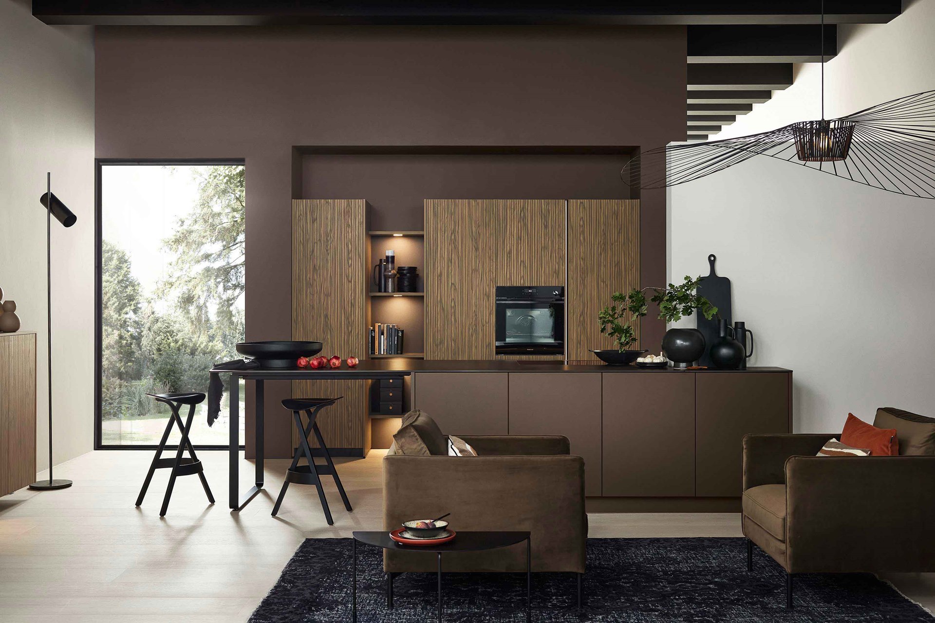 S týmto plánovaním je dekor na vysokých skrinkách a príborníku harmonicky prezentovaný. Kuchynský ostrovček v MatrixArt 800 je diskrétne decentný, pretože so SOFT LACK v tlmenej sépiovohnedej jemne matnej farbe je ideálnym náprotivkom k nezvyčajnej prednej strane ARTLINE.