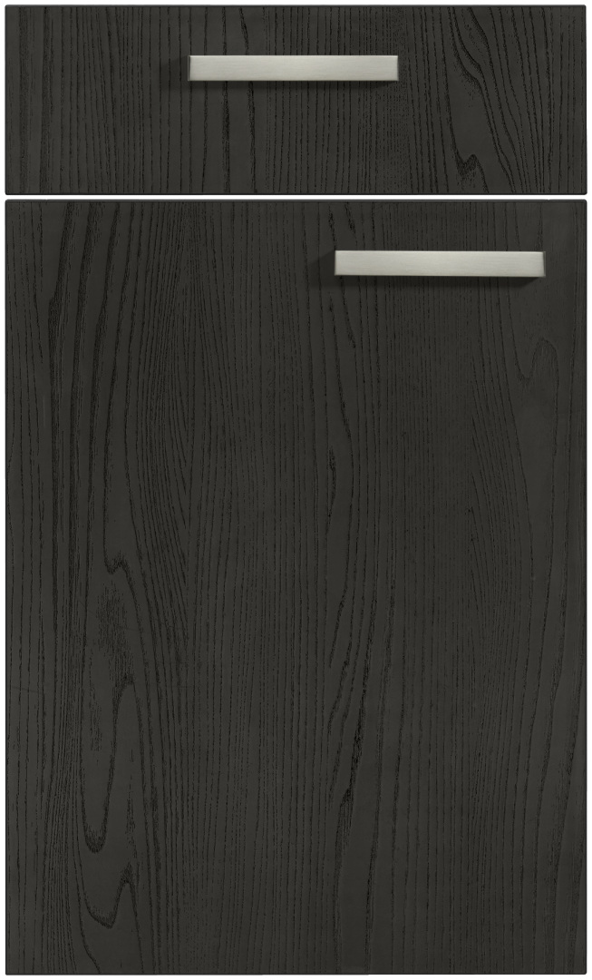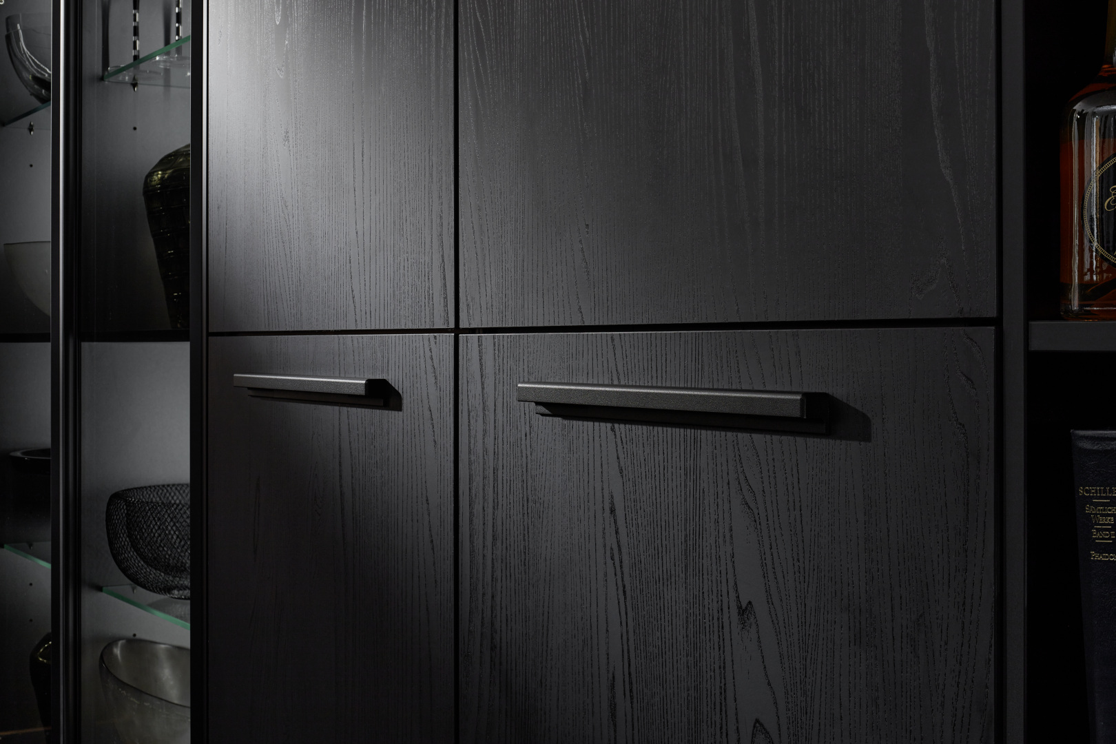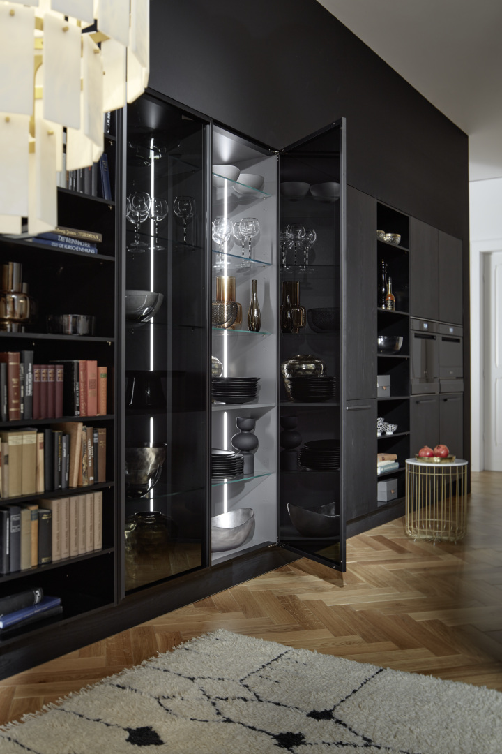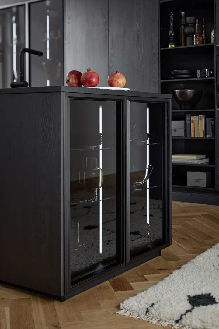 Nový MANHATTAN dub nero vytvára harmonickú kombináciu príjemnej útulnosti a nadčasovej elegancie vďaka výraznej povrchovej štruktúre, ktorá sa v závislosti od dopadu svetla mení z tmavo čiernej na jemne šedú. Čierne elektrické spotrebiče, presklené skrinky s čierno eloxovanými hliníkovými rámami a čierno tónovaným sklom, čierna pracovná doska aj čierny drez so zodpovedajúcou batériou dodávajú tejto kuchyni mimoriadne elegantný vzhľad.