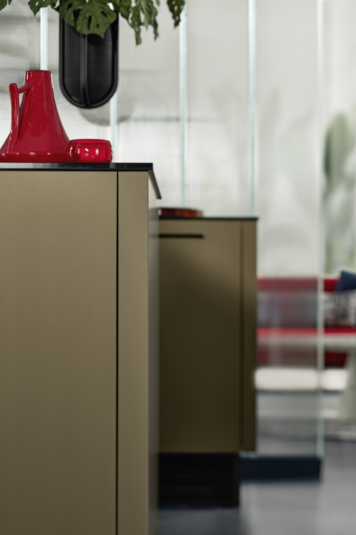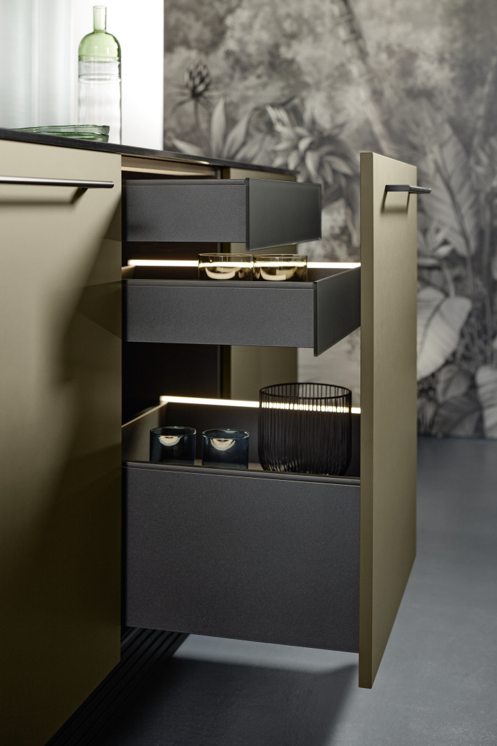 Bočné obklady z rovnakého materiálu ako predná časť prinášajú moderný šmrnc na ukončenie konca radu skriniek a pre ostrovčeky. Nolteneo vám tak umožní vytvoriť mimoriadne kvalitný a zároveň puristický, dokonale vyvážený vzhľad. Ďalšou charakteristickou črtou je podpera sokla nolteneo z čierneho hliníka, vďaka ktorej sa rady skriniek a ostrovčeky akoby vznášajú. Podpera sokla je dostupná vo výške 170 alebo 300 mm.
