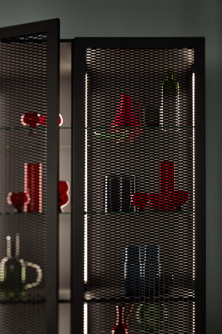Predná strana neoGRID je skutočne jedinečná a predstavuje výrazný dizajnový prvok. Táto inak puristická kuchyňa využíva hliníkový rám s ťahokovom v čiernej farbe na vytvorenie sklenenej vitríny, vďaka čomu je nielen jedným z prvkov kuchyne, ale aj štýlovým kusom nábytku.