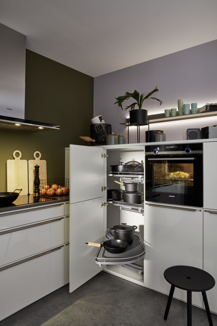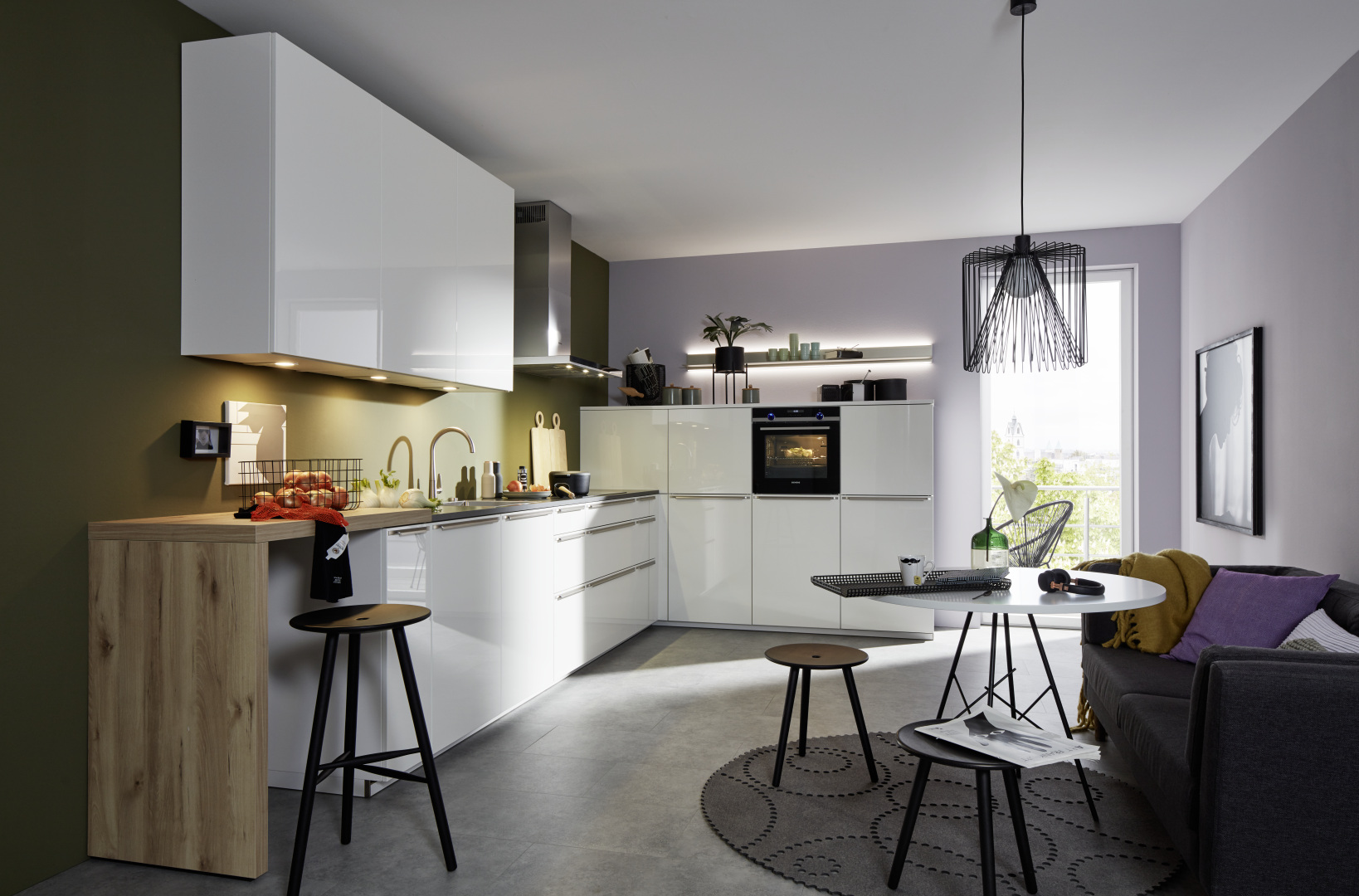 Okrem vášho nového obľúbeného miesta na raňajky a občerstvenie má táto kuchyňa aj rovné línie, dômyselný koncept miestnosti a detaily, ktoré si zamilujete. Lesklý lak a buk vytvárajú úžasný kontrast.
