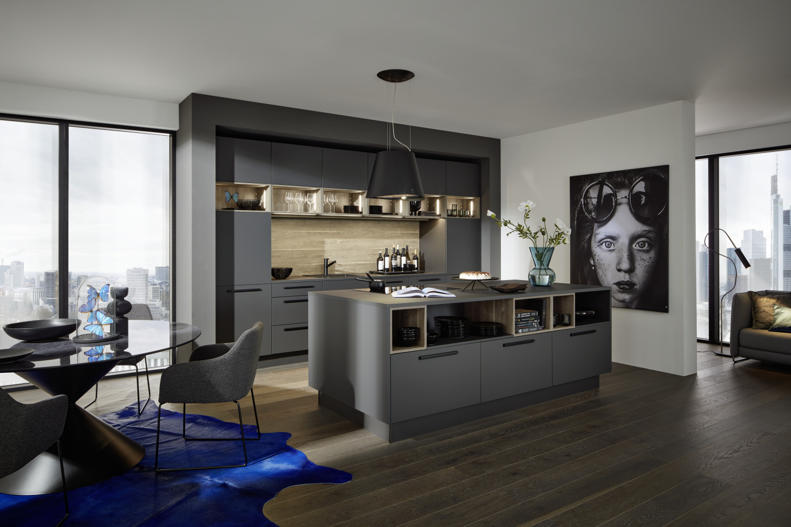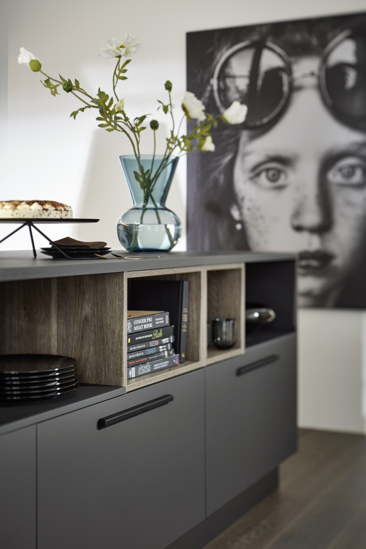 Tmavosivé čelá, čierne matné akcenty v kombinácii so zodpovedajúcim dekórom dreva – klasika, a napriek tomu úplne v trende. PLUS ako grafit soft matný s povrchom Antifingerprint tvorí spolu s dubom strieborný grafit bezkonkurenčnú kombináciu z hľadiska útulnosti.