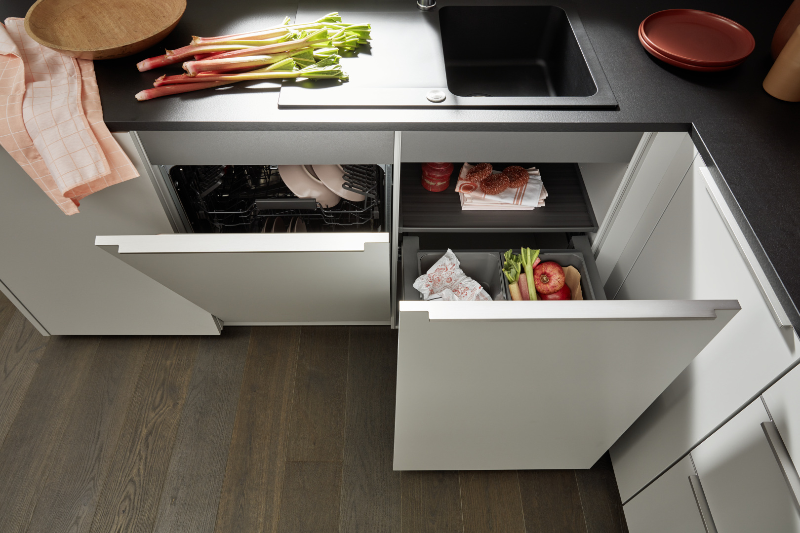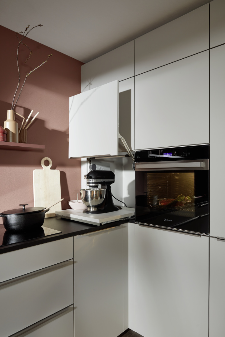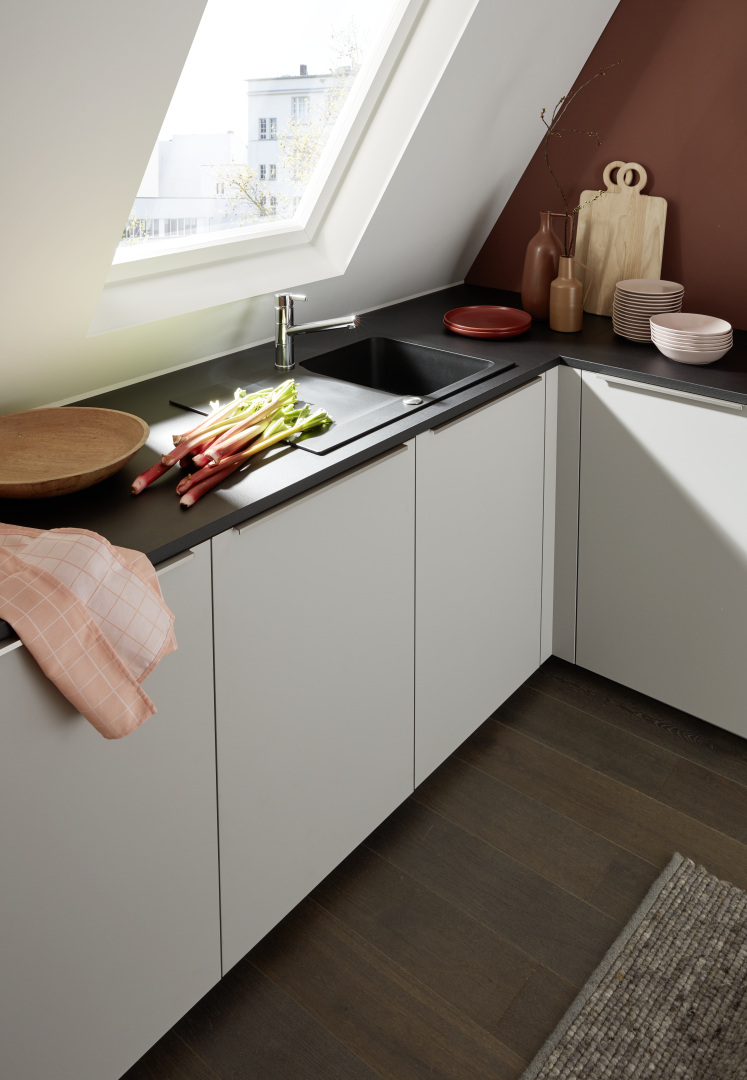 Malá miestnosť so šikmou strechou? S Matrix 900 žiadny problém! Náš praktický rozmer korpusu 90 cm vám poskytne maximálny úložný priestor aj v menšej kuchyni. Svetlé čelo PLUS platinovo šedá soft matná je pôvabne striedme a harmonicky zapadá do designu miestnosti.