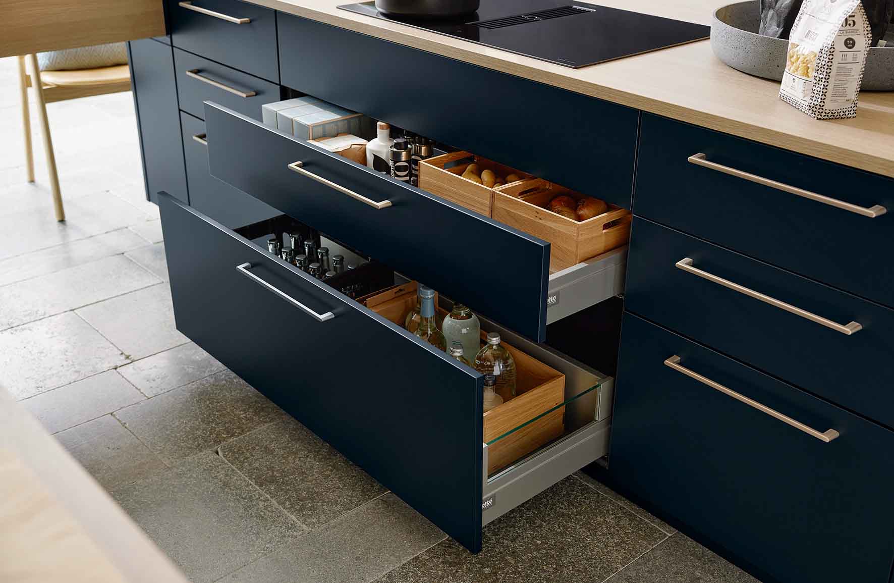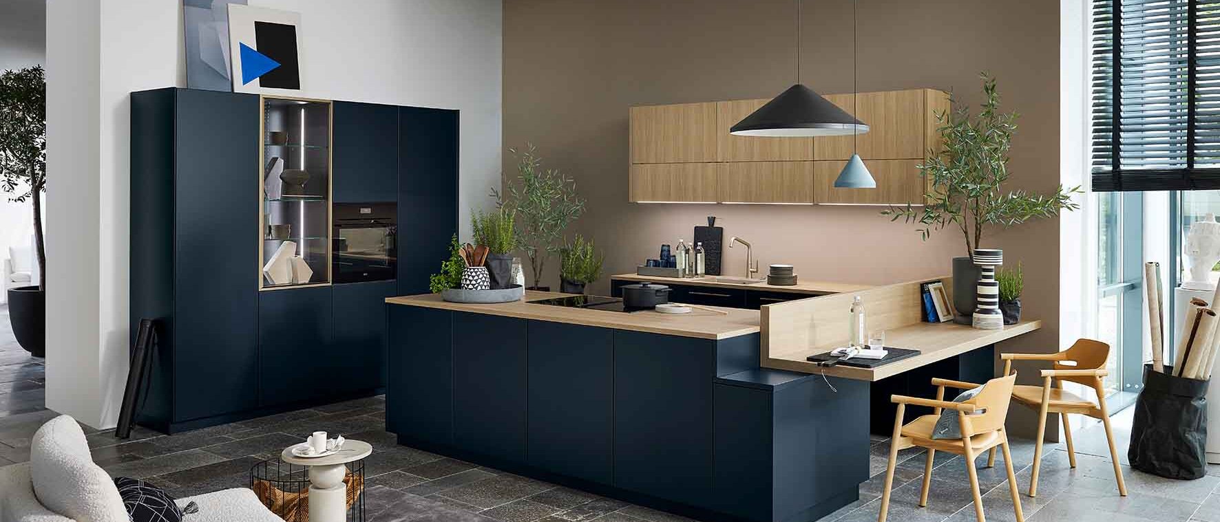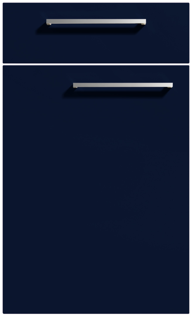 V kombinácii s SOFT LACK v sýtomodrej farbe vytvára jedinečný vzhľad, ktorý zvýrazňuje elegantné akcenty. Hodvábny povrch poskytuje príjemný pocit vysokej kvality. Špeciálny vrchol: fazetované panely na vysokých skrinkách, ktoré dodávajú dizajnu štýlový rám.