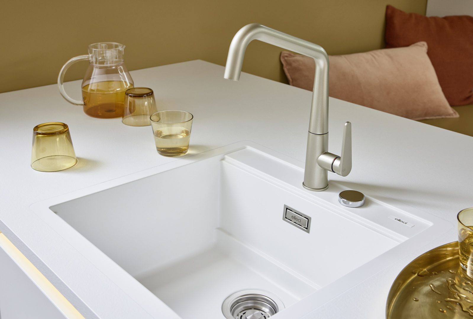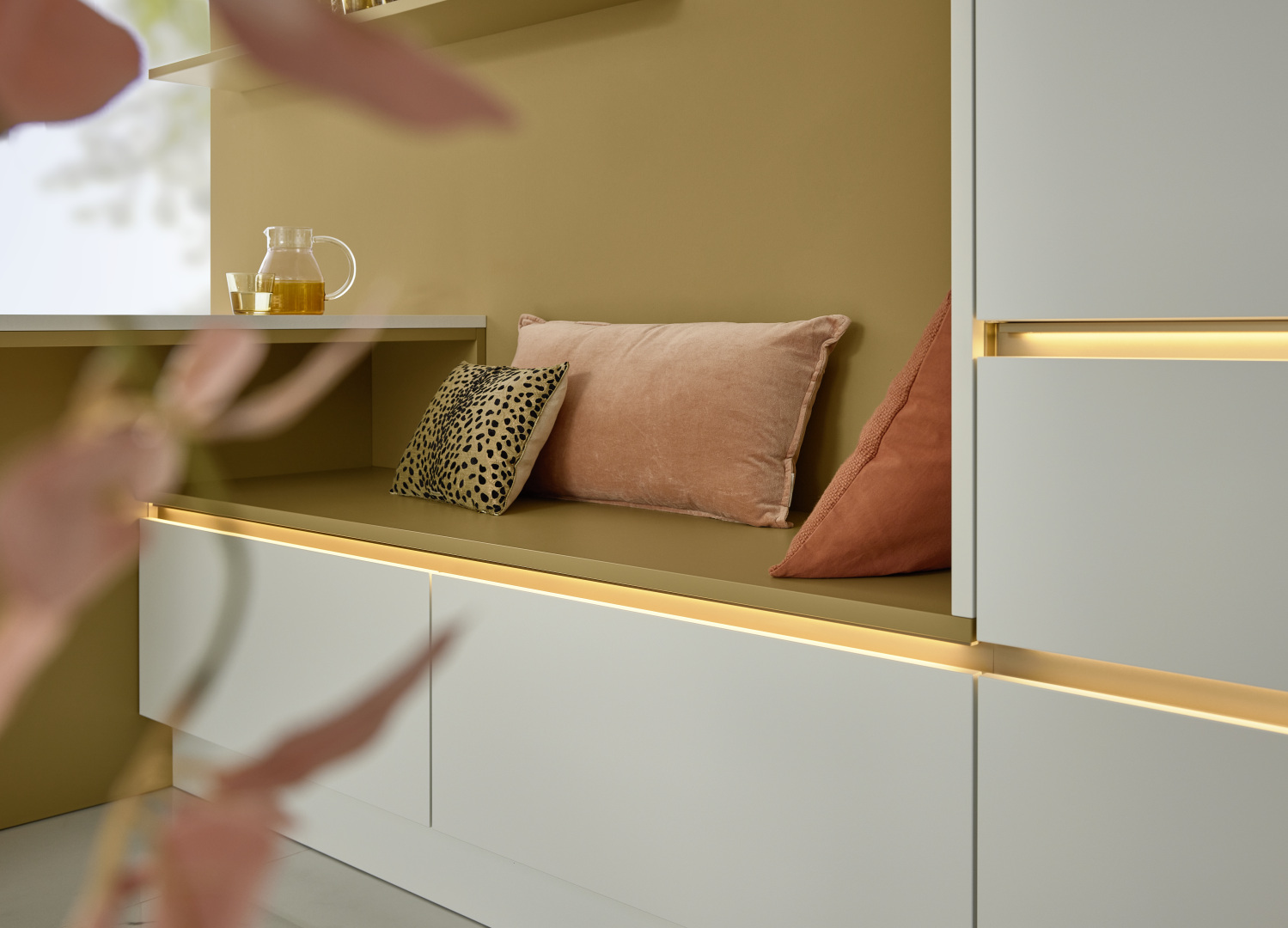 V tomto SOFT LACK zažiari caramel a biela soft matná ako harmonické duo. Caramel, jedna farba z celkom 20 farieb z koncepcie matných lakov, vyžaruje teplo a ľahkosť. Biela k tomu pridáva estetický kontrast. Čelá vo farbe karamelu vytvárajú bezšvové spojenie s osvetlenými úchytkami vo farbe manganbronz a kuchynské čelo bez úchytiek prepožičia vášmu priestoru moderný a minimalistický dizajn. Tiež útulné rohy tu neprídu skrátka: Integrovaná možnosť na sedenie nabáda na posedenie a ešte skrýva ďalší úložný priestor. Spojíte tak súčasne estetiku, funkčnosť a útulnosť v jednej kuchyni.