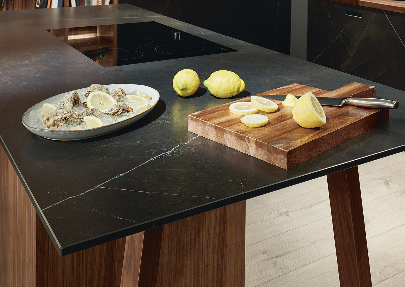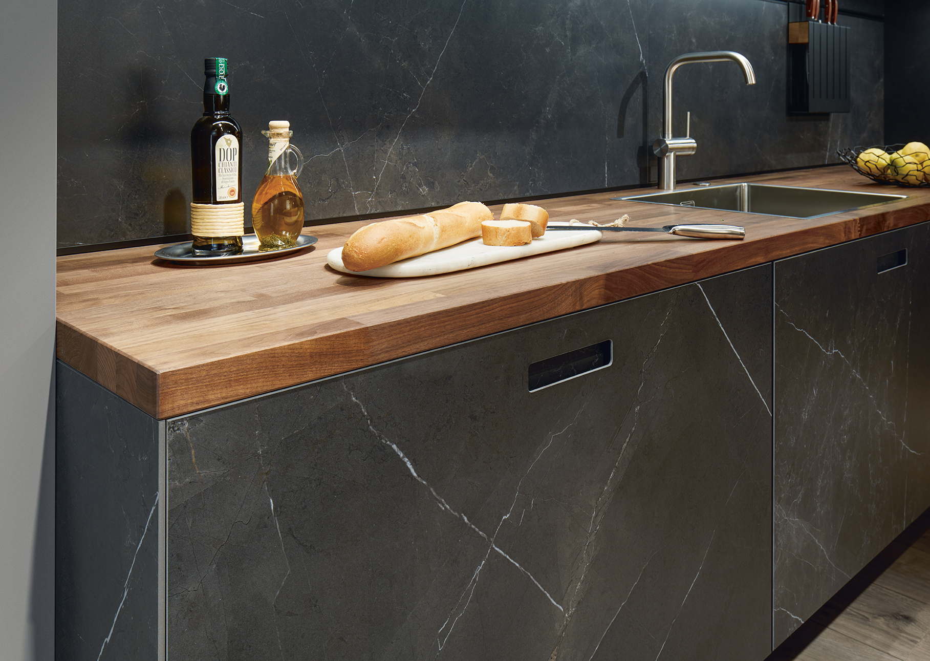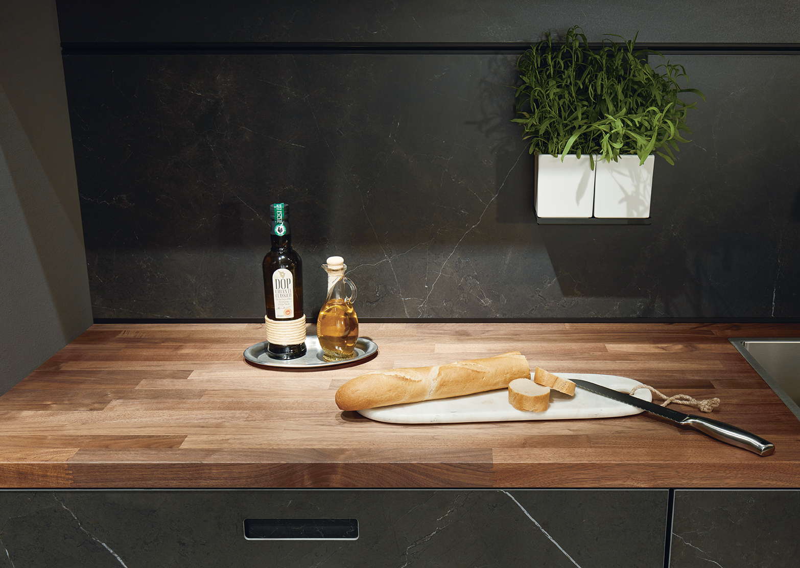 Materiály – Predná strana z keramického mramoru s nero efektom a prírodný orech v kombinácii s pracovnou doskou Systemo z prírodného orecha.