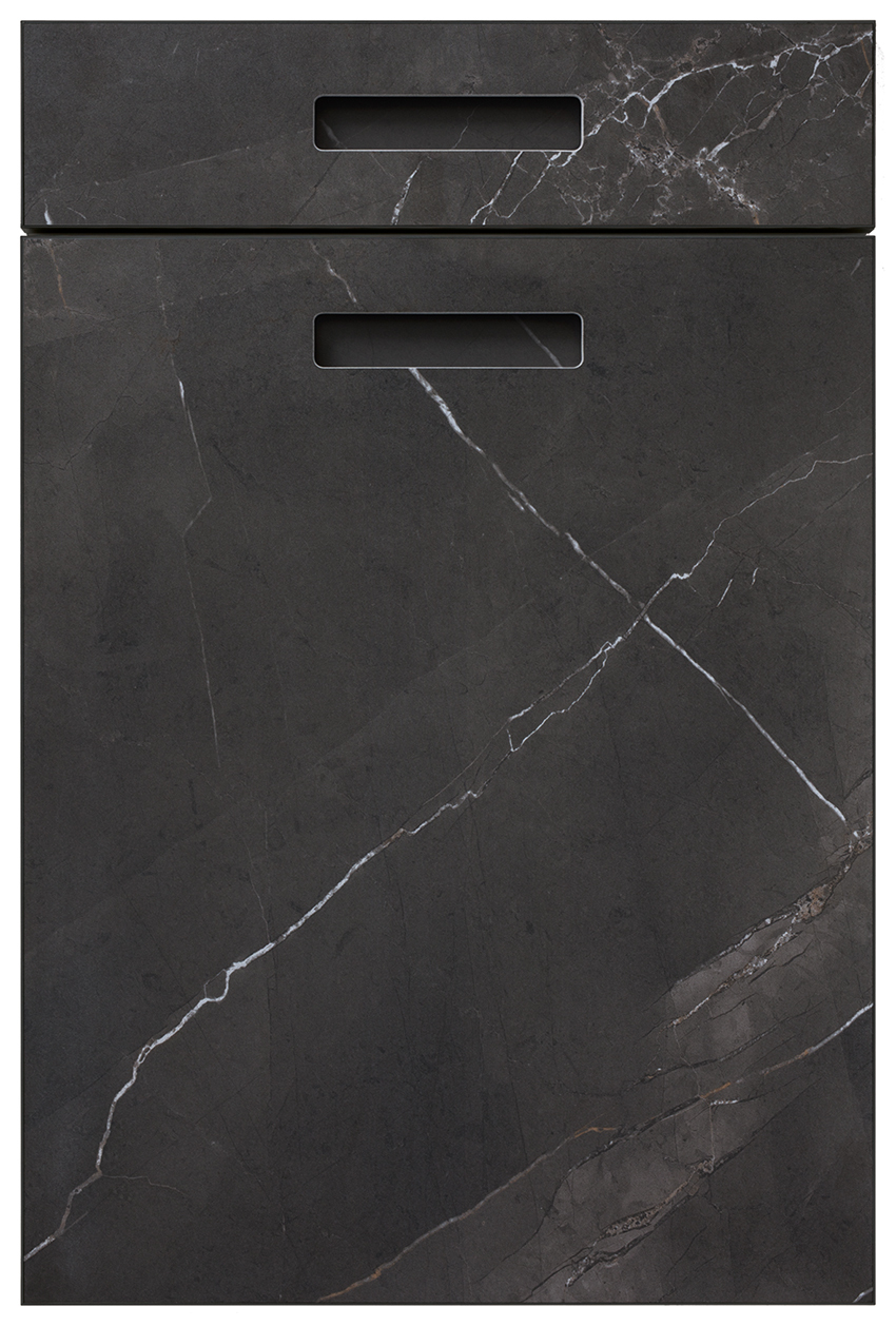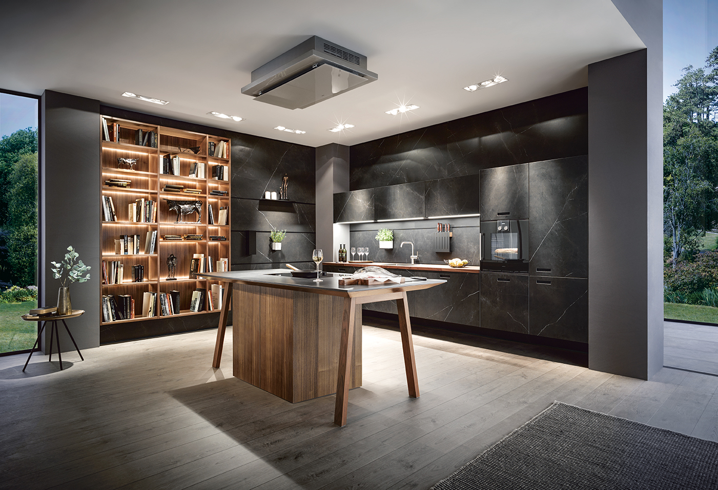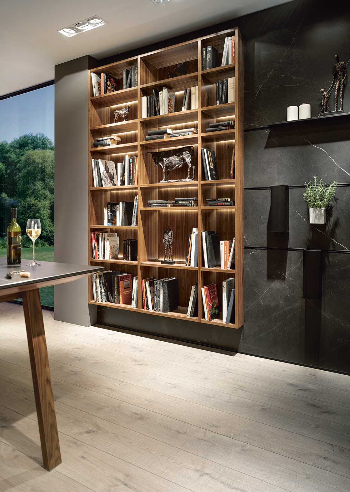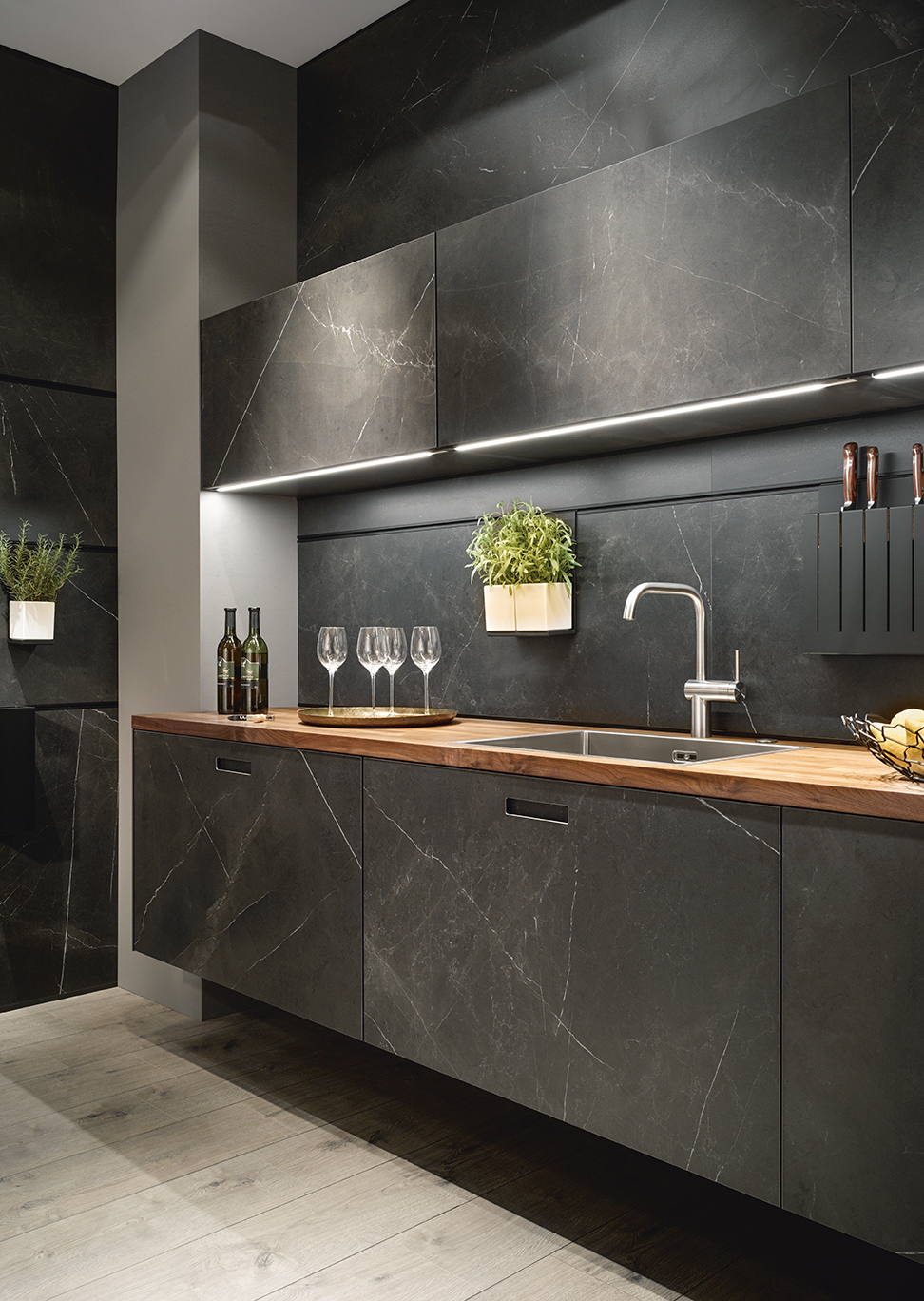 Materiály – Predná strana z keramického mramoru s nero efektom a prírodný orech v kombinácii s pracovnou doskou Systemo z prírodného orecha.
