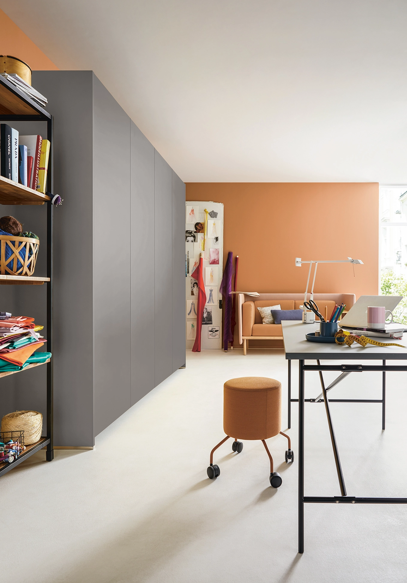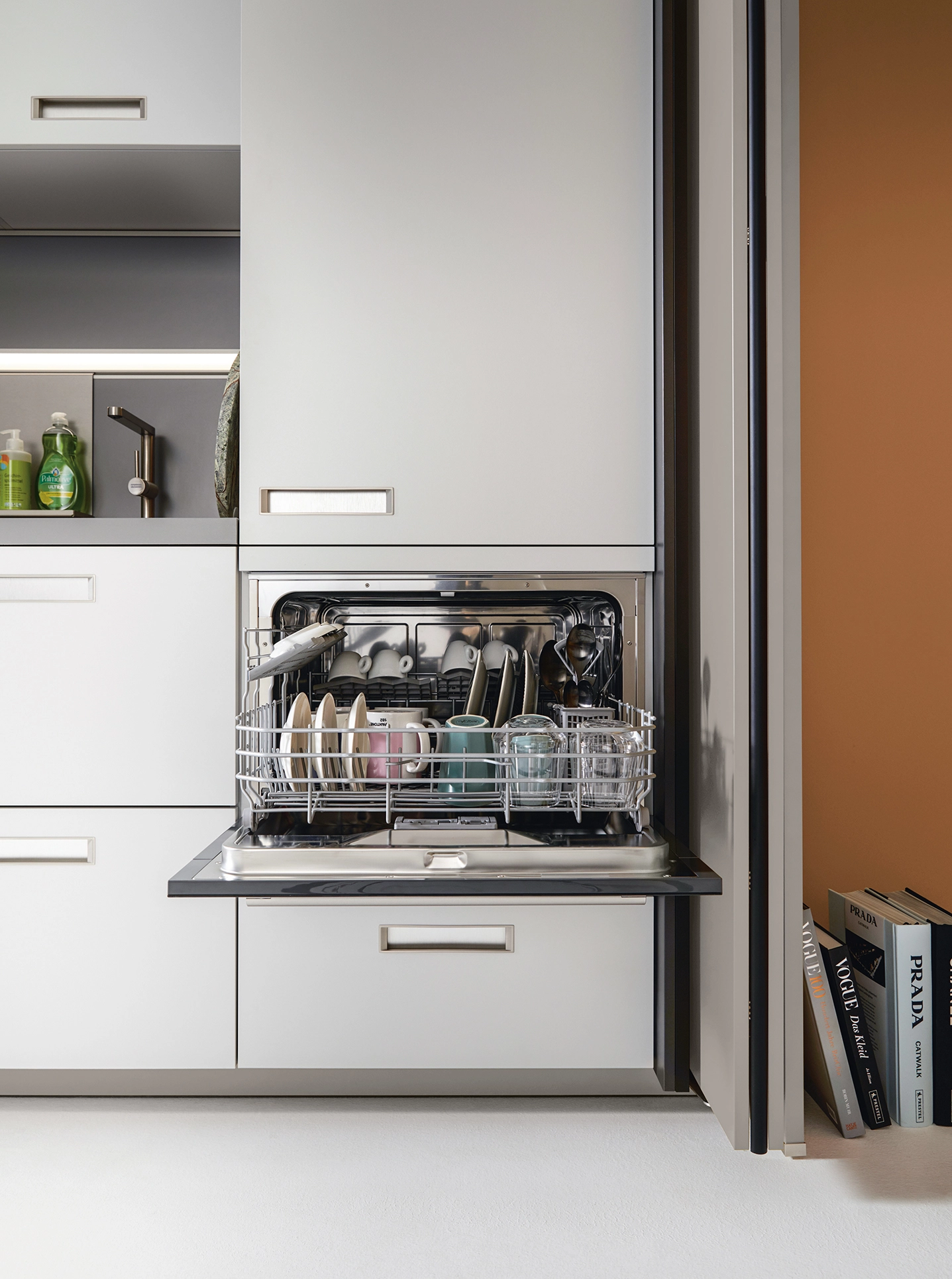 Za výsuvnými dvierkami je dostatok miesta na schovanie kuchynských spotrebičov a iných vecí a vďaka osvetlenému zápustnému profilu na bylinky a iné, nezostane nevyužitý ani výklenok. Všetko je optimálne skryté za výsuvnými dverami a využíva kontrastné vnútorné farby.