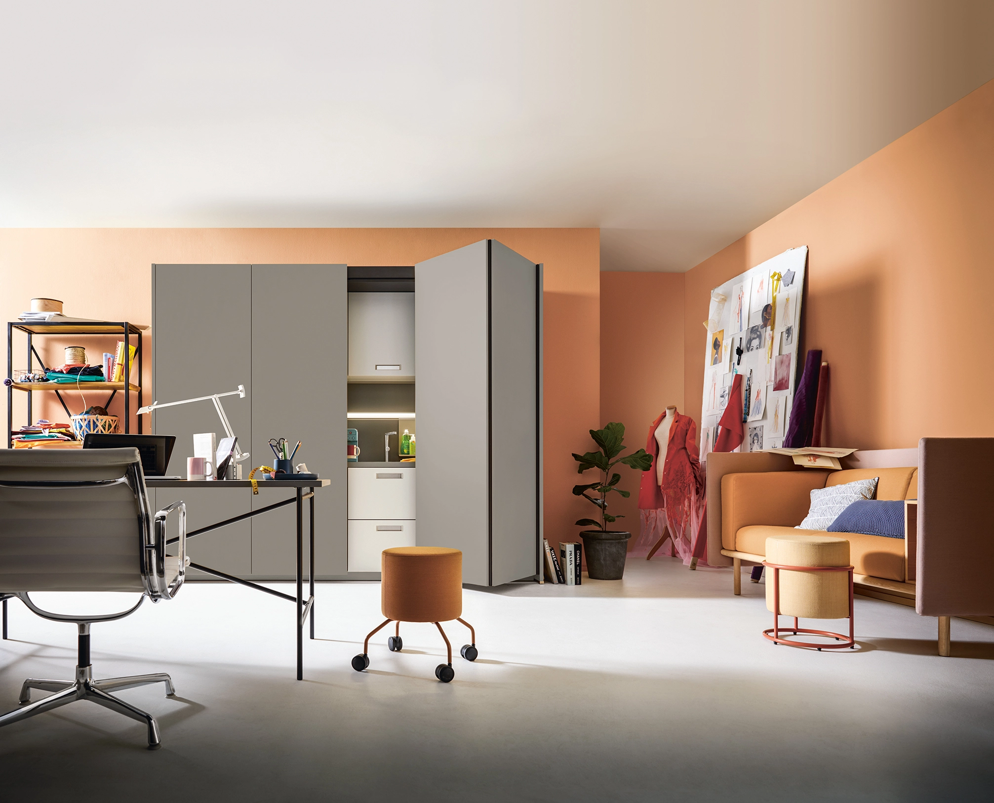 Kuchynský kút s čelami z agátovo sivého matného zamatu spája kompaktnú funkčnosť, domácku atmosféru a neobmedzené potešenie z varenia – aj v malých miestnostiach, alebo kanceláriách.