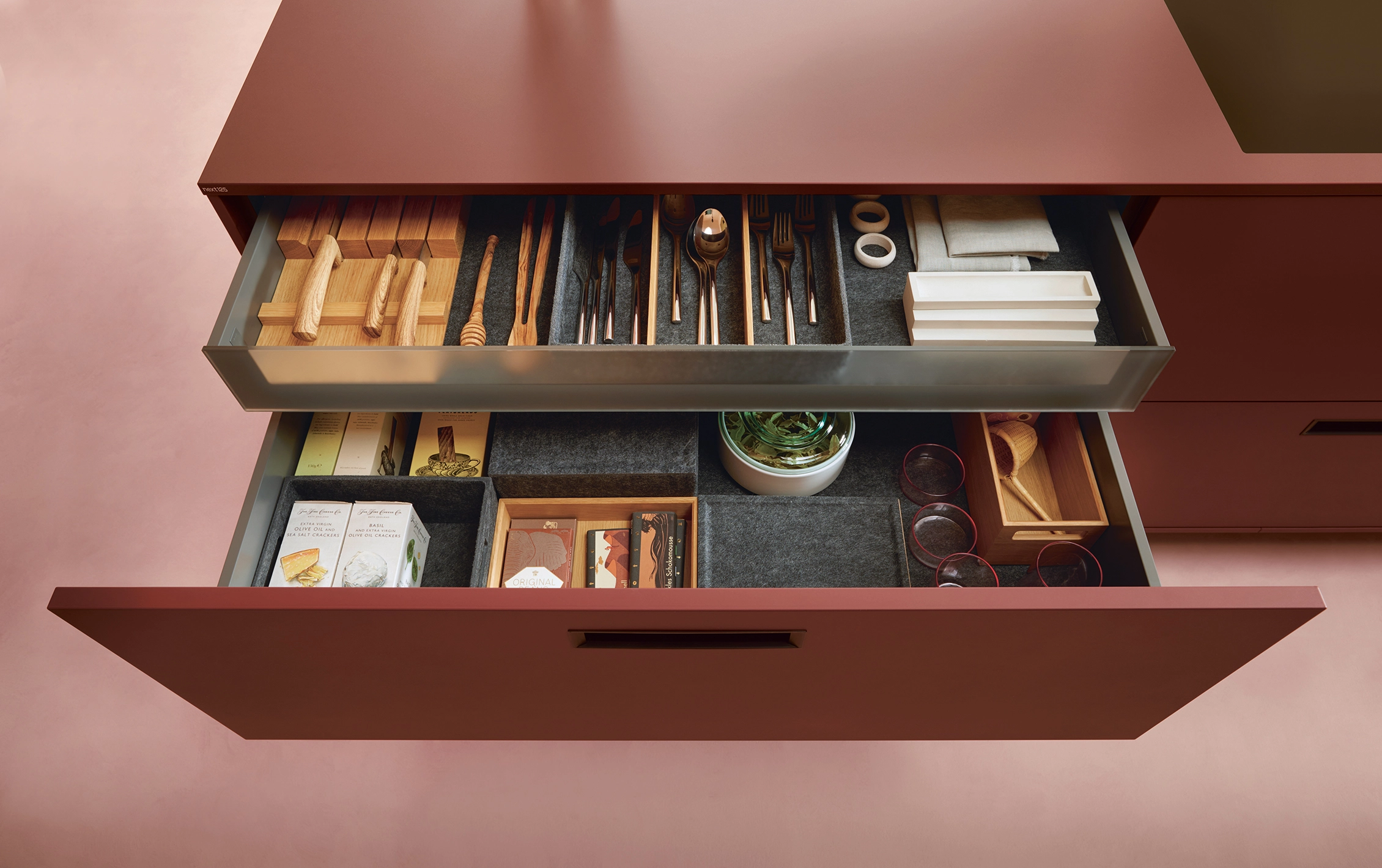 Kuchyne next125 sú plné farieb, tvarov a praktických prvkov. Najnovšia kuchyňa v našej kampani so svojou nezvyčajnou farebnou kombináciou indickej červenej, kobaltovo zelenej a olivovej žltej určite robí vizuálnu výpoveď. Za farbami sa však skrýva aj systém: každý odtieň predstavuje inú funkčnú oblasť. Minimalistické kubické tvary dávajú farbám skutočne vyniknúť. Filigránový hliníkový systémový rám v ónyxovej čiernej farbe, ktorý tvorí sotva vnímateľný jemný rám jednotky, vytvára dojem, že sa jednotka vznáša.