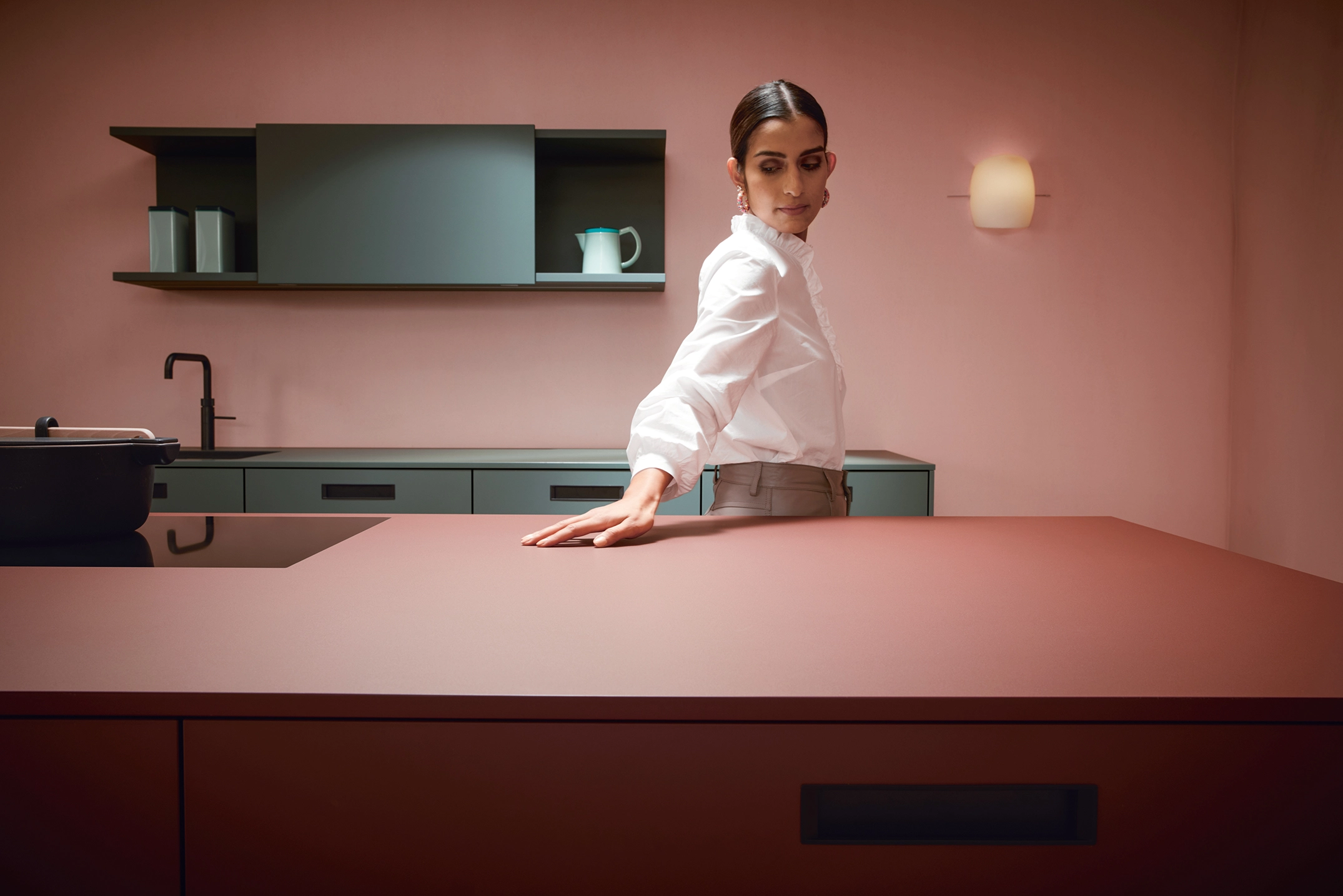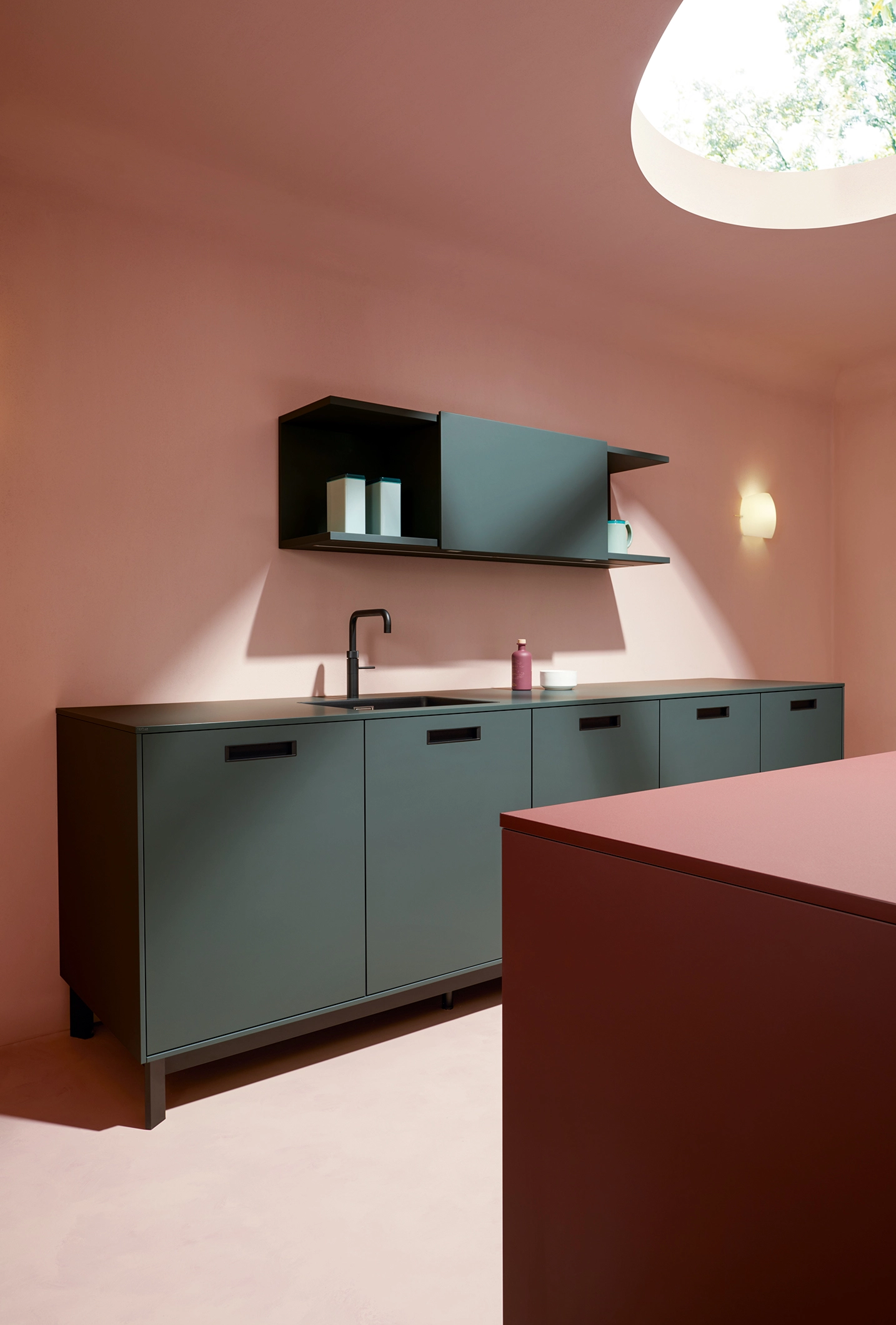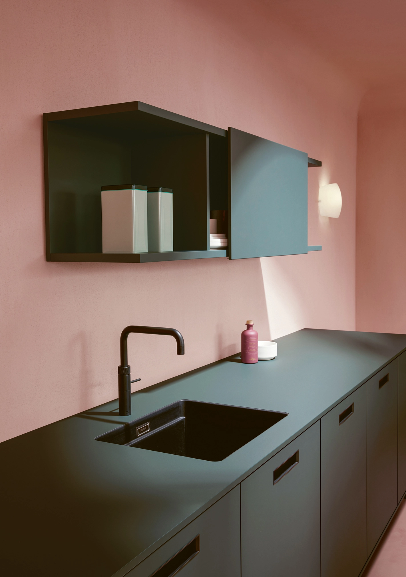 Pokiaľ ide o funkčnosť, kuchyňa splní všetky želania: systémy na čistenie vody nachádzajú svoje miesto v špeciálne navrhnutej základnej jednotke; regál s posuvnými dverami poskytuje diskrétny úložný priestor; a Flex-boxy vyrobené z tvarovaného netkaného materiálu sú zaujímavé na dotyk a ideálne na uloženie vašich najlepších príborov. Minimalistické zapustené rukoväte sa pohodlne držia a pomôžu vám udržať sa v rýchlom každodennom živote v kuchyni.