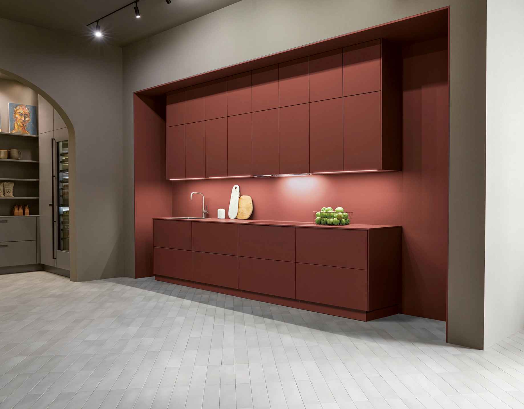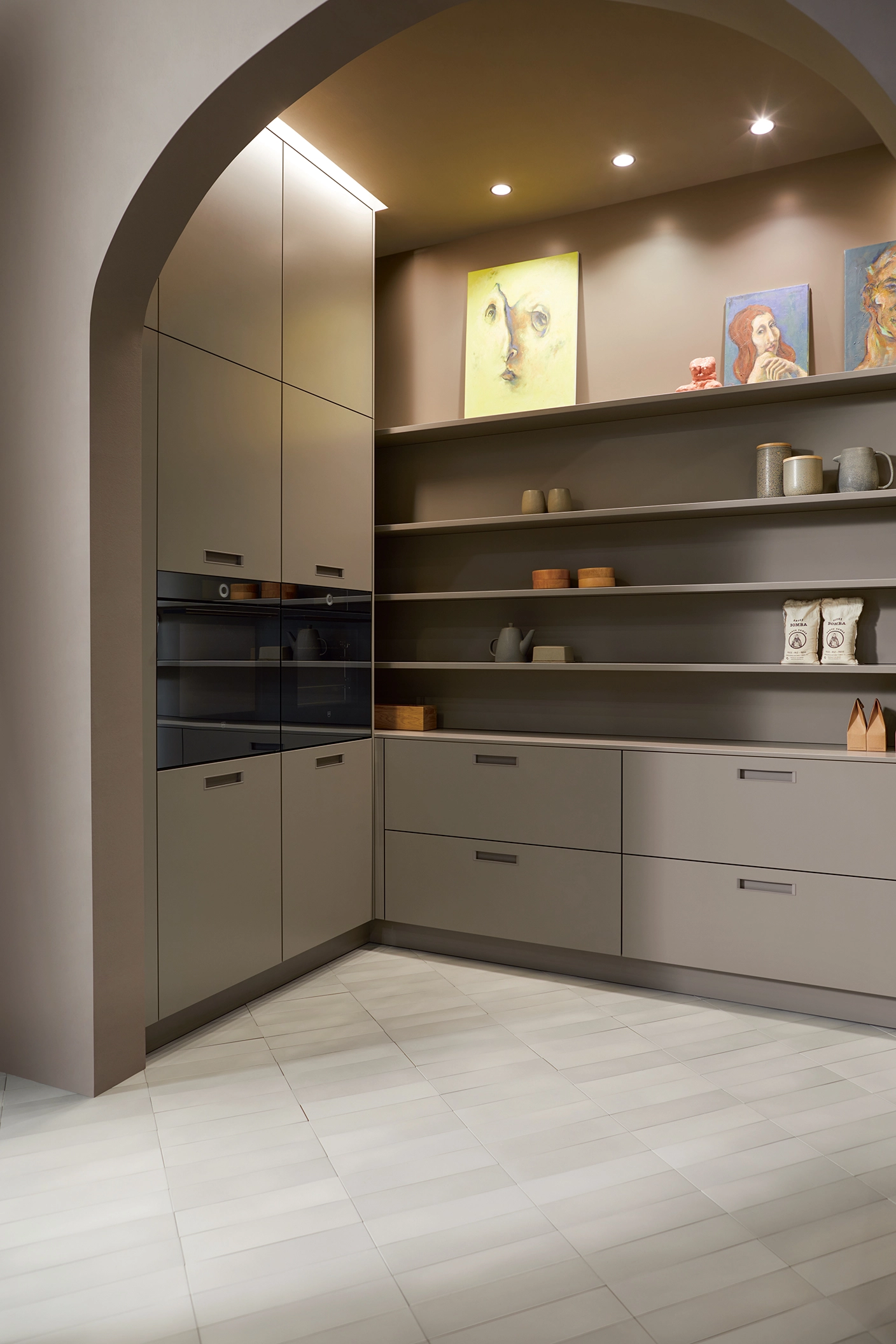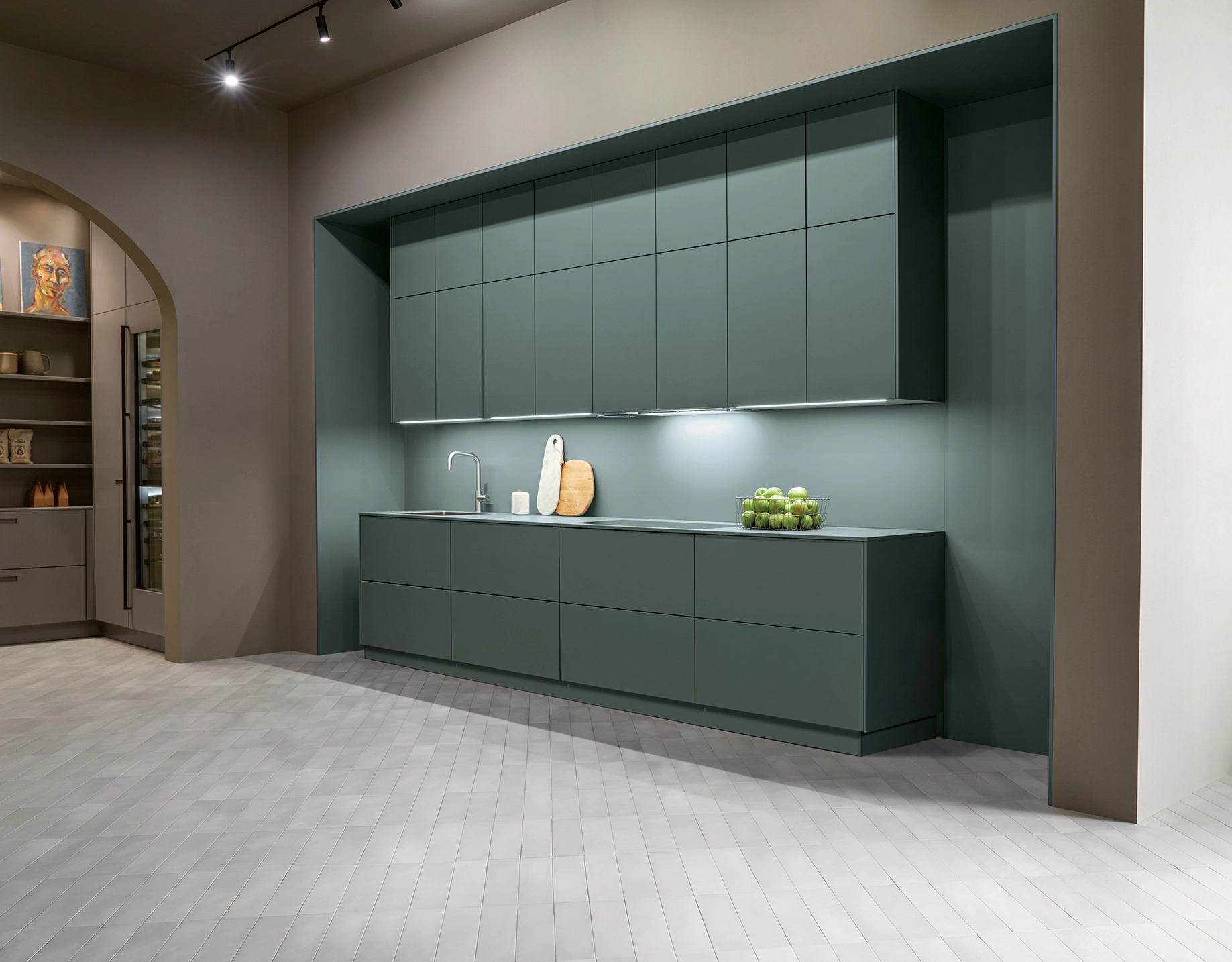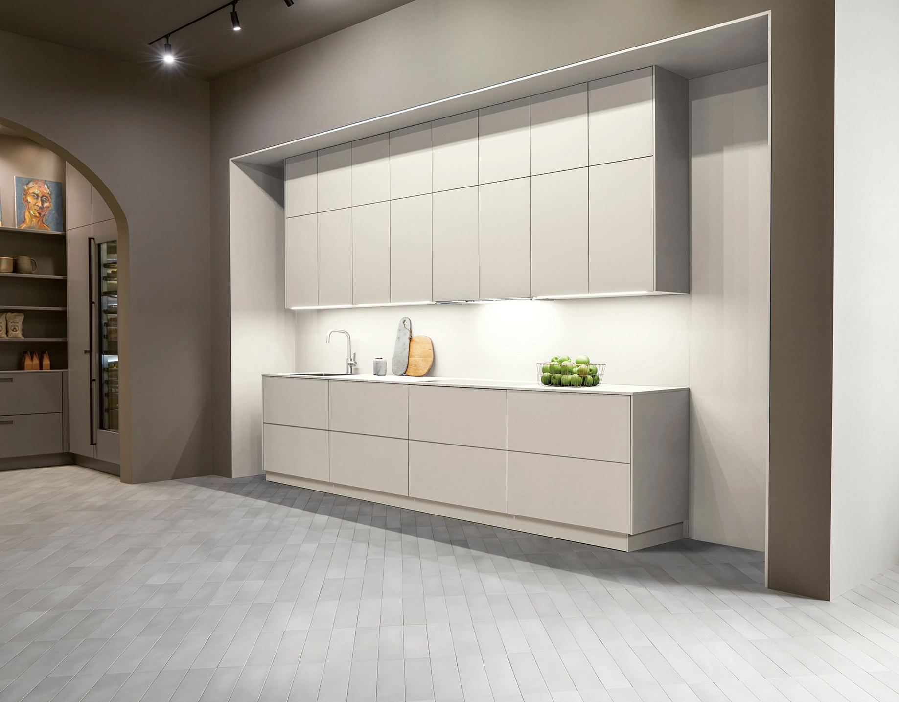 Tieto skrinky sú nenápadne umiestnené vo výklenku a napriek tomu udávajú tón miestnosti. Vysoké čelá špičkových dvierok vyžarujú pokoj. Ich jasné spoje zvýrazňujú vertikálnosť a vytvárajú atmosféru pokoja a sústredenia, pričom miestnosť pôsobí sviežo a vzdušne.