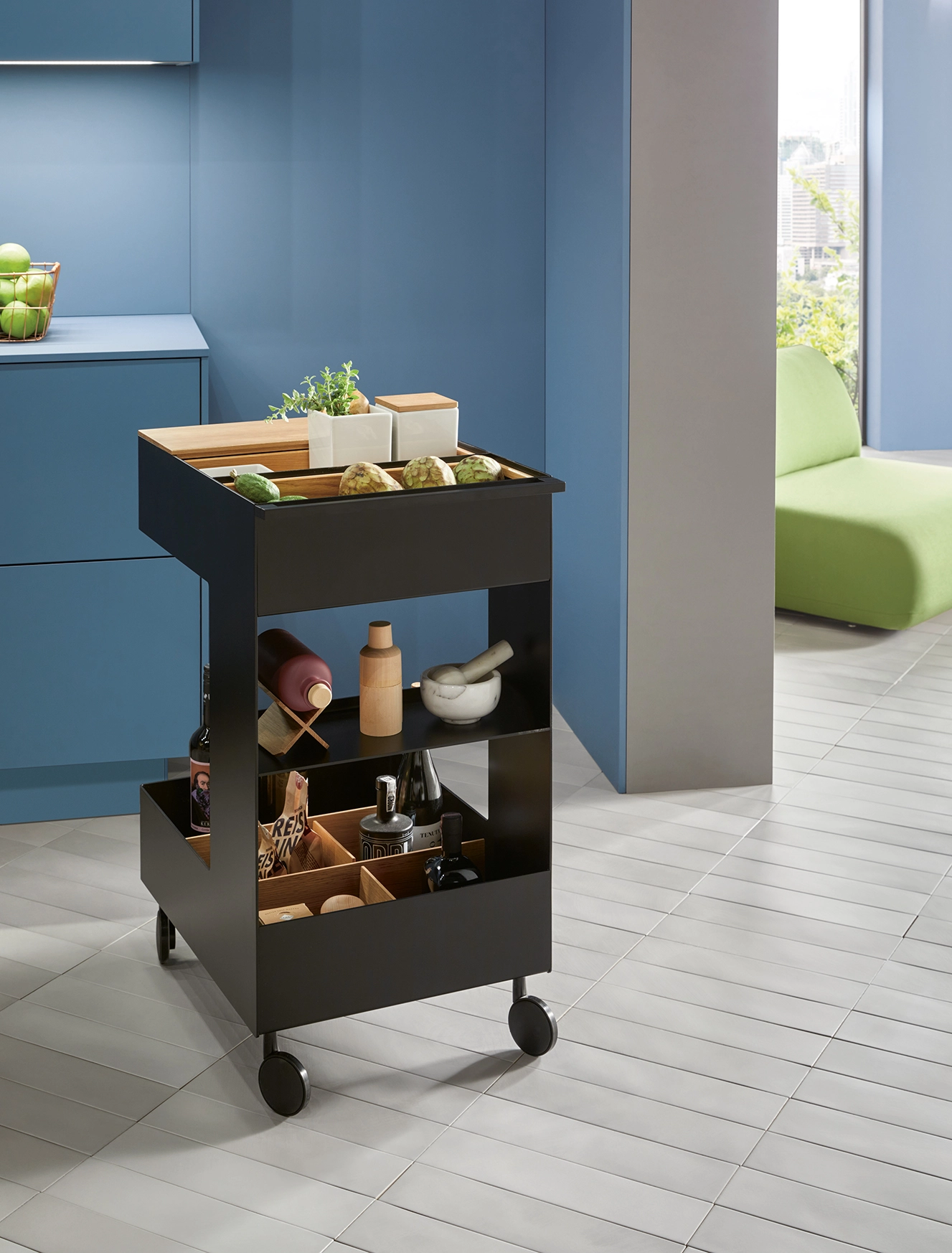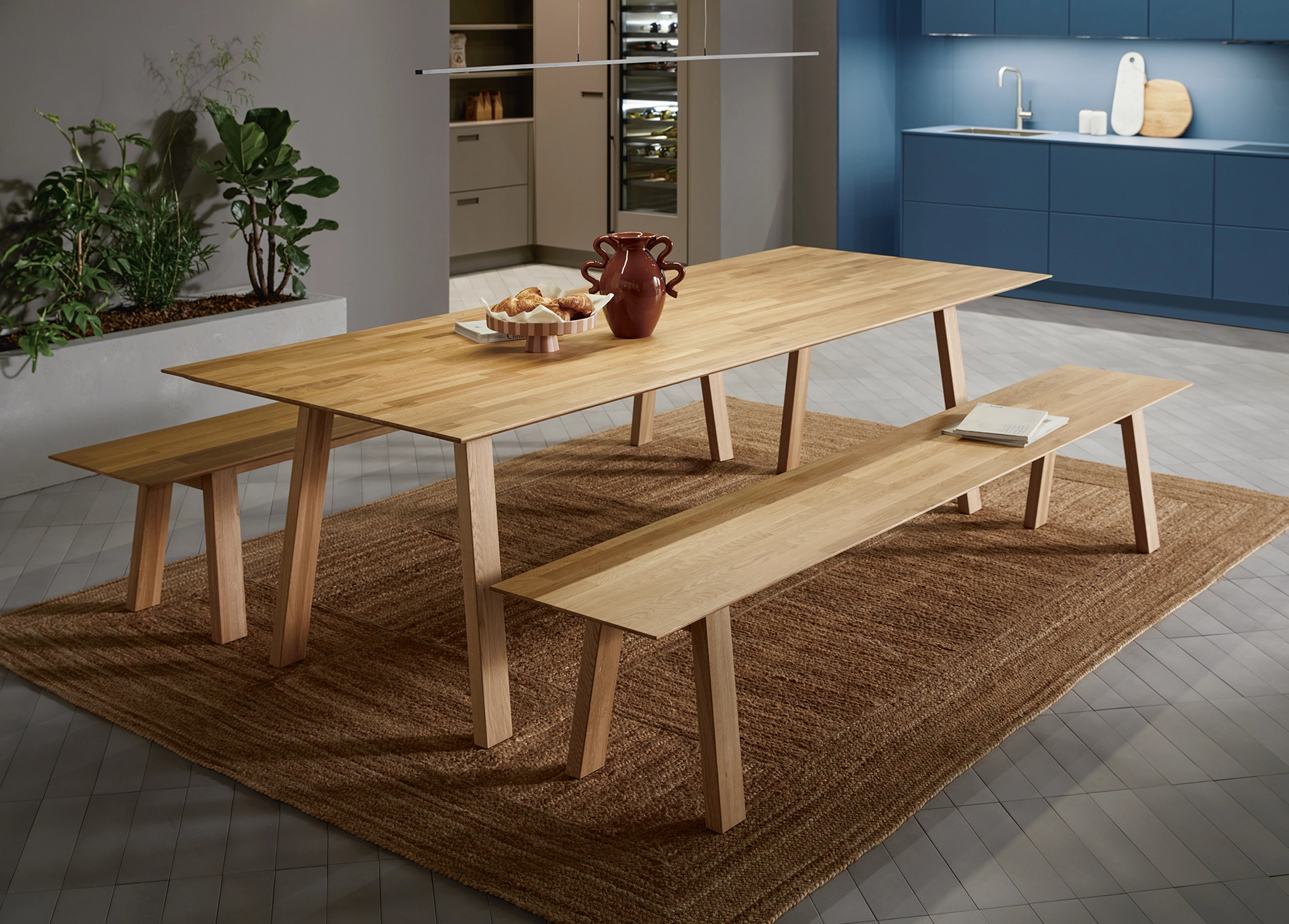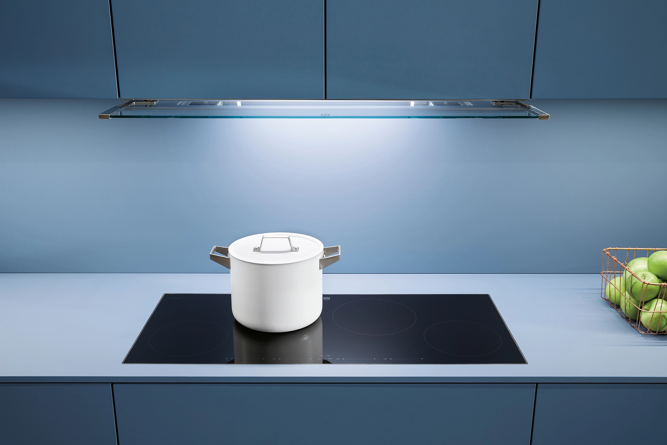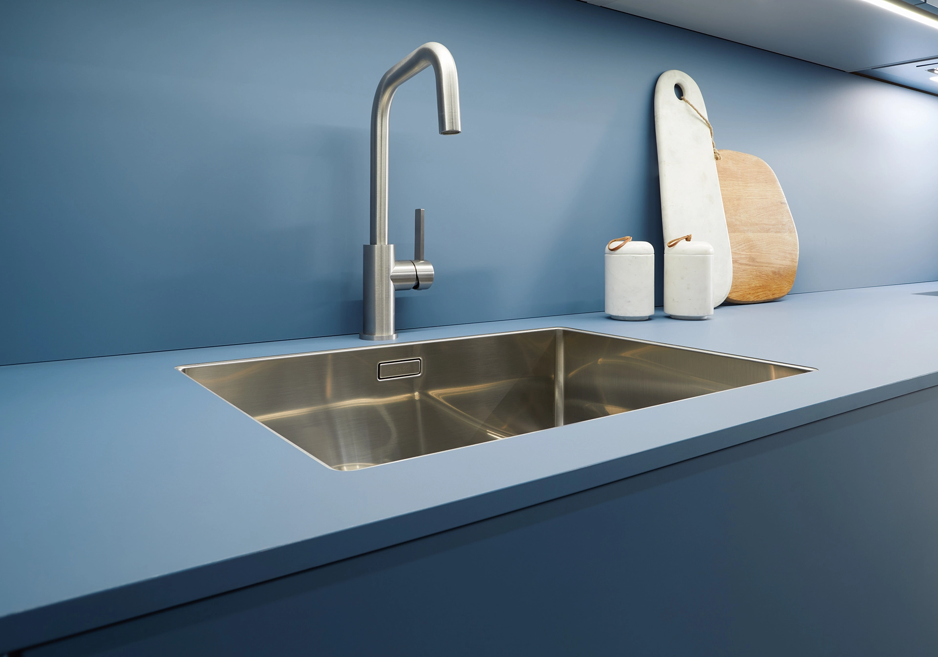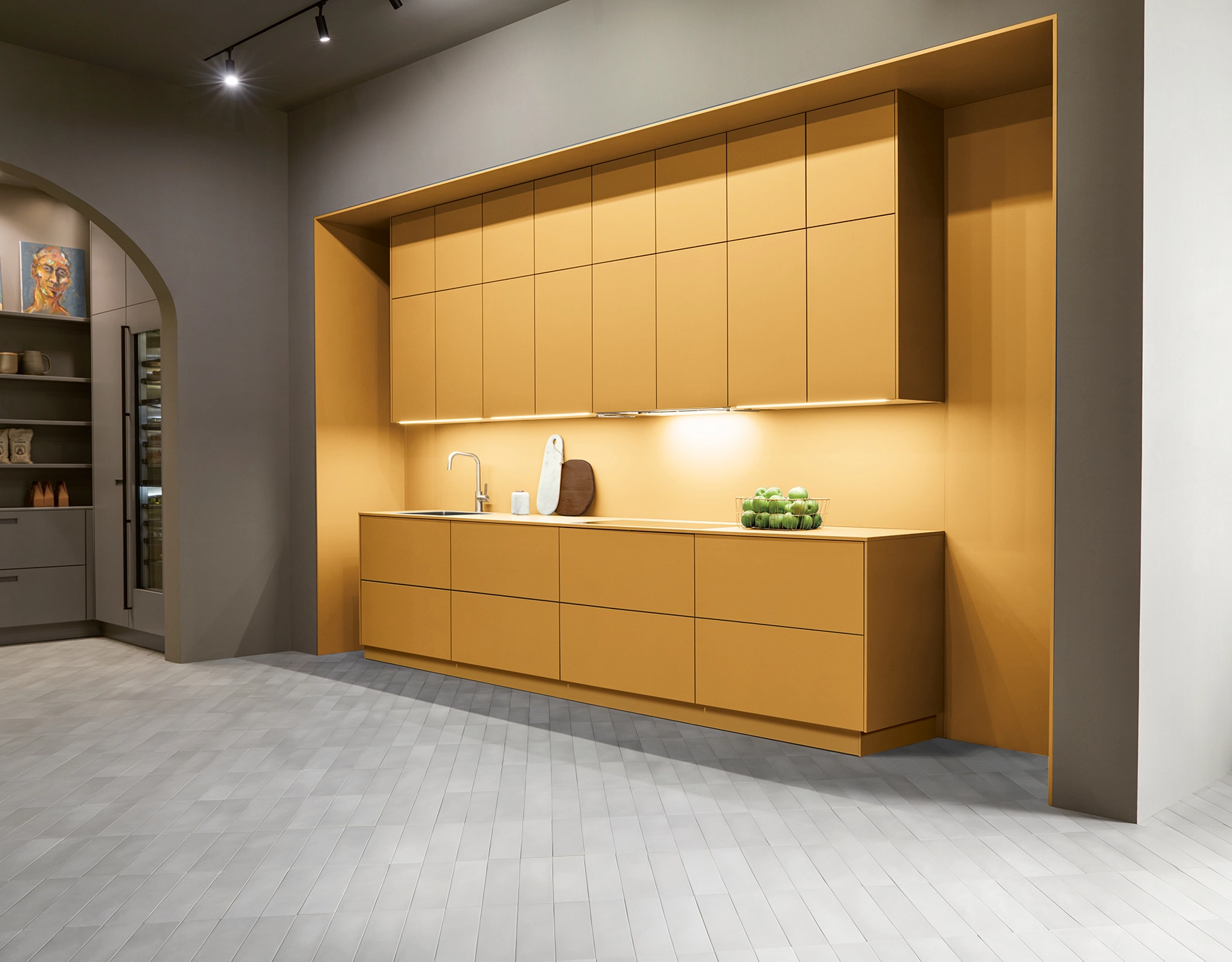 Tieto skrinky sú nenápadne umiestnené vo výklenku a napriek tomu udávajú tón miestnosti. Vysoké čelá špičkových dvierok vyžarujú pokoj. Ich jasné spoje zvýrazňujú vertikálnosť a vytvárajú atmosféru pokoja a sústredenia, pričom miestnosť pôsobí sviežo a vzdušne.