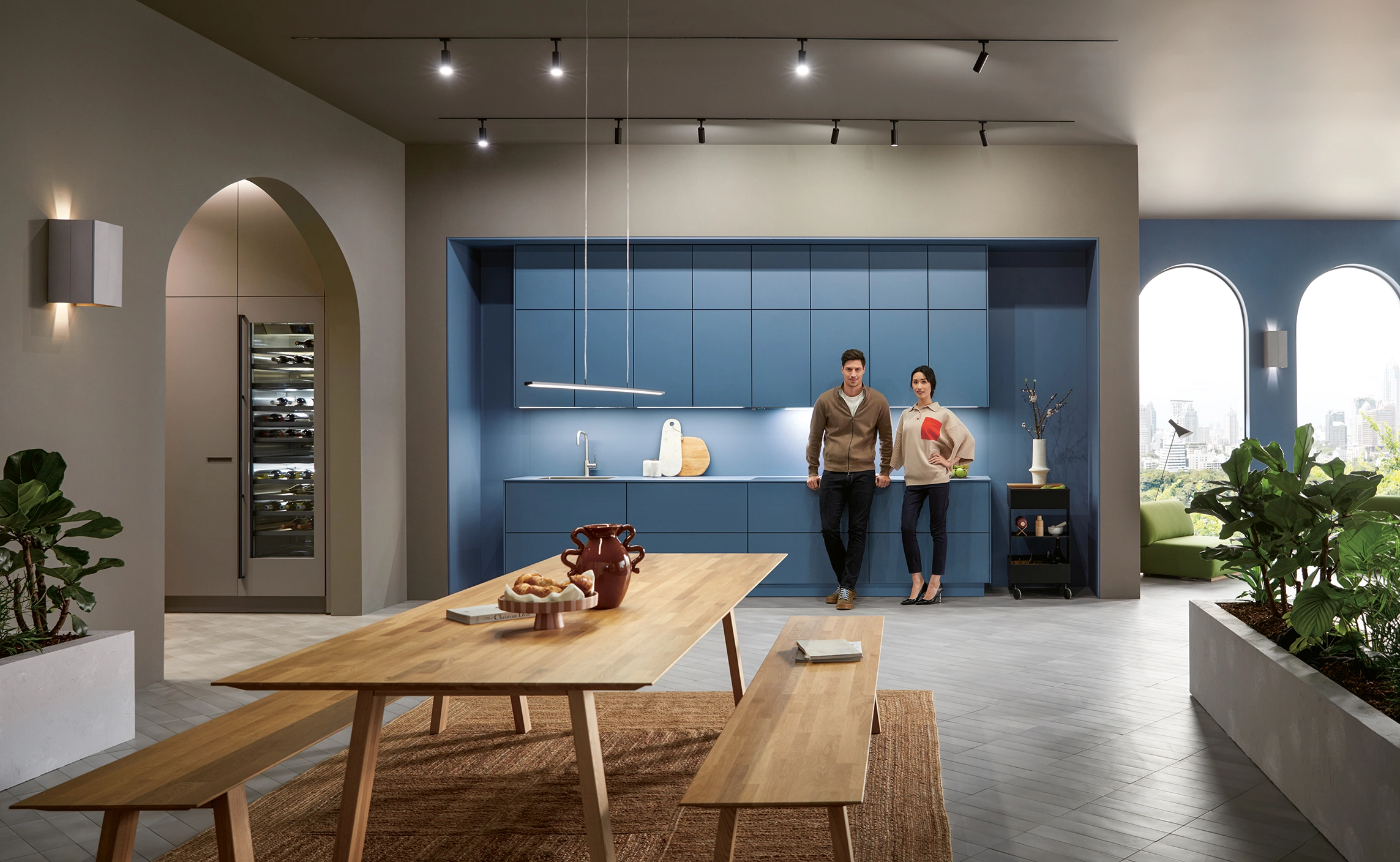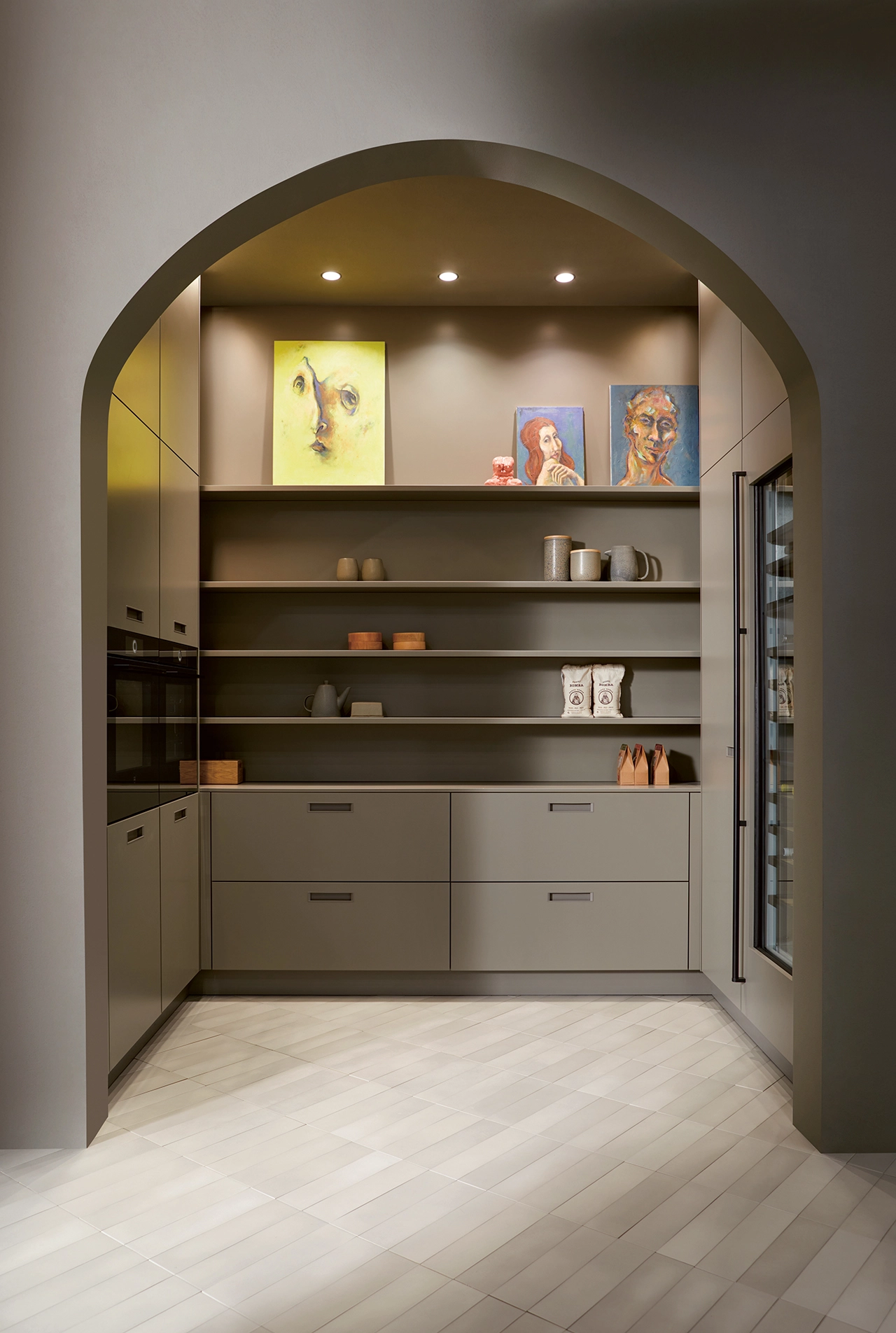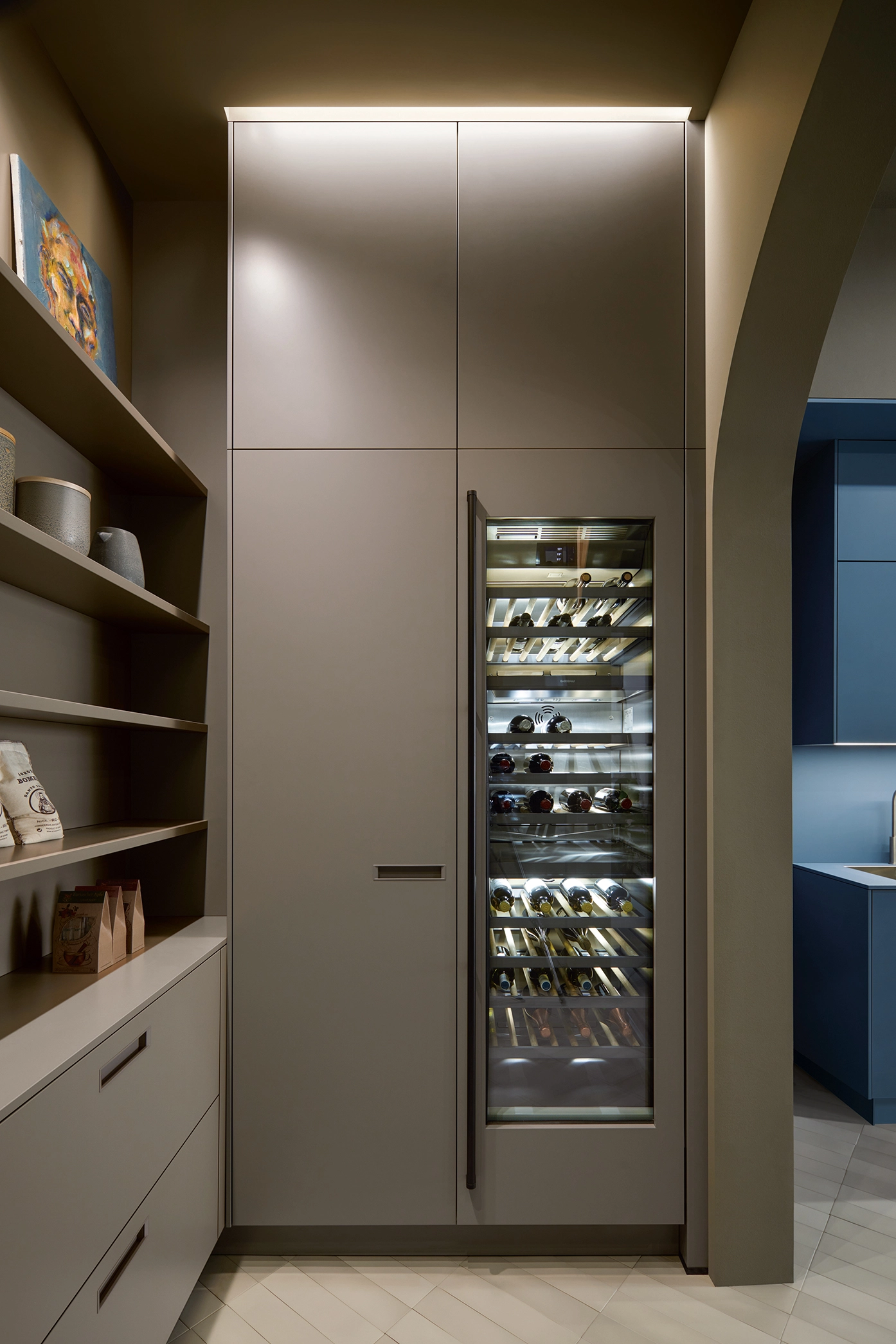 Chladnička na víno a zodpovedajúci rám sa hladko dopĺňajú. Výrez na čelá z lamina SensiQ jemne matný AFP a matný zamatový lak a dyha štýlovo prezentuje vzácne predmety: nikdy nebolo také ľahké priniesť luxus vínnej pivnice do kuchyne.
