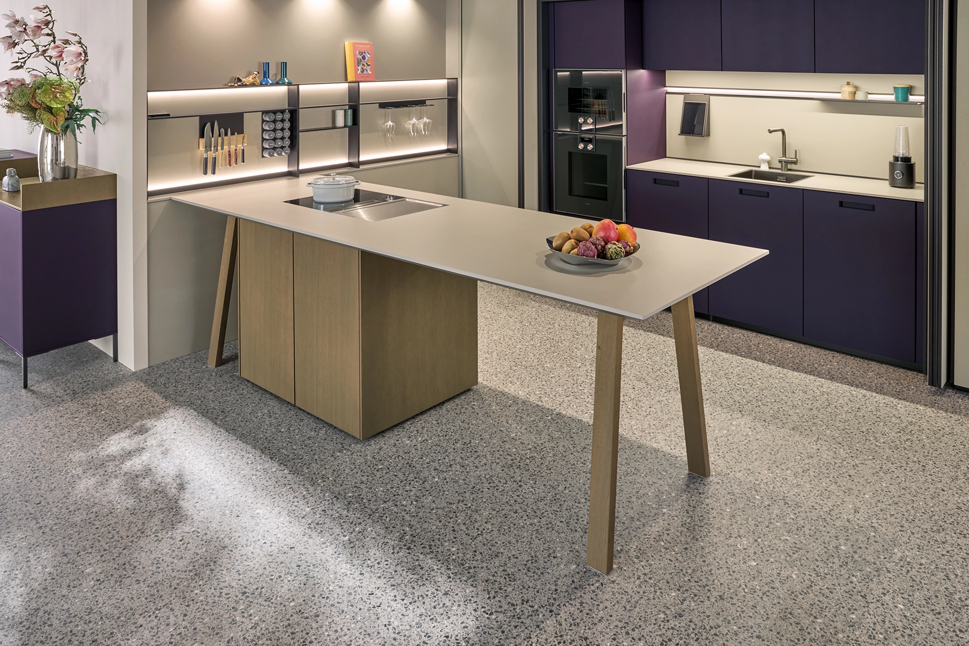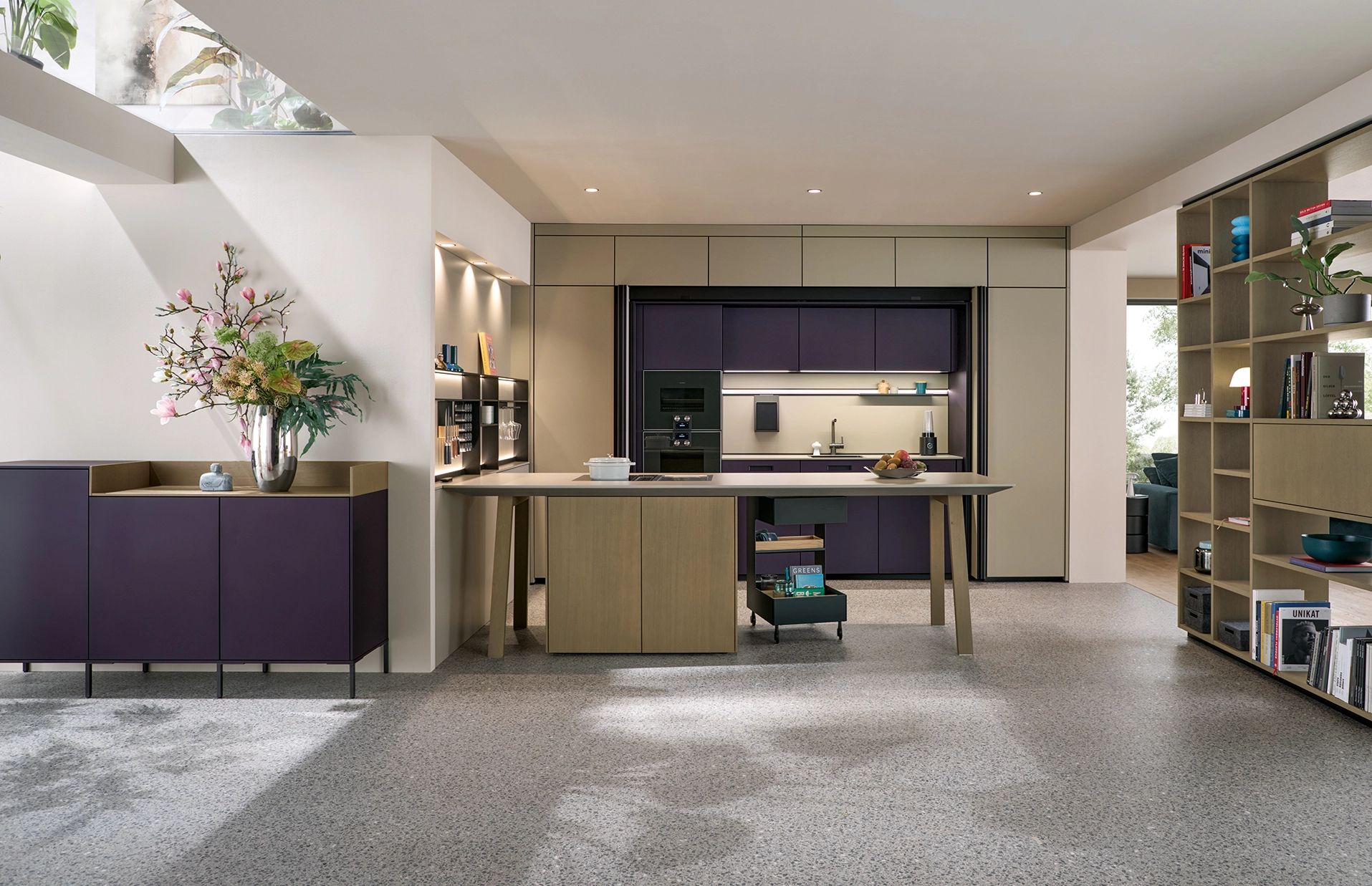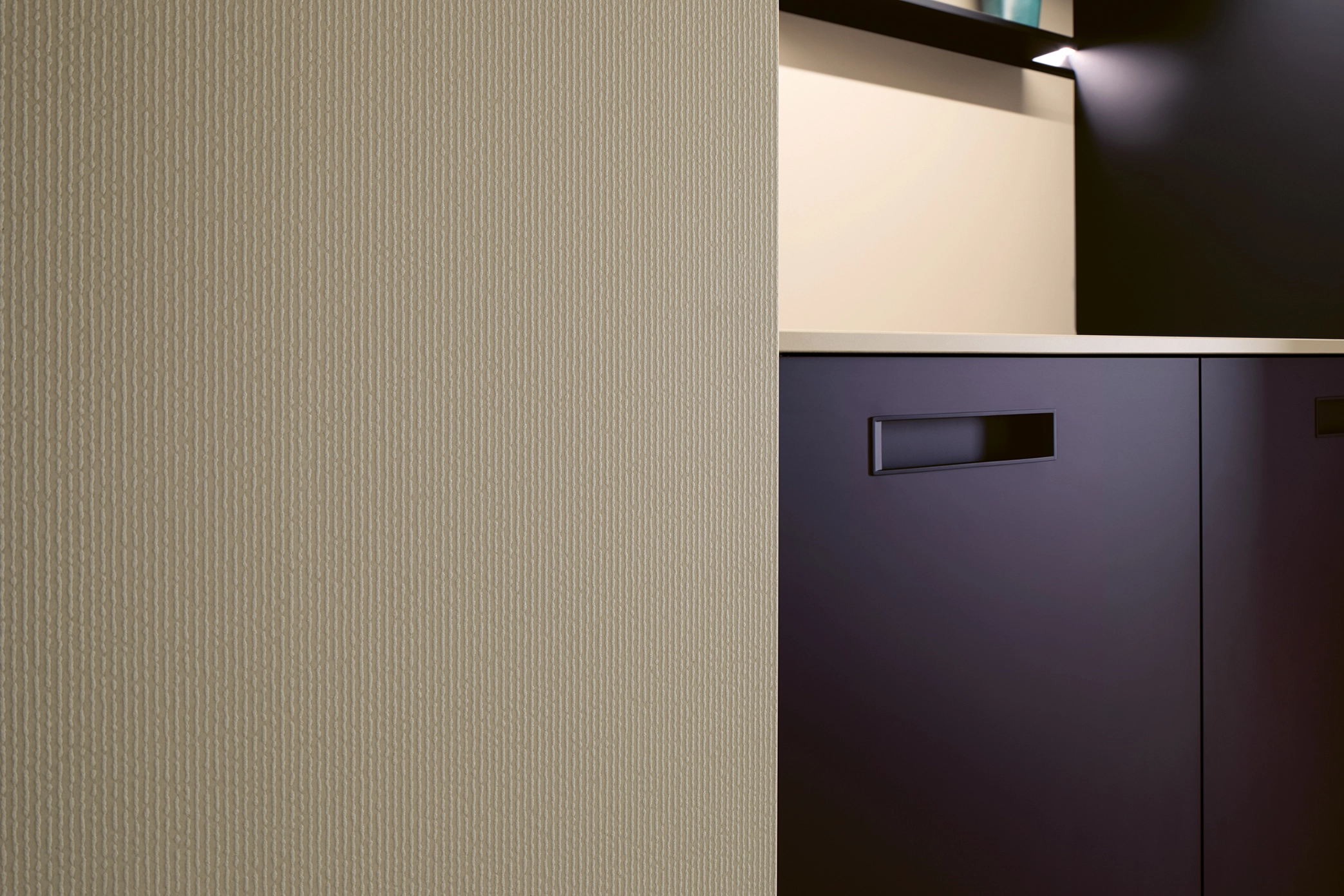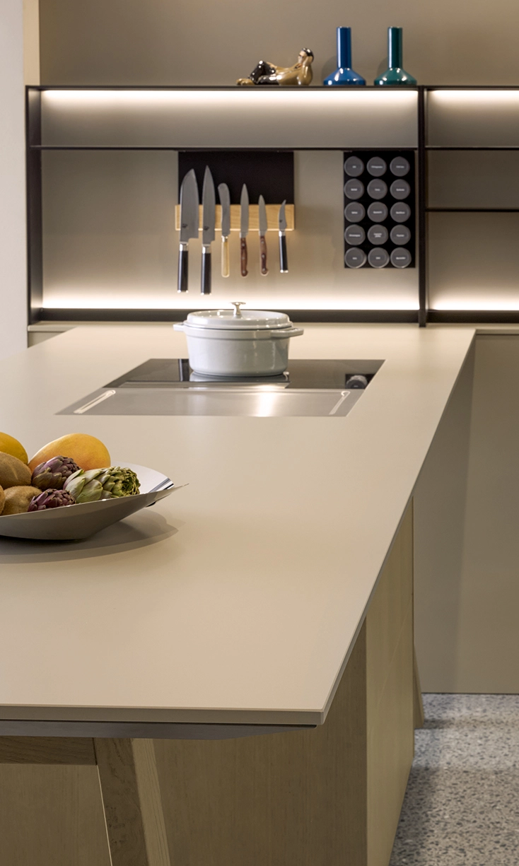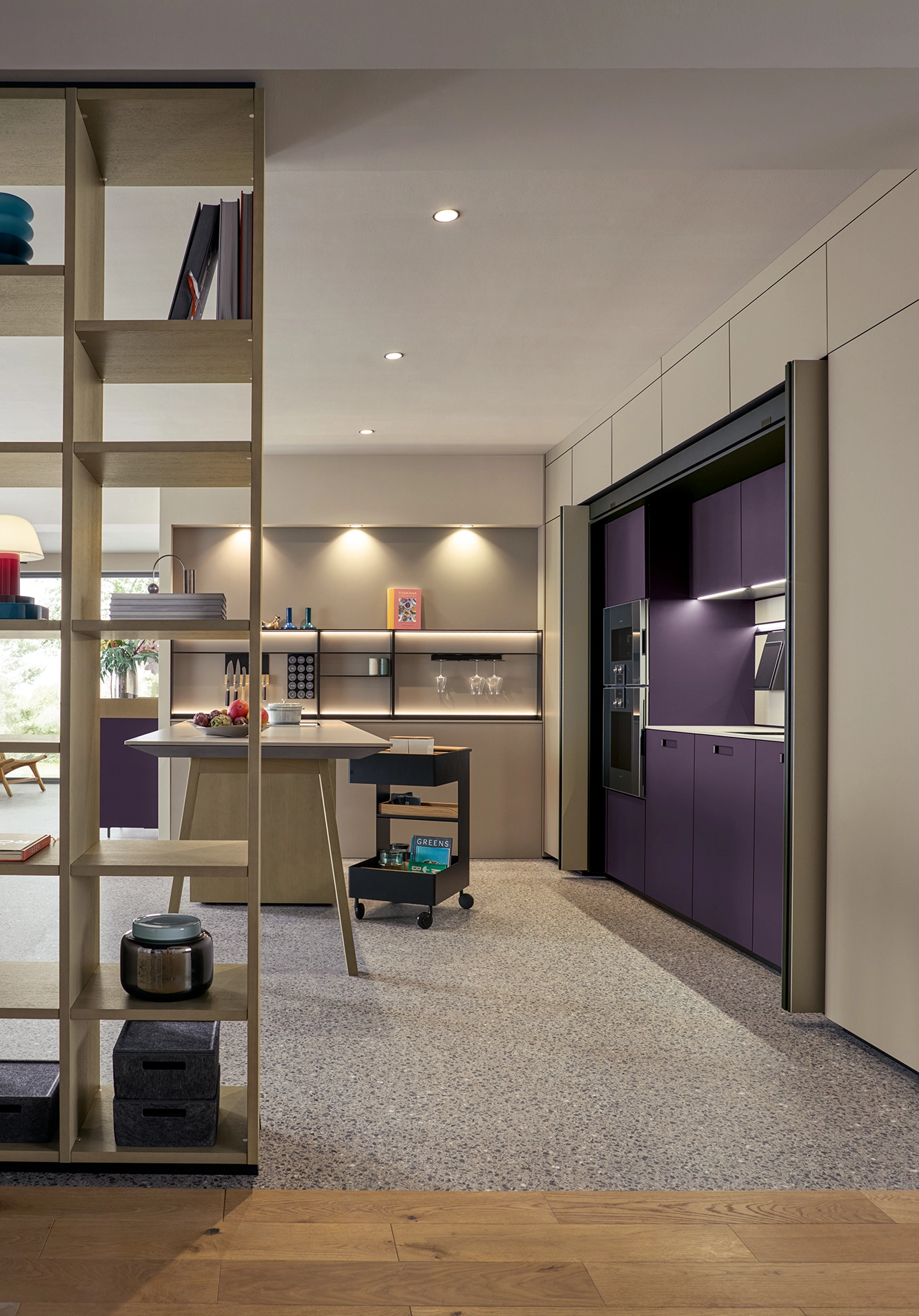 Predné strany vyrobené z pieskovej keramiky na dotyk pripomínajú ručne vyrobený papier a dodávajú kuchyni uprataný, decentný vzhľad. Toto je ďalej zdôraznené systémom Pocket od podlahy až po strop, ktorý ukrýva kuchynský kút a je korunovaný radom nástenných skriniek. Predná časť kuchyne s matným zamatovým lakom, odolným voči odtlačkom prstov, vytvára fascinujúci akcent, ktorý vytvára štýlové prepojenie s príborníkom. Medzi jednotkami sú zapustené police elegantne prezentované nepriamym osvetlením, čím sa dosahuje dokonalé spojenie funkčnosti a dizajnu, ktorý je štýlovo doplnený ikonickým varným stolom. Vďaka svojmu výraznému dizajnu vyzerá skvele, aj keď je umiestnený pri stene. Farba nôh a základne ladí s drevom otvorenej policovej jednotky s nosným panelom. To zdôrazňuje jedinečný, útulný charakter miestnosti.
