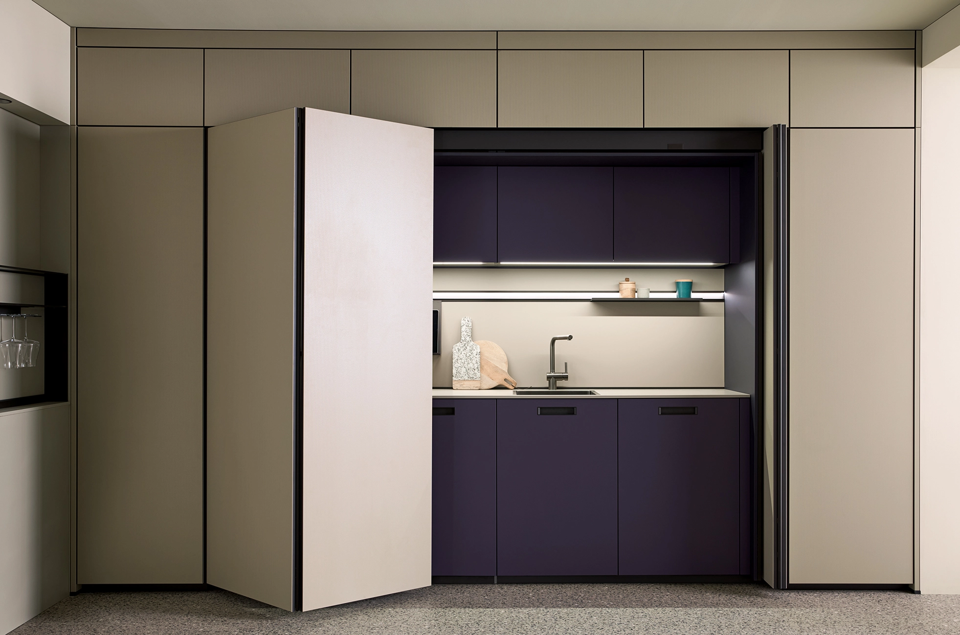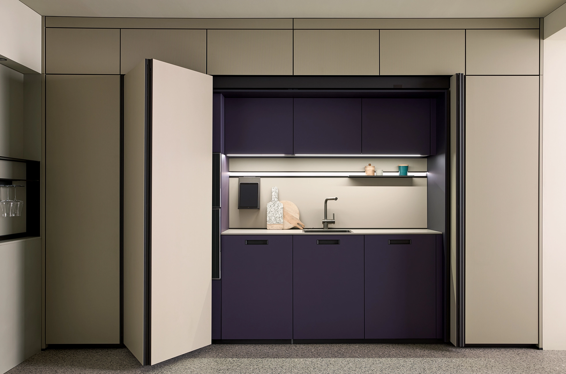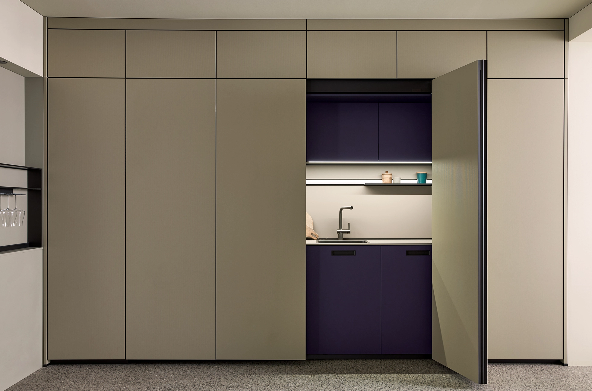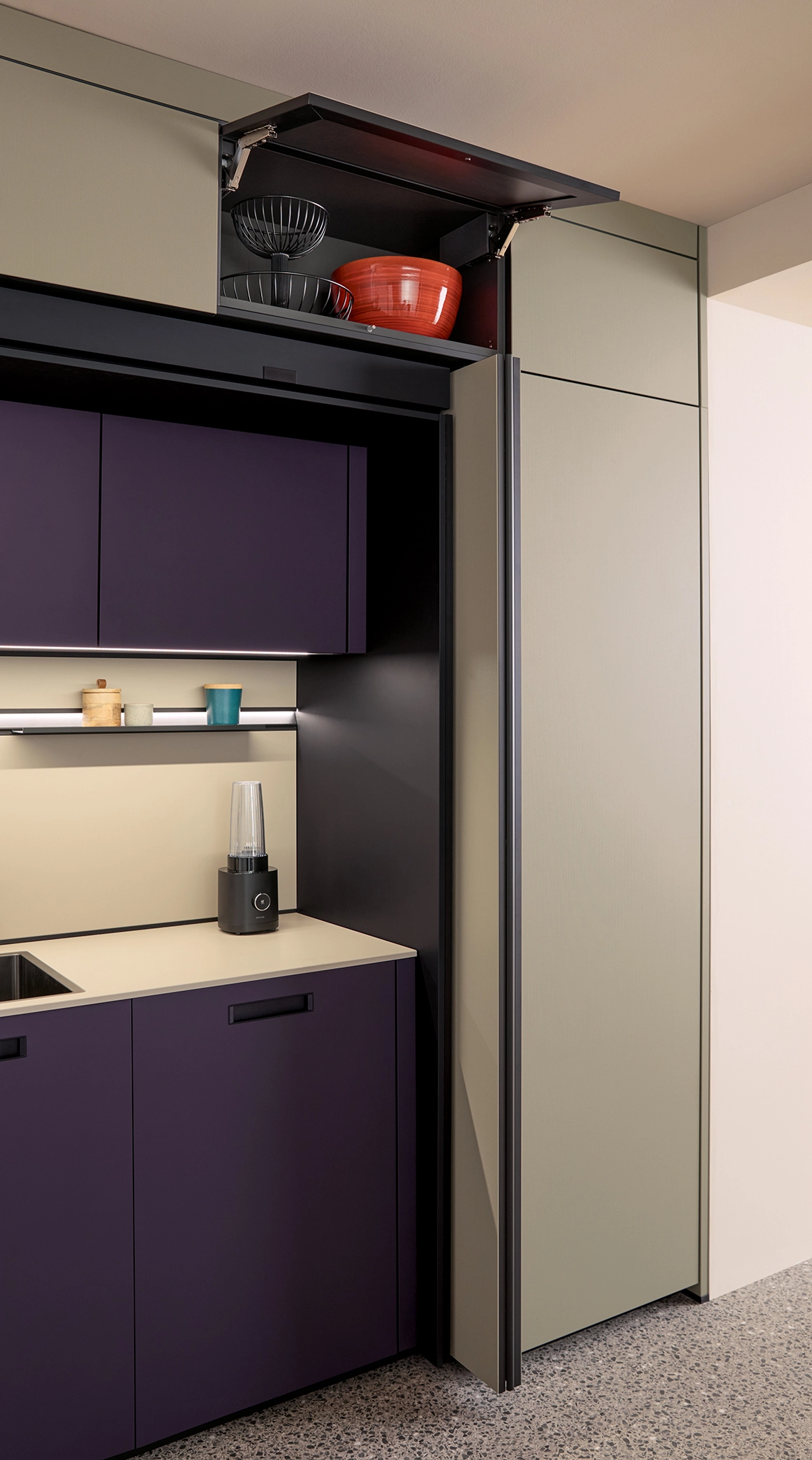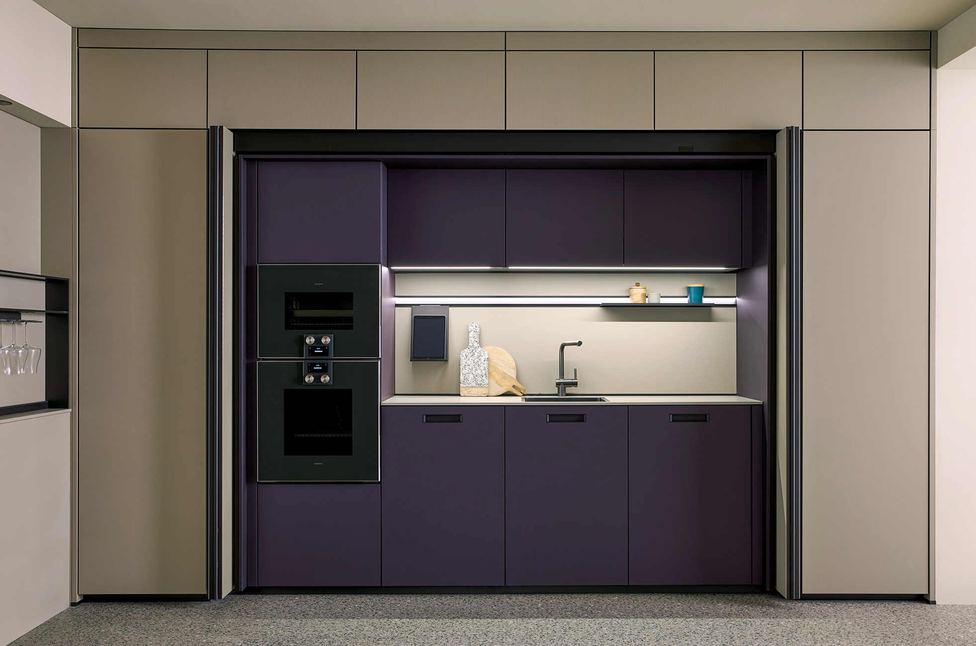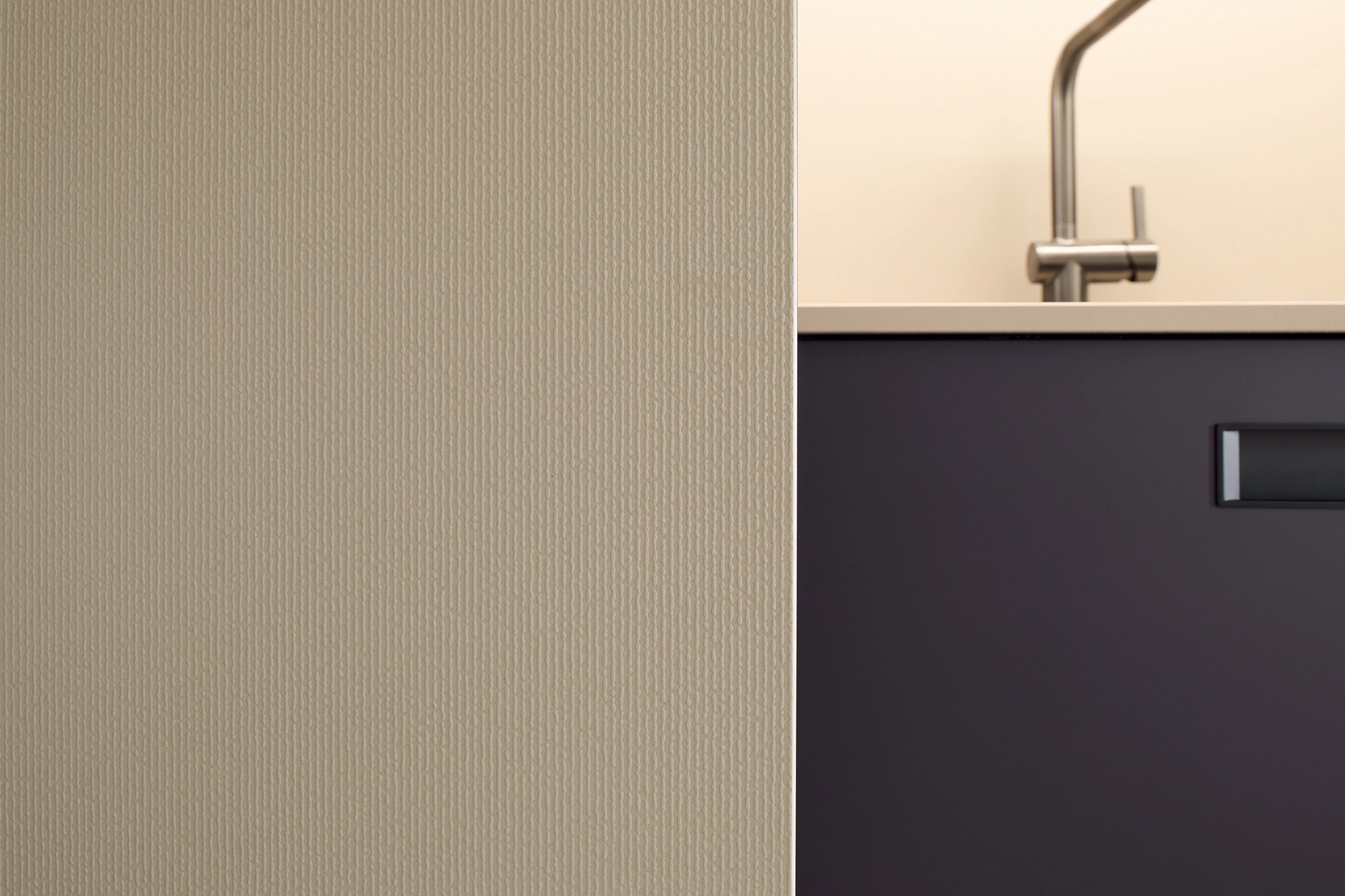Predné strany vyrobené z pieskovej keramiky na dotyk pripomínajú ručne vyrobený papier a dodávajú kuchyni uprataný, decentný vzhľad. Toto je ďalej zdôraznené systémom Pocket od podlahy až po strop, ktorý ukrýva kuchynský kút a je korunovaný radom nástenných skriniek. Predná časť kuchyne s matným zamatovým lakom, odolným voči odtlačkom prstov, vytvára fascinujúci akcent, ktorý vytvára štýlové prepojenie s príborníkom. Medzi jednotkami sú zapustené police elegantne prezentované nepriamym osvetlením, čím sa dosahuje dokonalé spojenie funkčnosti a dizajnu, ktorý je štýlovo doplnený ikonickým varným stolom. Vďaka svojmu výraznému dizajnu vyzerá skvele, aj keď je umiestnený pri stene. Farba nôh a základne ladí s drevom otvorenej policovej jednotky s nosným panelom. To zdôrazňuje jedinečný, útulný charakter miestnosti.