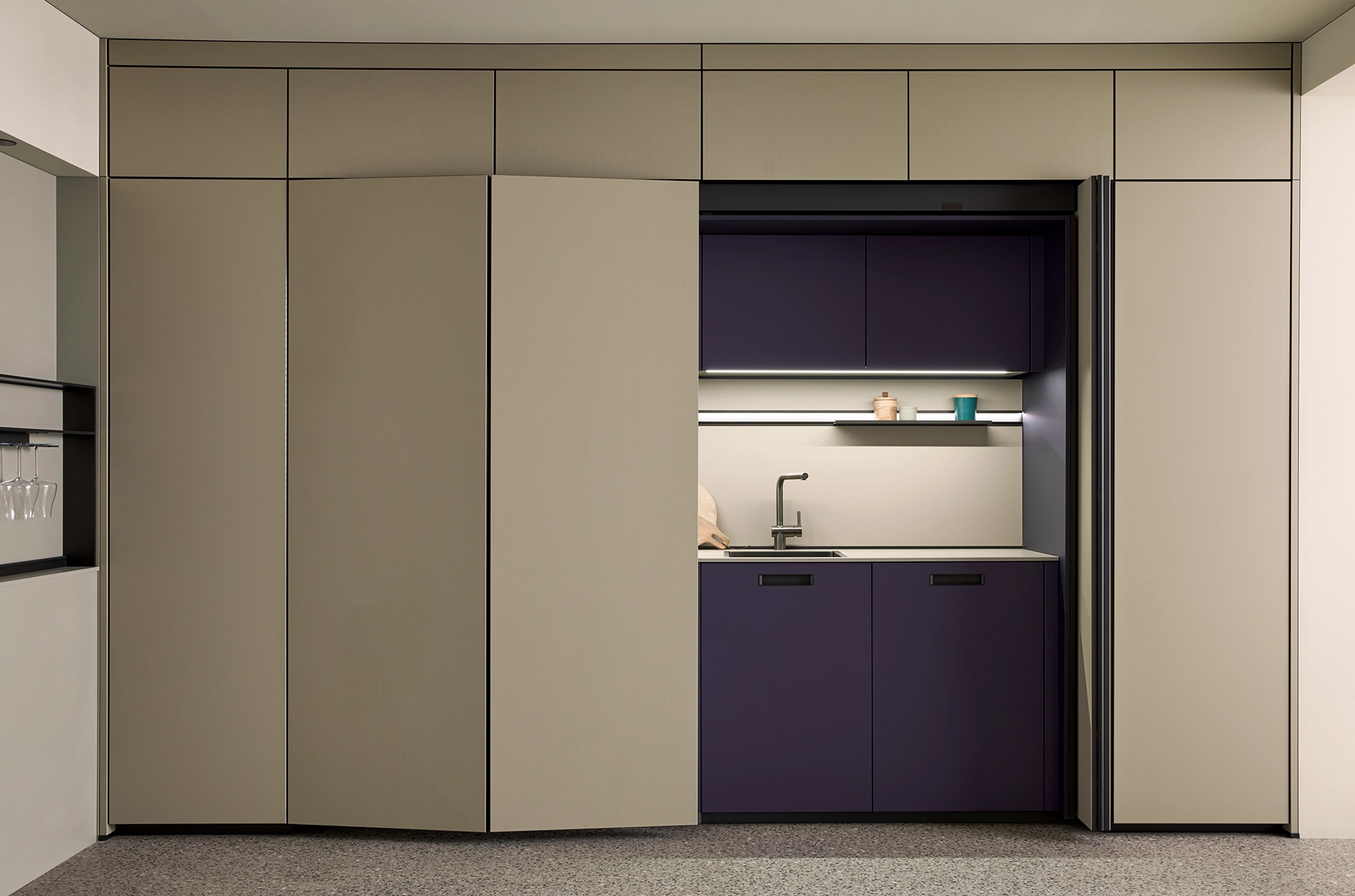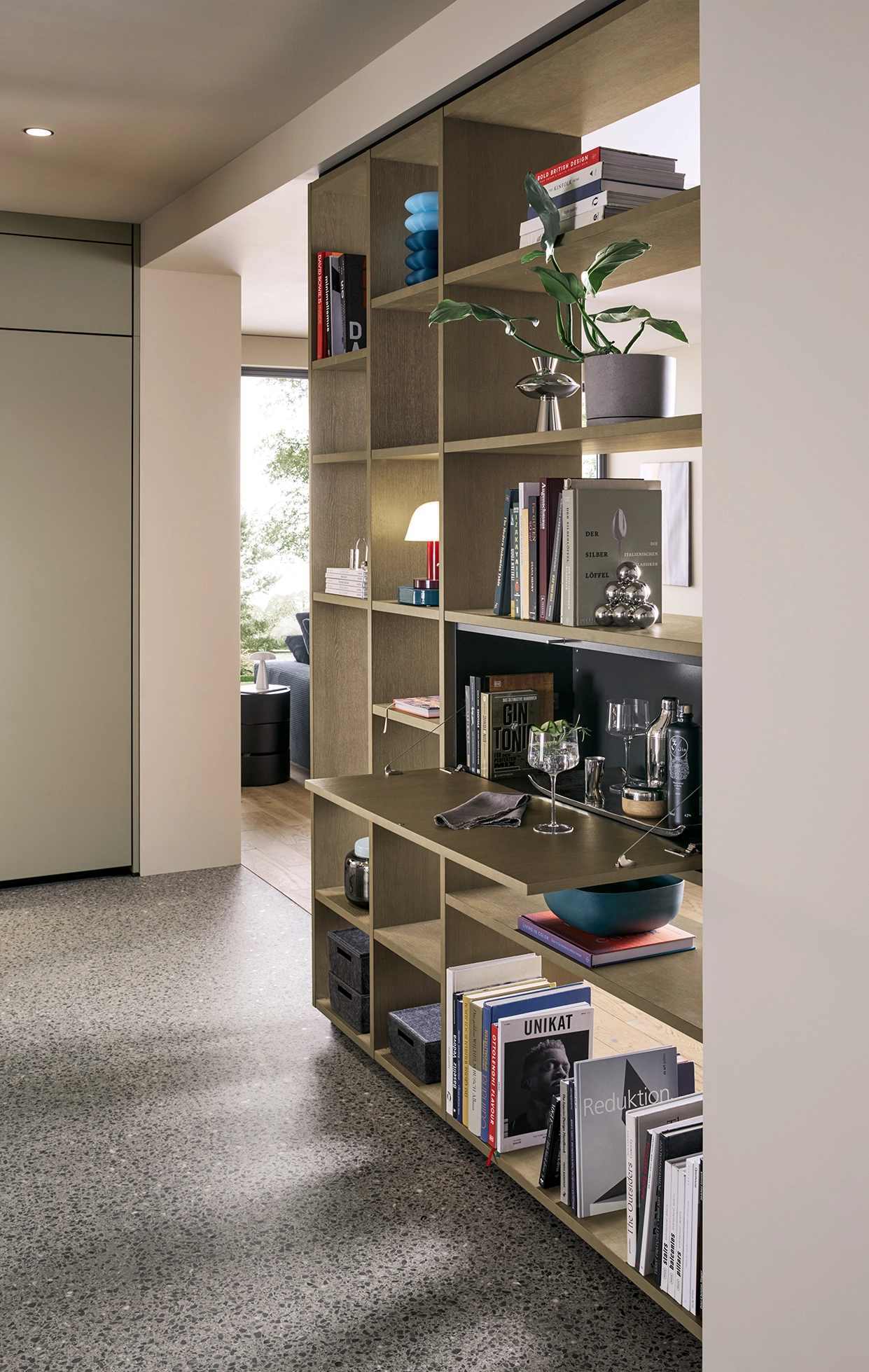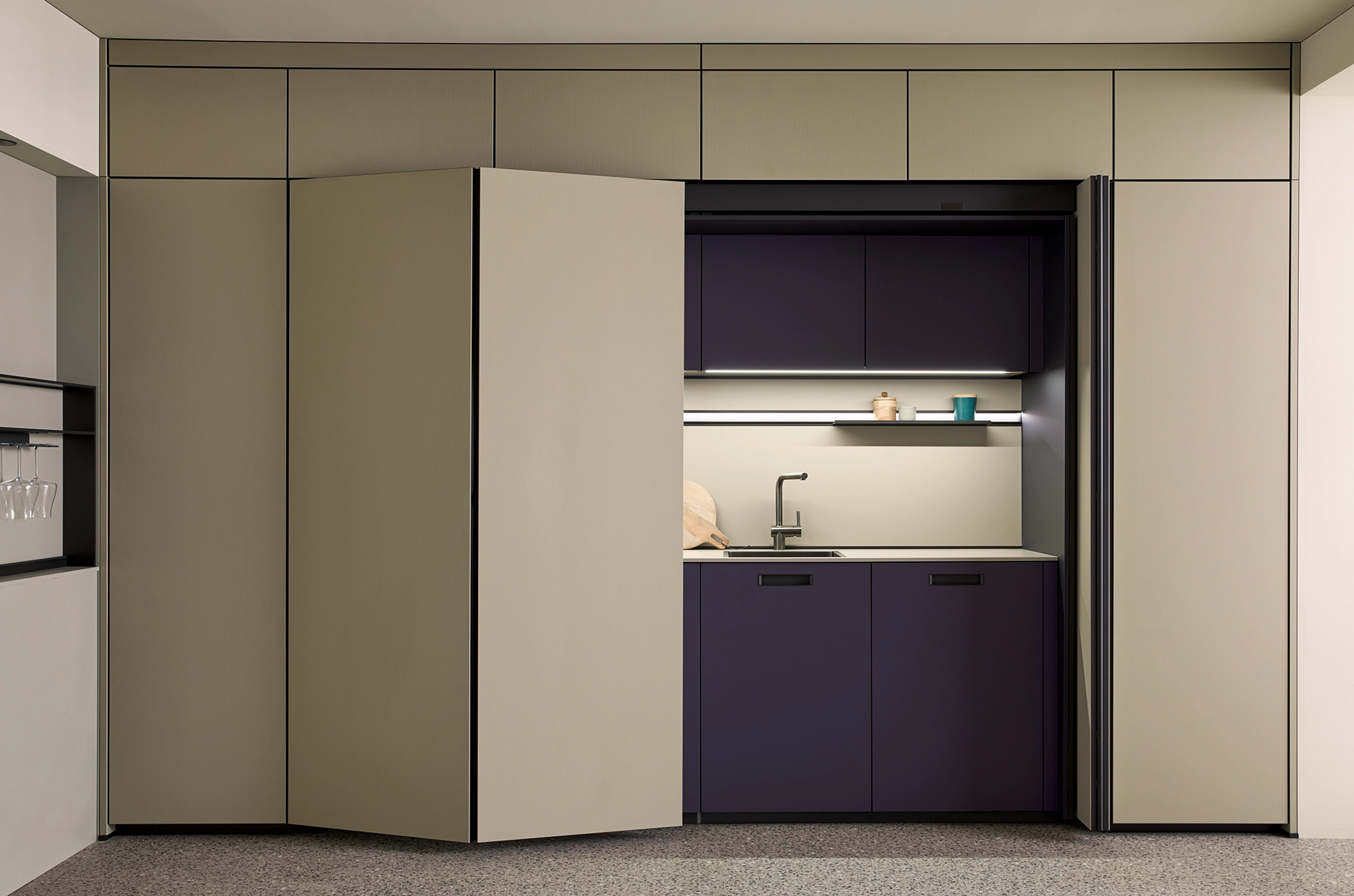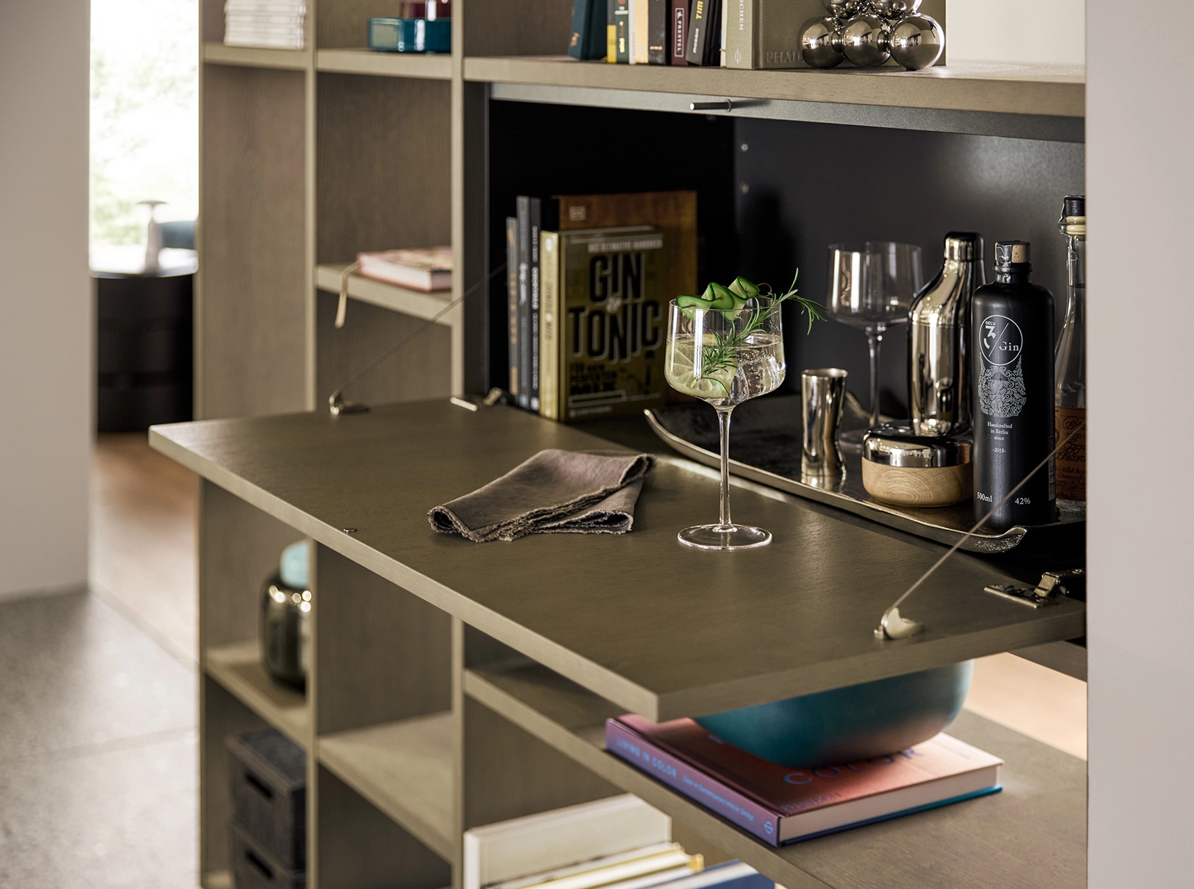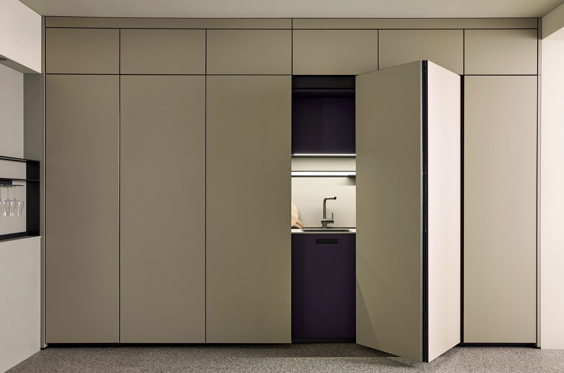 Predné strany vyrobené z pieskovej keramiky na dotyk pripomínajú ručne vyrobený papier a dodávajú kuchyni uprataný, decentný vzhľad. Toto je ďalej zdôraznené systémom Pocket od podlahy až po strop, ktorý ukrýva kuchynský kút a je korunovaný radom nástenných skriniek. Predná časť kuchyne s matným zamatovým lakom, odolným voči odtlačkom prstov, vytvára fascinujúci akcent, ktorý vytvára štýlové prepojenie s príborníkom. Medzi jednotkami sú zapustené police elegantne prezentované nepriamym osvetlením, čím sa dosahuje dokonalé spojenie funkčnosti a dizajnu, ktorý je štýlovo doplnený ikonickým varným stolom. Vďaka svojmu výraznému dizajnu vyzerá skvele, aj keď je umiestnený pri stene. Farba nôh a základne ladí s drevom otvorenej policovej jednotky s nosným panelom. To zdôrazňuje jedinečný, útulný charakter miestnosti.