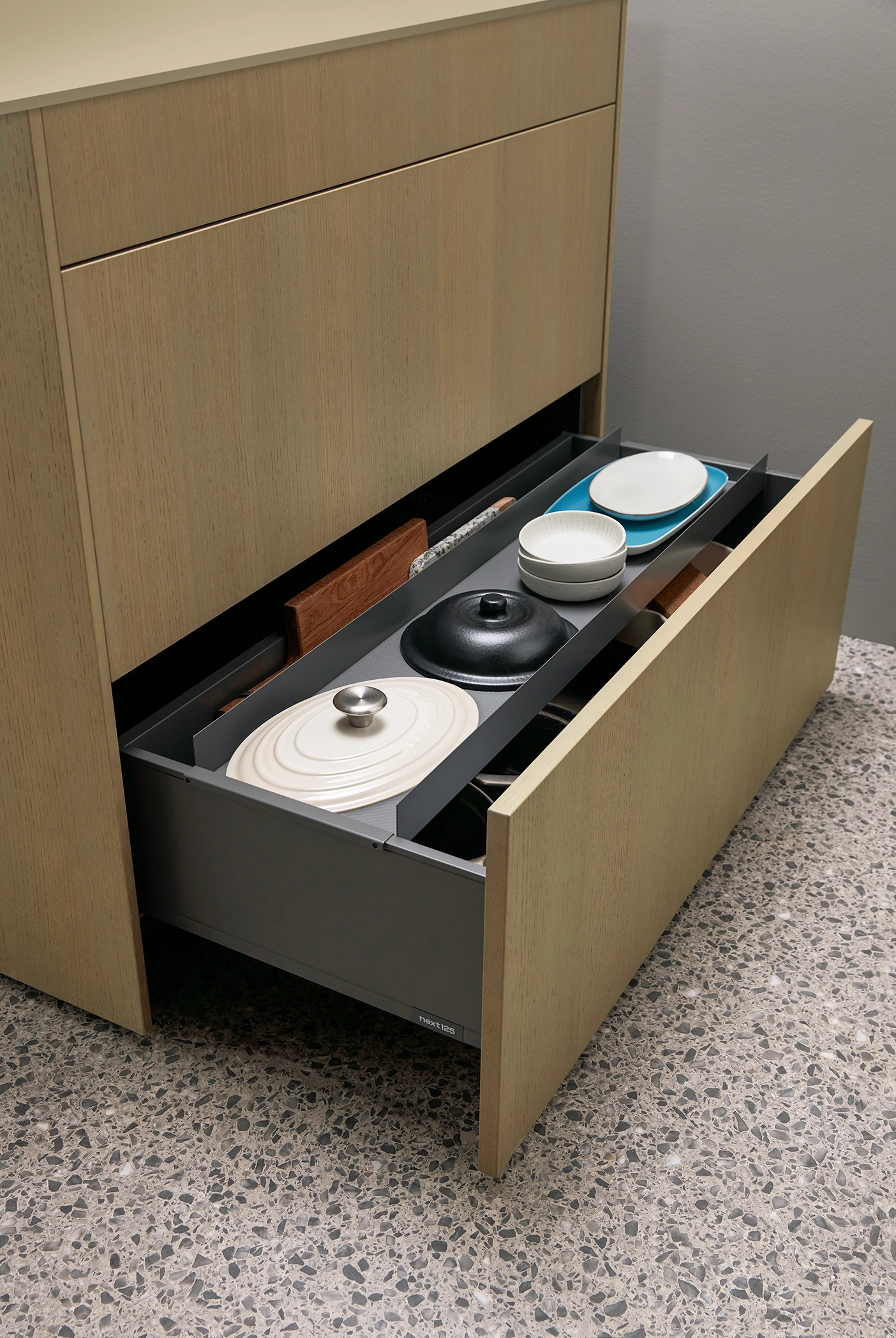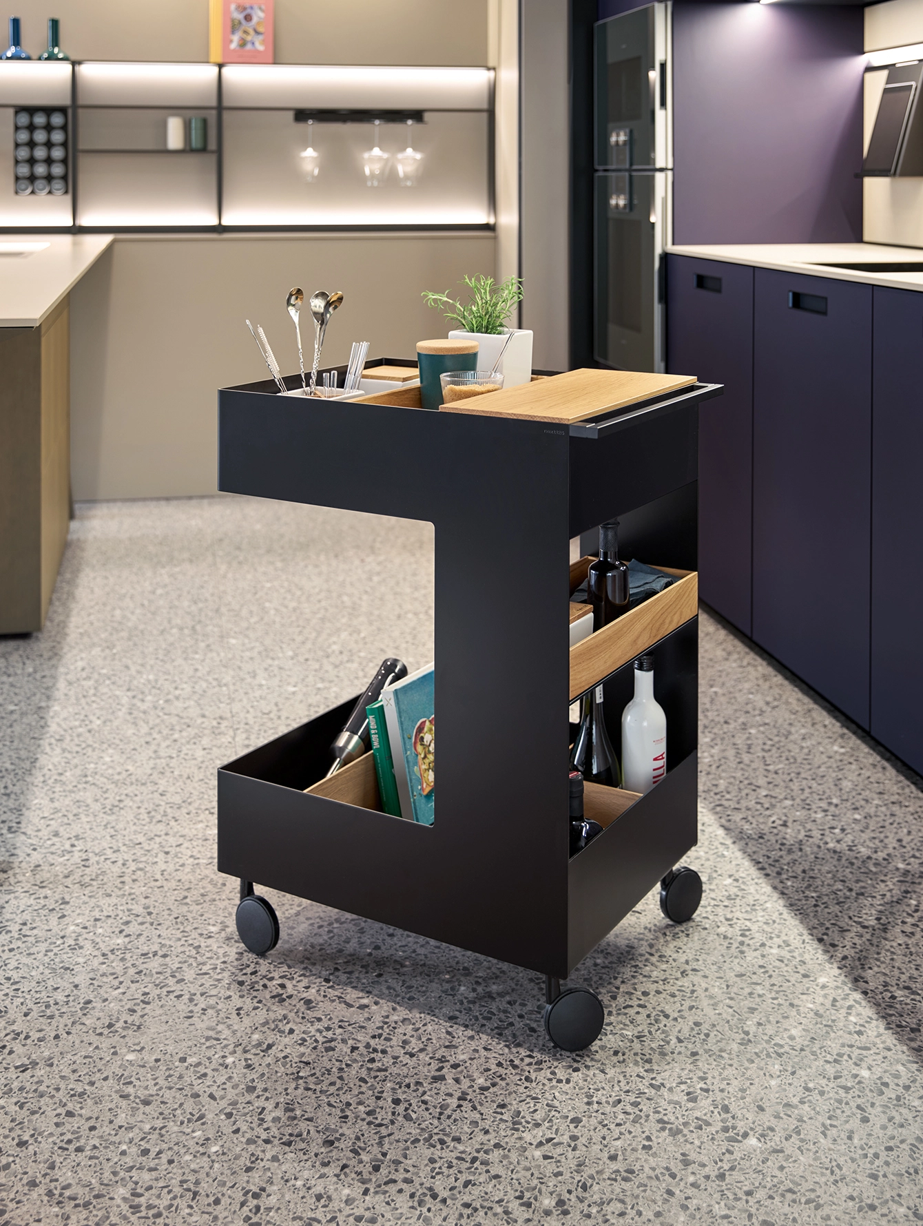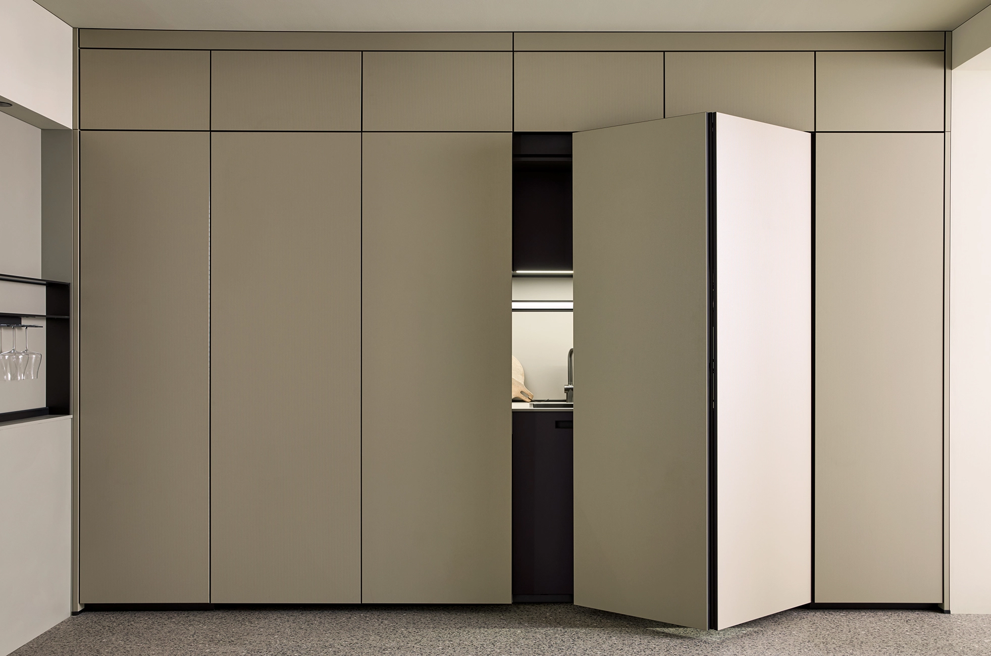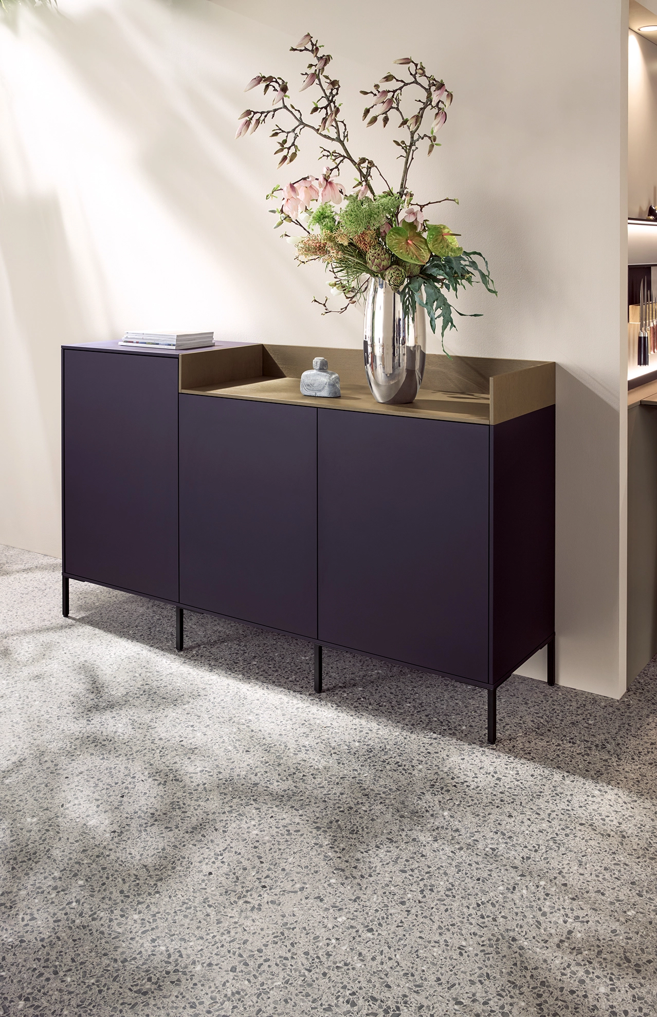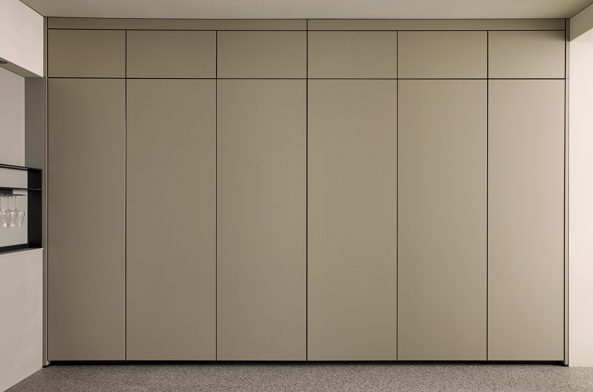 Predné strany vyrobené z pieskovej keramiky na dotyk pripomínajú ručne vyrobený papier a dodávajú kuchyni uprataný, decentný vzhľad. Toto je ďalej zdôraznené systémom Pocket od podlahy až po strop, ktorý ukrýva kuchynský kút a je korunovaný radom nástenných skriniek. Predná časť kuchyne s matným zamatovým lakom, odolným voči odtlačkom prstov, vytvára fascinujúci akcent, ktorý vytvára štýlové prepojenie s príborníkom. Medzi jednotkami sú zapustené police elegantne prezentované nepriamym osvetlením, čím sa dosahuje dokonalé spojenie funkčnosti a dizajnu, ktorý je štýlovo doplnený ikonickým varným stolom. Vďaka svojmu výraznému dizajnu vyzerá skvele, aj keď je umiestnený pri stene. Farba nôh a základne ladí s drevom otvorenej policovej jednotky s nosným panelom. To zdôrazňuje jedinečný, útulný charakter miestnosti.