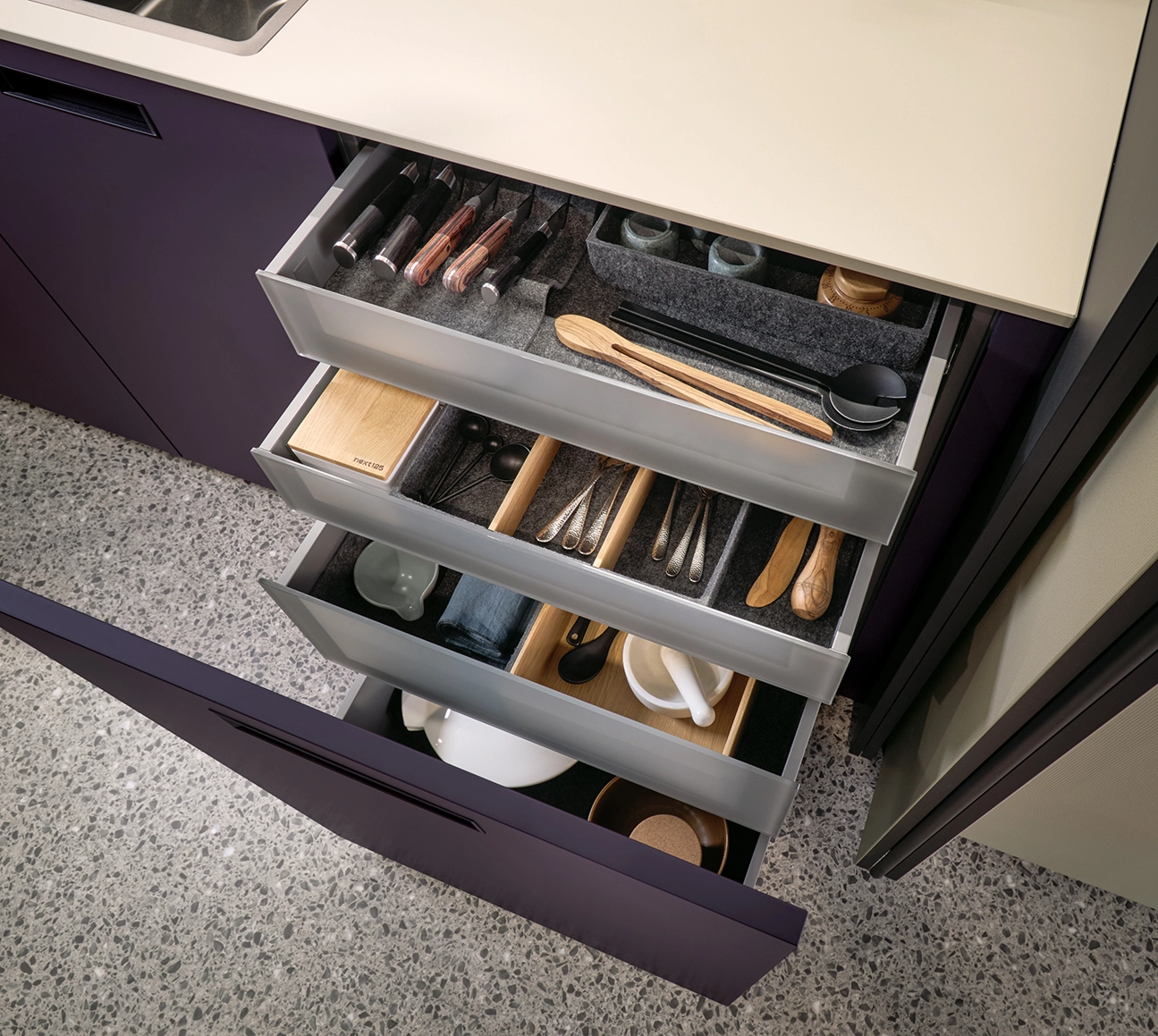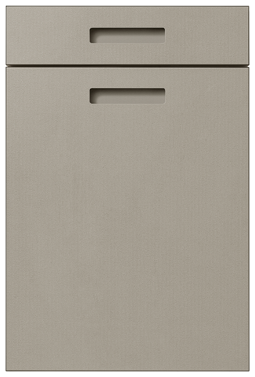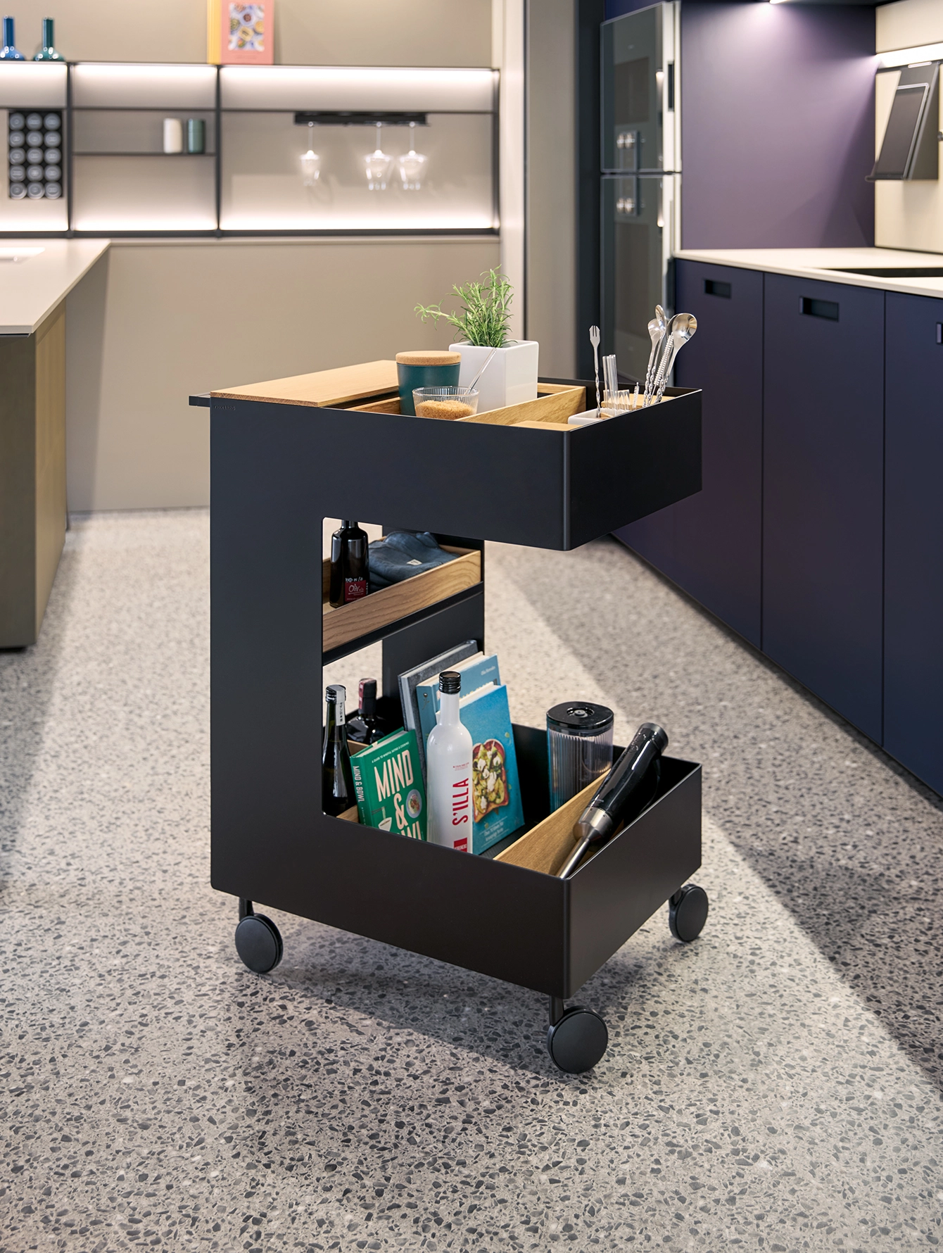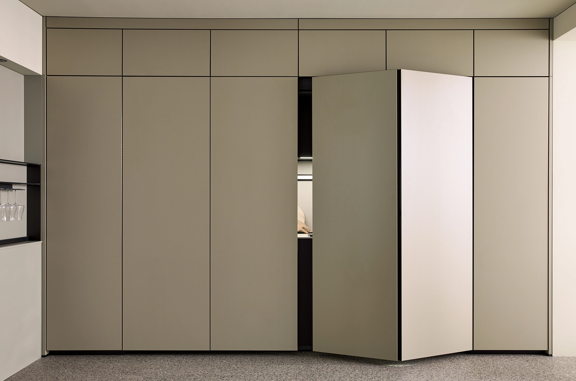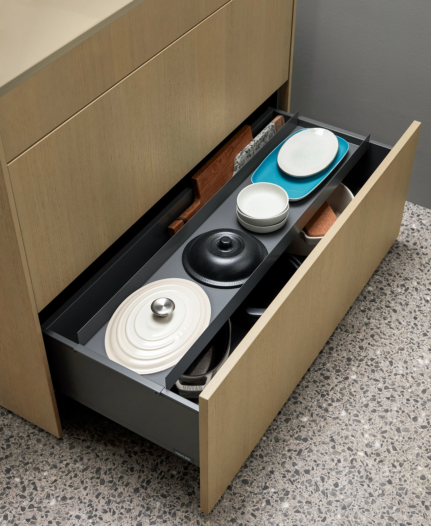 Predné strany vyrobené z pieskovej keramiky na dotyk pripomínajú ručne vyrobený papier a dodávajú kuchyni uprataný, decentný vzhľad. Toto je ďalej zdôraznené systémom Pocket od podlahy až po strop, ktorý ukrýva kuchynský kút a je korunovaný radom nástenných skriniek. Predná časť kuchyne s matným zamatovým lakom, odolným voči odtlačkom prstov, vytvára fascinujúci akcent, ktorý vytvára štýlové prepojenie s príborníkom. Medzi jednotkami sú zapustené police elegantne prezentované nepriamym osvetlením, čím sa dosahuje dokonalé spojenie funkčnosti a dizajnu, ktorý je štýlovo doplnený ikonickým varným stolom. Vďaka svojmu výraznému dizajnu vyzerá skvele, aj keď je umiestnený pri stene. Farba nôh a základne ladí s drevom otvorenej policovej jednotky s nosným panelom. To zdôrazňuje jedinečný, útulný charakter miestnosti.