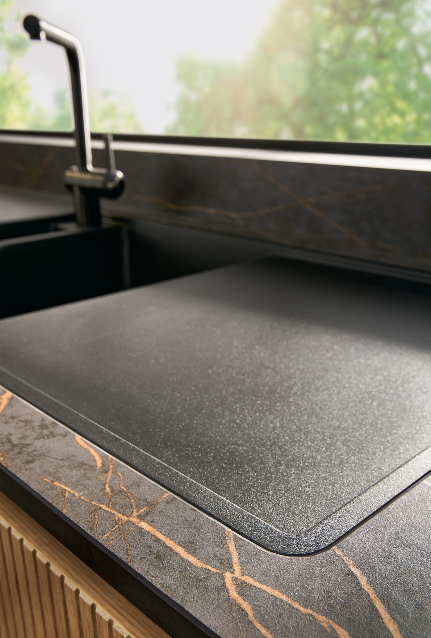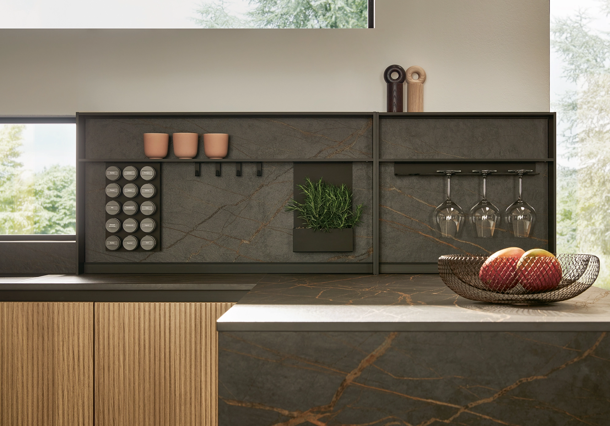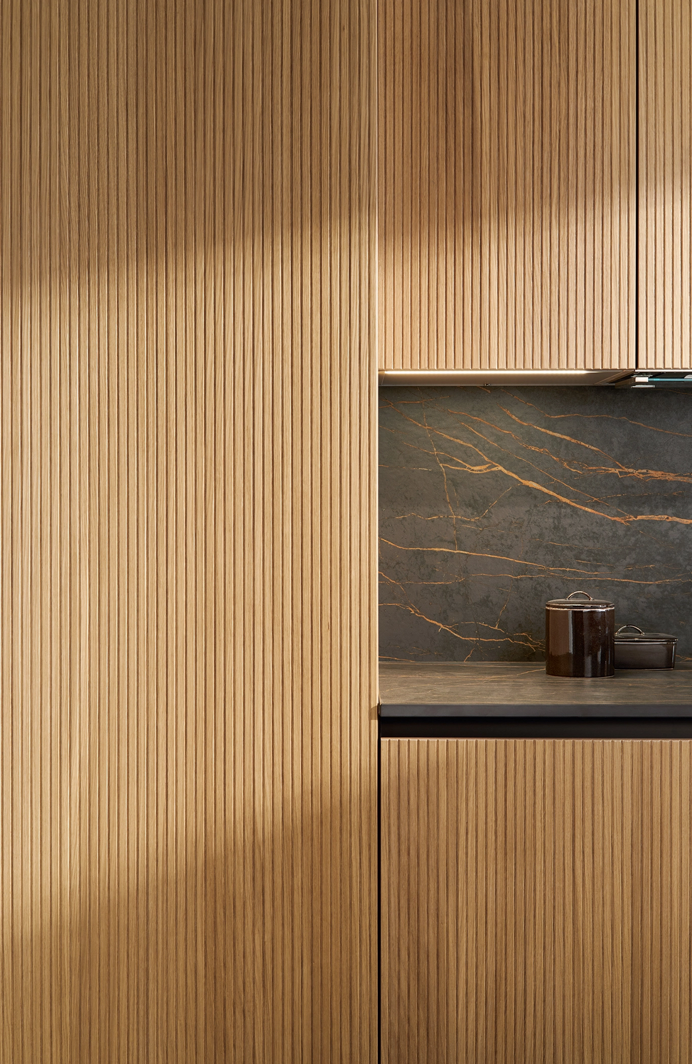 Špeciálne túžby si vyžadujú výnimočné nápady, aby sme ich priviedli k životu. Je skvelé, keď na to môžete skutočne čerpať z neobmedzených zdrojov. Táto bezúchytková dvierkovina z elegantného svetlého dubu bianco s vertikálnymi drážkami poskytuje charakteristický vzhľad a dojem a fascinuje divákov, pretože hrá s prirodzeným svetlom v miestnosti. Moderný drevený dizajn je obklopený klasickým čiernym a hnedým žilkovaným mramorovým povrchom pracovnej dosky Dekton Laurent z robustnej keramiky, ktorá sa ľahko čistí. Na zachovanie tohto veľkolepého efektu je rovnaký materiál použitý aj vo výklenkoch a na ostrovčeku určenom na označenie hraníc kuchyne. V krásne osvetlenej poličke Frame sú poháre pohodlne poruke na prípitok a bylinky a koreniny sú pripravené na spoločné kulinárske kreácie.