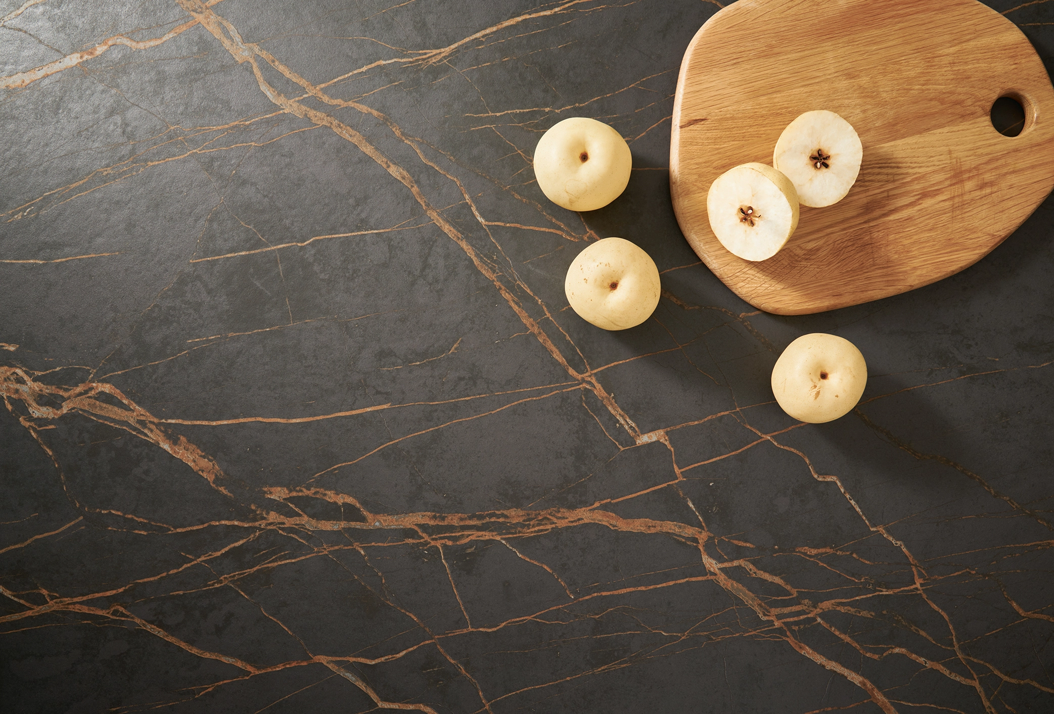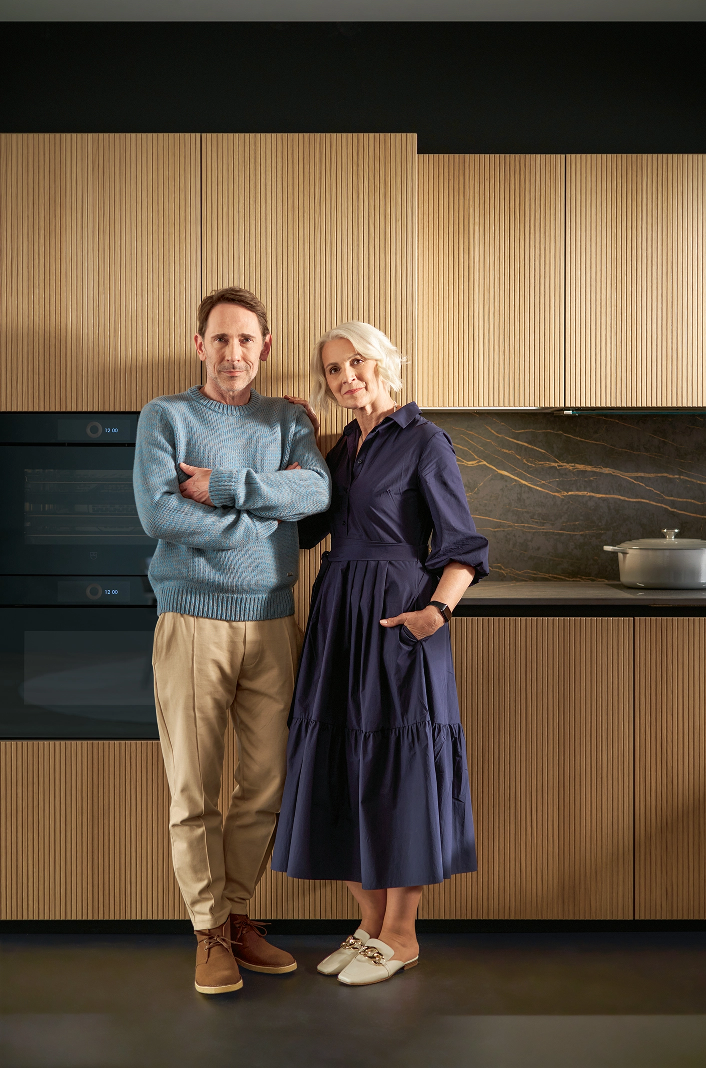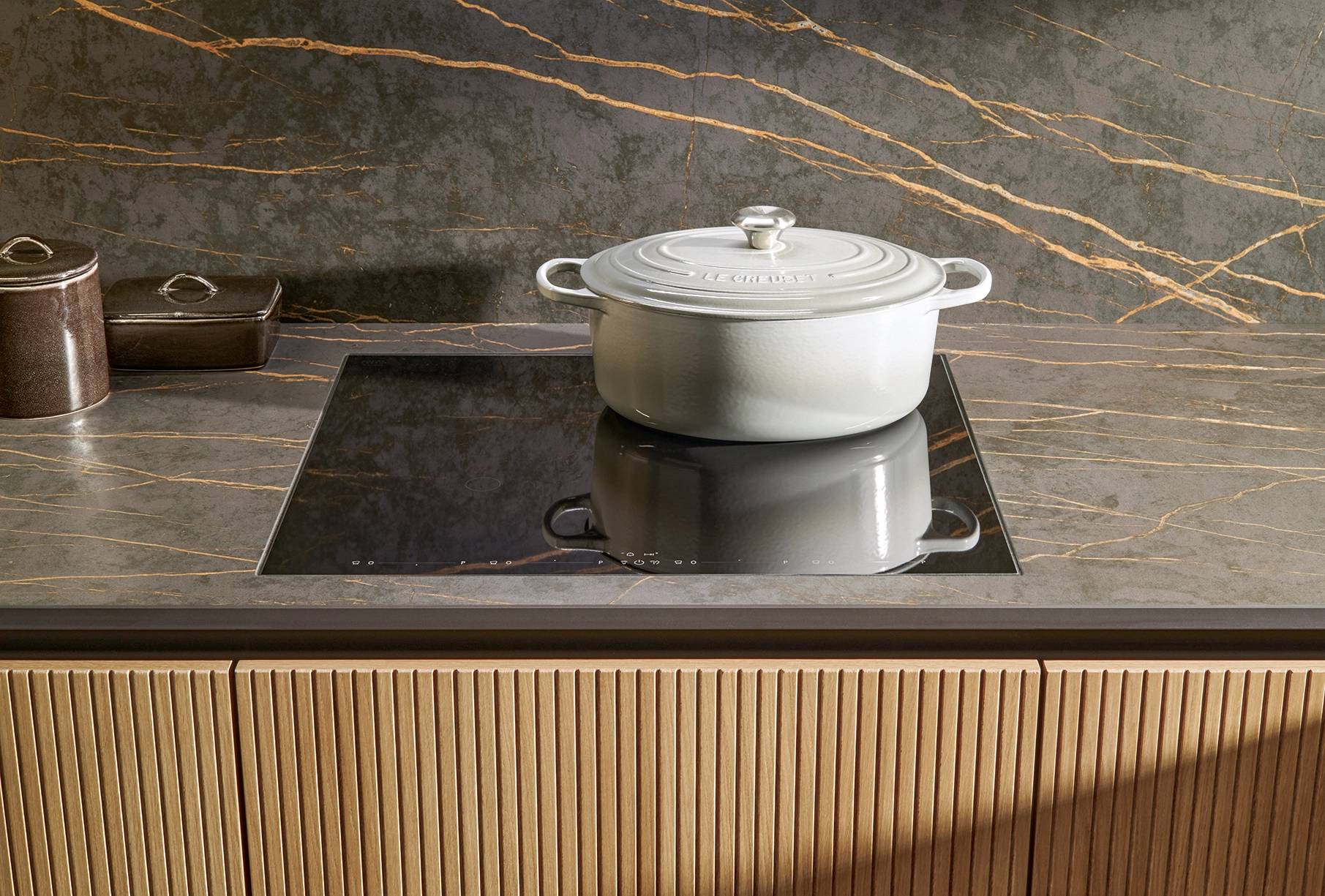 Špeciálne túžby si vyžadujú výnimočné nápady, aby sme ich priviedli k životu. Je skvelé, keď na to môžete skutočne čerpať z neobmedzených zdrojov. Táto bezúchytková dvierkovina z elegantného svetlého dubu bianco s vertikálnymi drážkami poskytuje charakteristický vzhľad a dojem a fascinuje divákov, pretože hrá s prirodzeným svetlom v miestnosti. Moderný drevený dizajn je obklopený klasickým čiernym a hnedým žilkovaným mramorovým povrchom pracovnej dosky Dekton Laurent z robustnej keramiky, ktorá sa ľahko čistí. Na zachovanie tohto veľkolepého efektu je rovnaký materiál použitý aj vo výklenkoch a na ostrovčeku určenom na označenie hraníc kuchyne. V krásne osvetlenej poličke Frame sú poháre pohodlne poruke na prípitok a bylinky a koreniny sú pripravené na spoločné kulinárske kreácie.