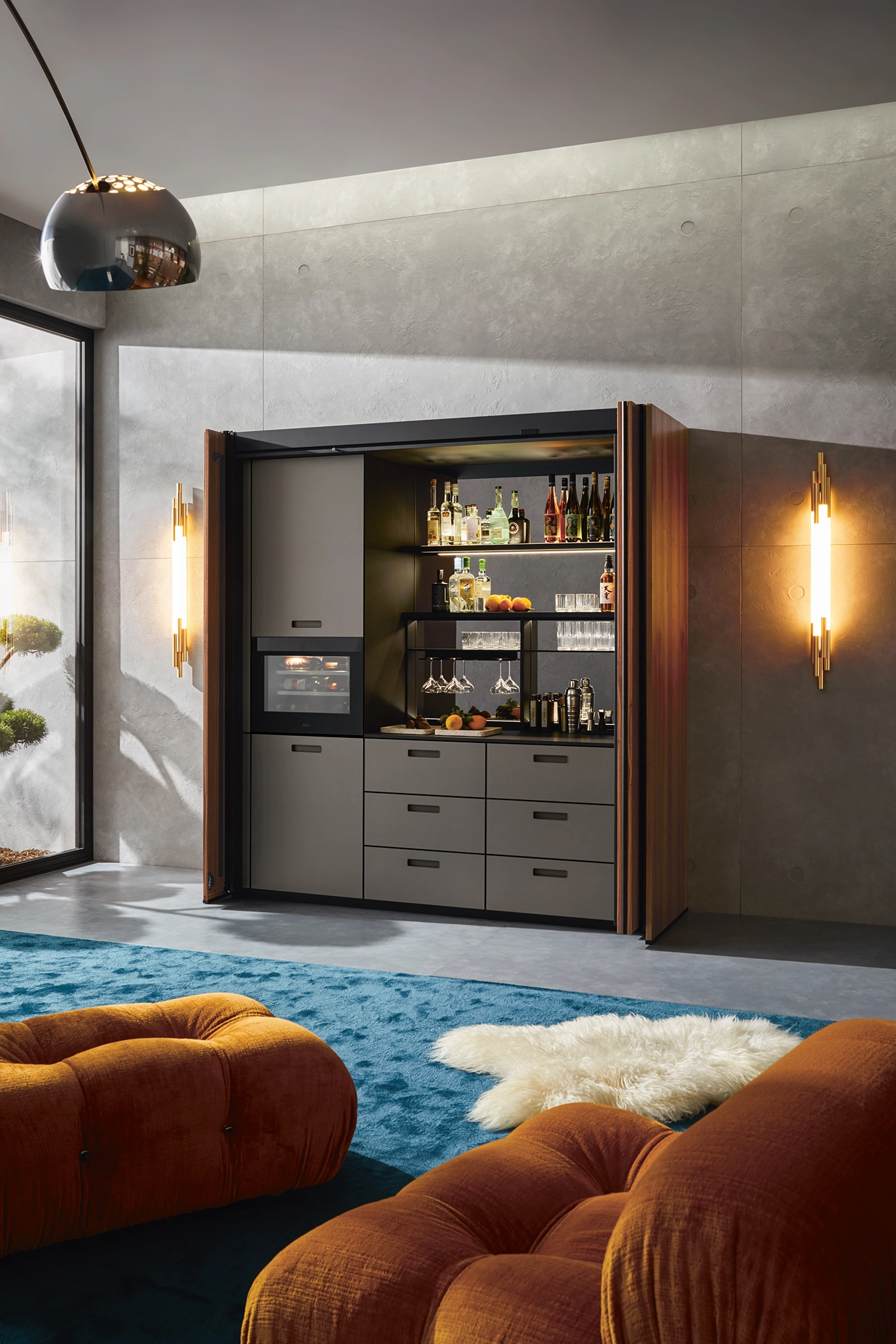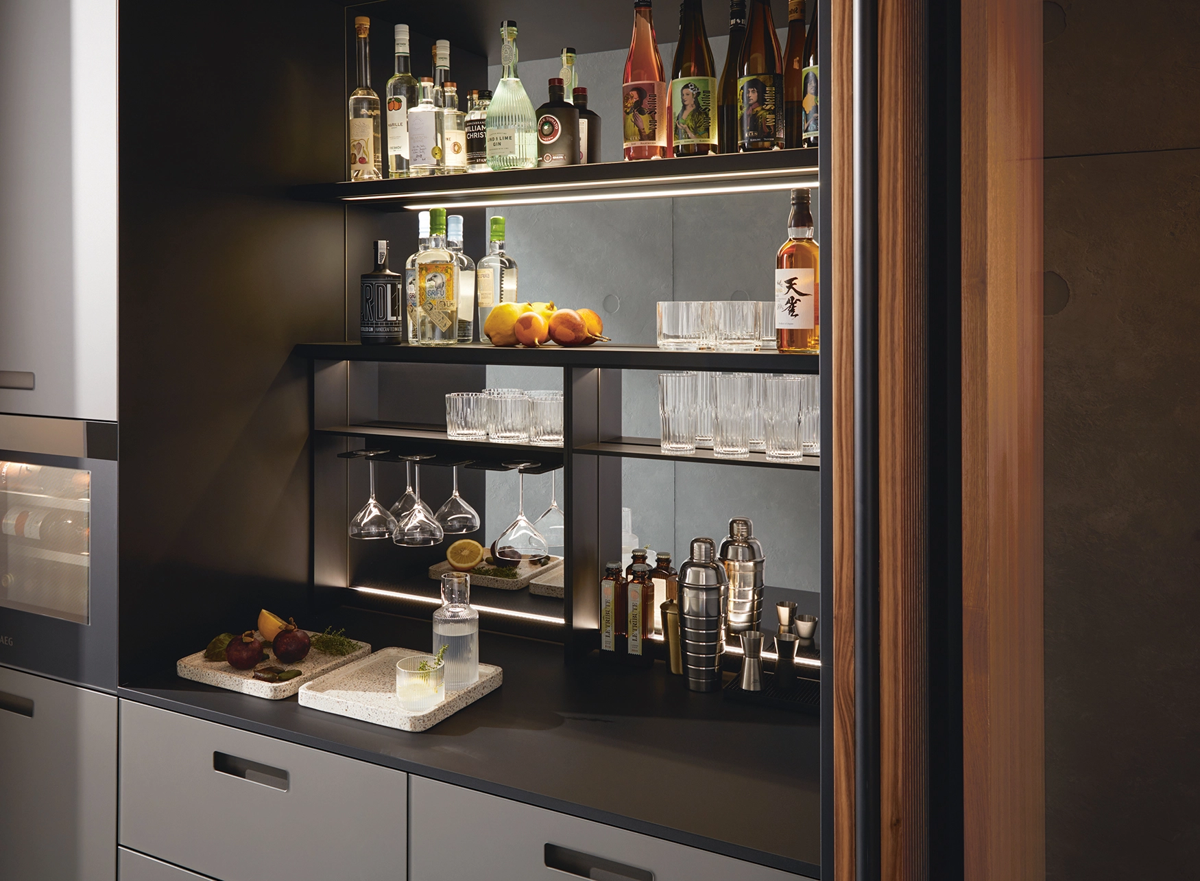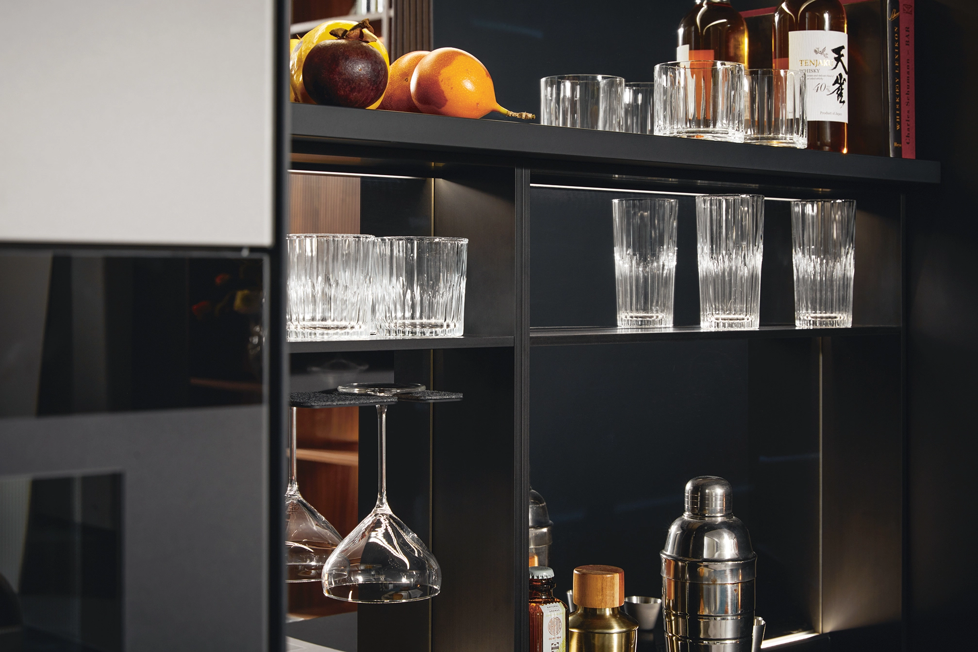 Barová časť pozostáva z vysokokvalitných rámových zapustených políc next125 a ónyxovej čiernej police s nosným panelom. Stmievateľné LED osvetlenie vytvára náladu. Zrkadlový zadný panel zobrazuje vzácne predmety a dodáva pocit hĺbky a tú správnu dávku vznešenosti.