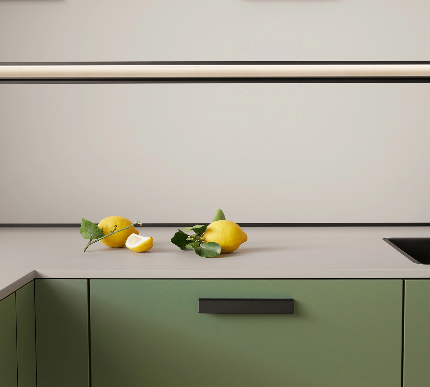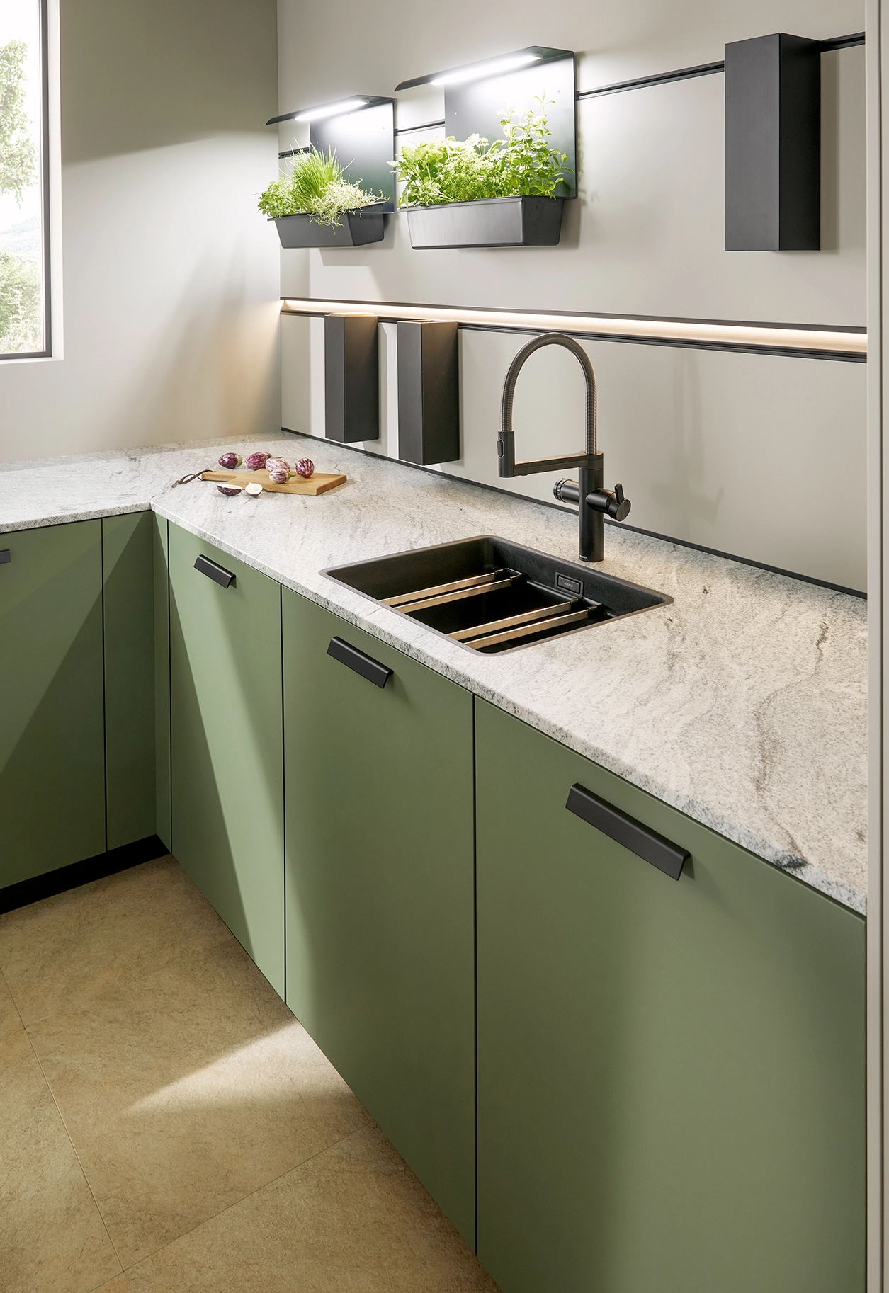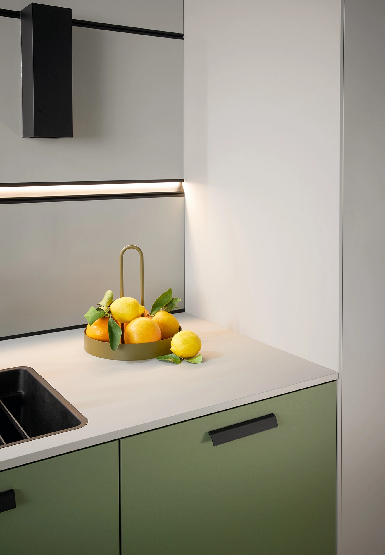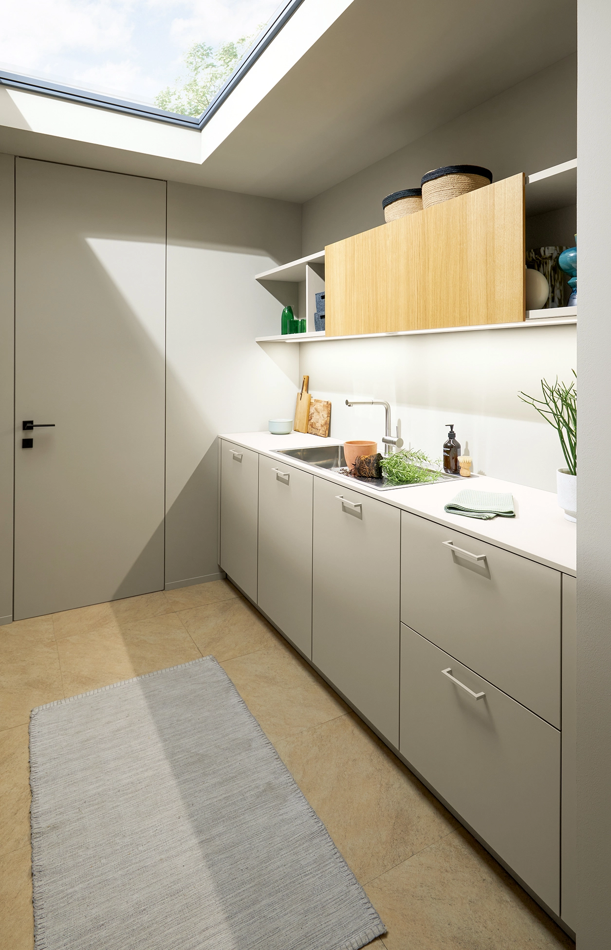 Pocit pohody v miestnosti sprostredkúva olivovozelené linoleum vyrobené z prírodných materiálov a drevotrieskové dosky vyrobené výhradne z recyklovaných materiálov. Rad vysokých jednotiek, pracovné dosky a vnútorné časti korpusu majú kamienkovo sivý matný zamatový povrch, ktorý im umožňuje dokonale zapadnúť do celkového obrazu.