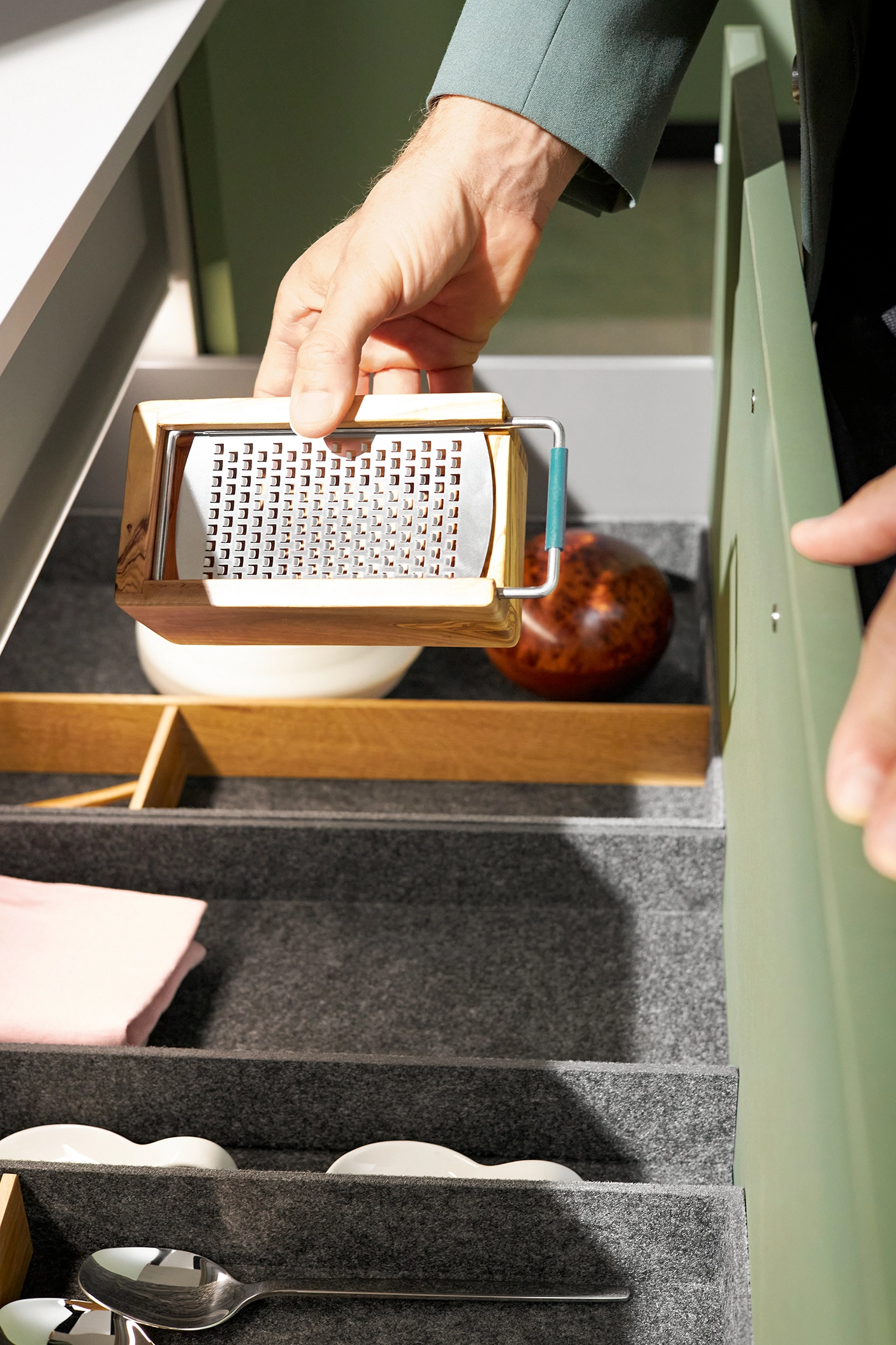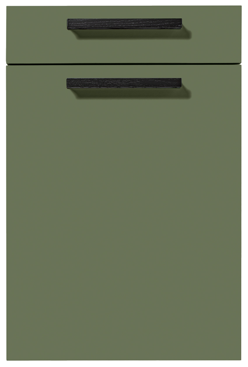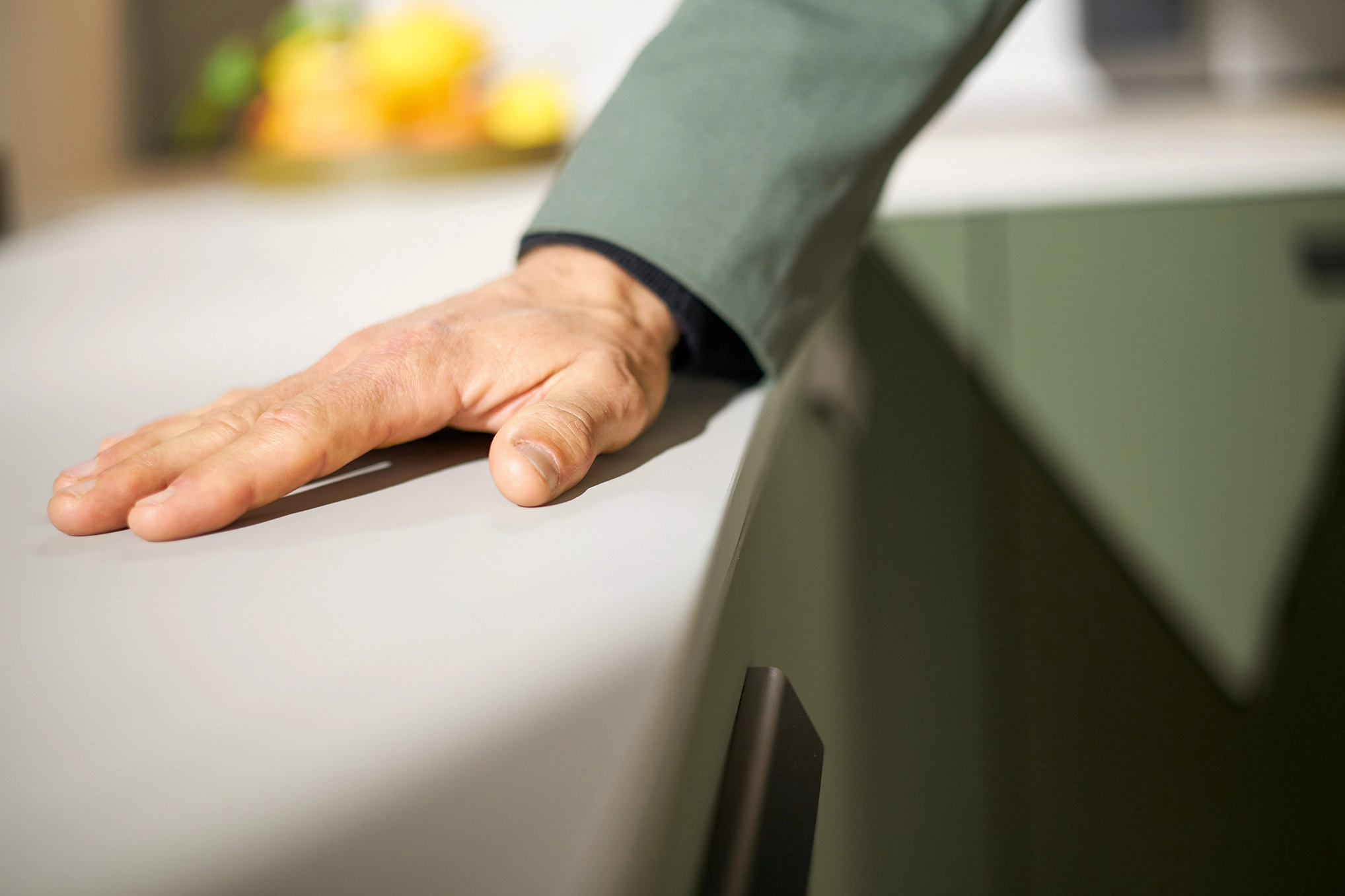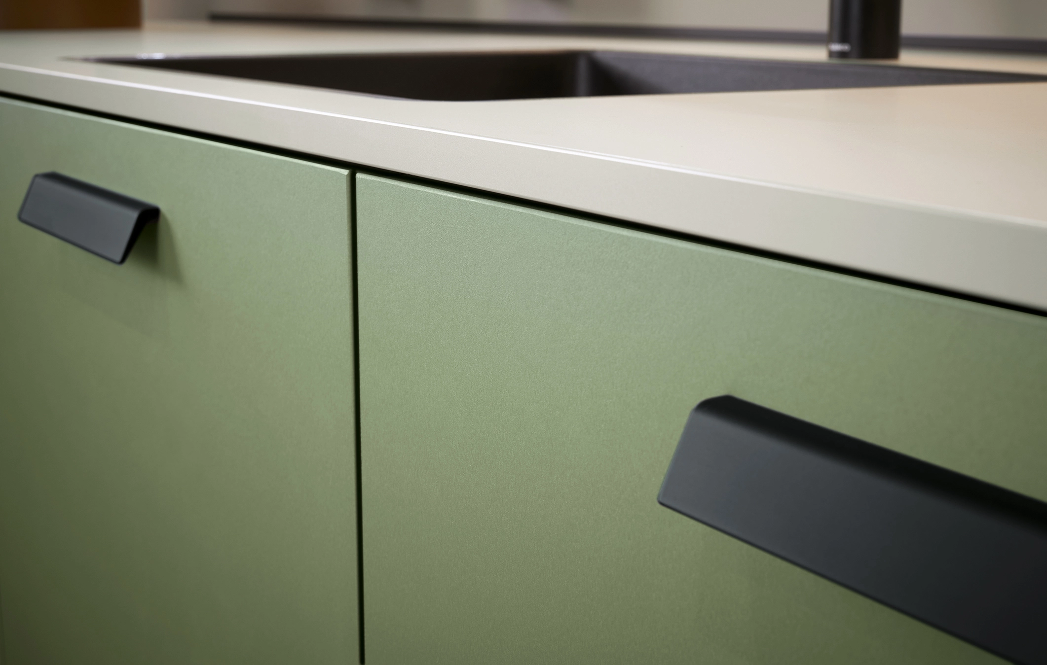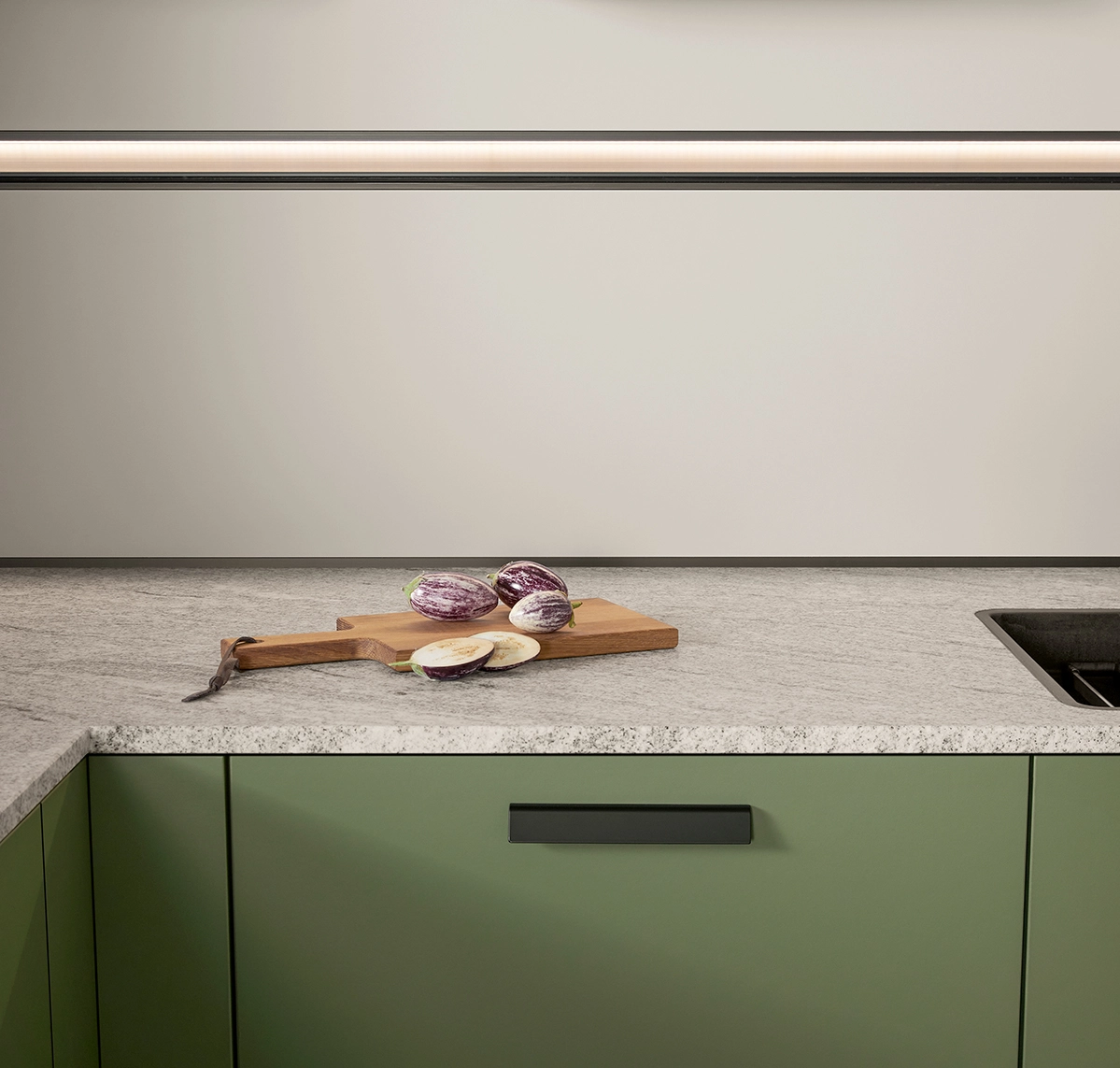 Pocit pohody v miestnosti sprostredkúva olivovozelené linoleum vyrobené z prírodných materiálov a drevotrieskové dosky vyrobené výhradne z recyklovaných materiálov. Rad vysokých jednotiek, pracovné dosky a vnútorné časti korpusu majú kamienkovo sivý matný zamatový povrch, ktorý im umožňuje dokonale zapadnúť do celkového obrazu.