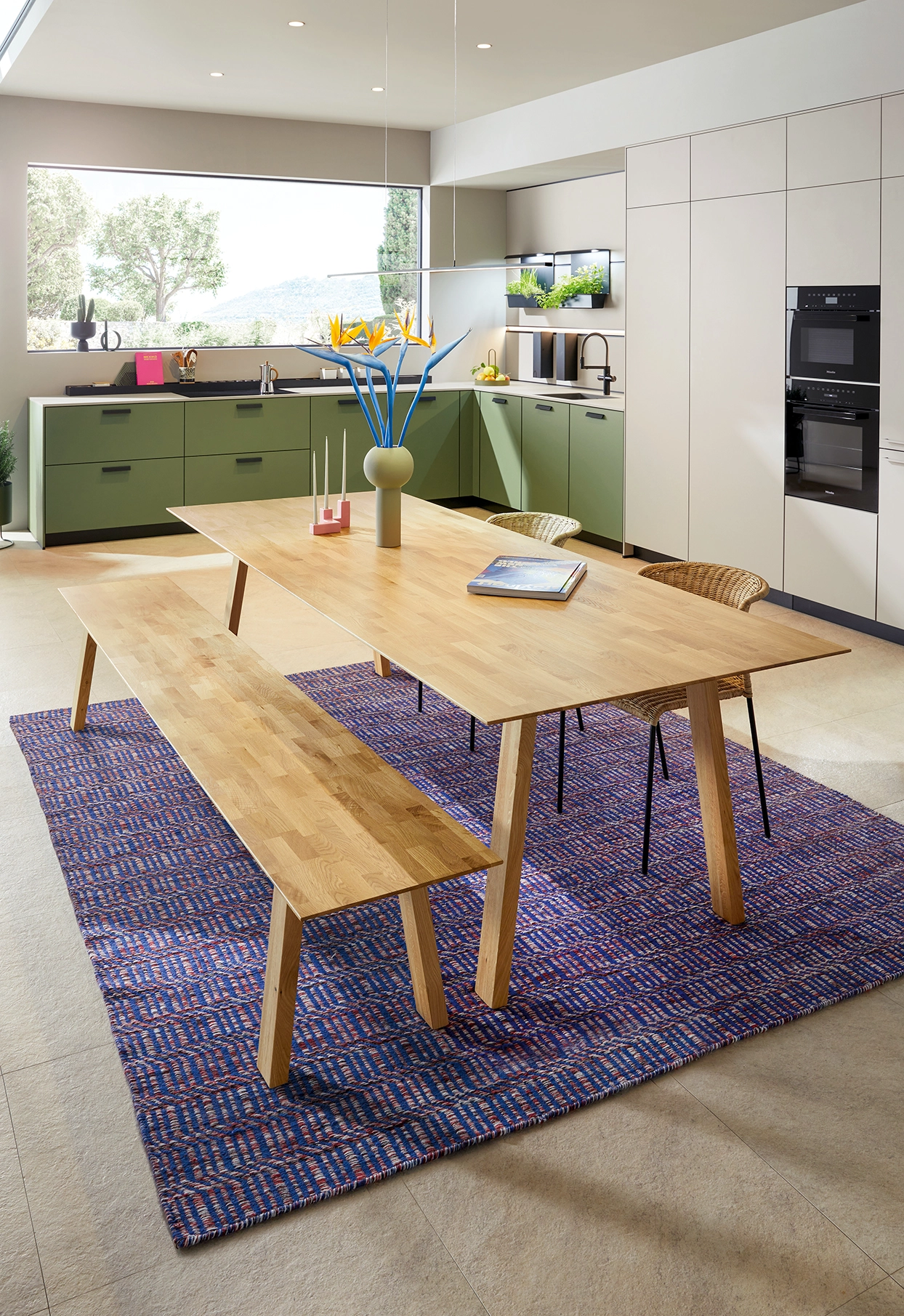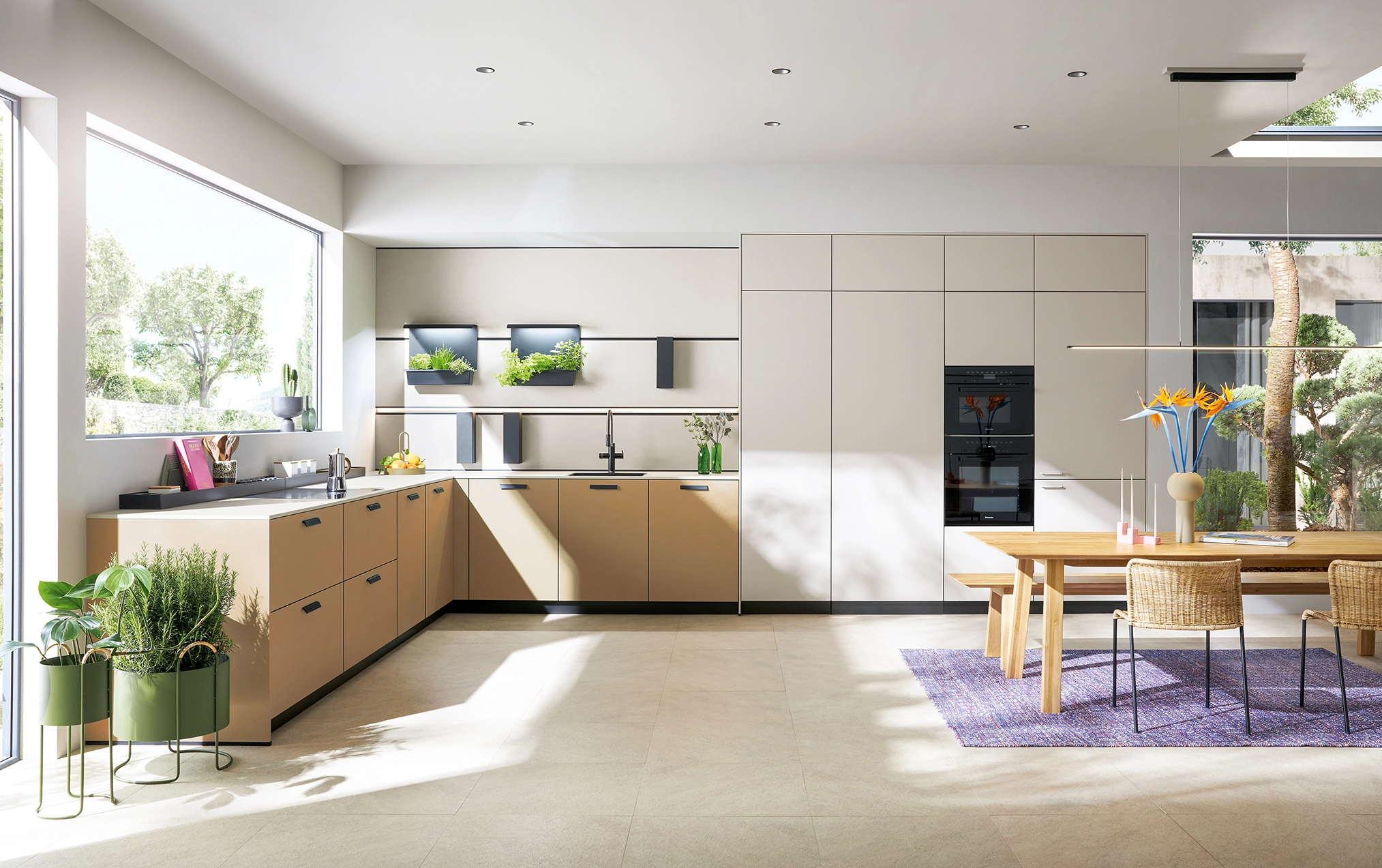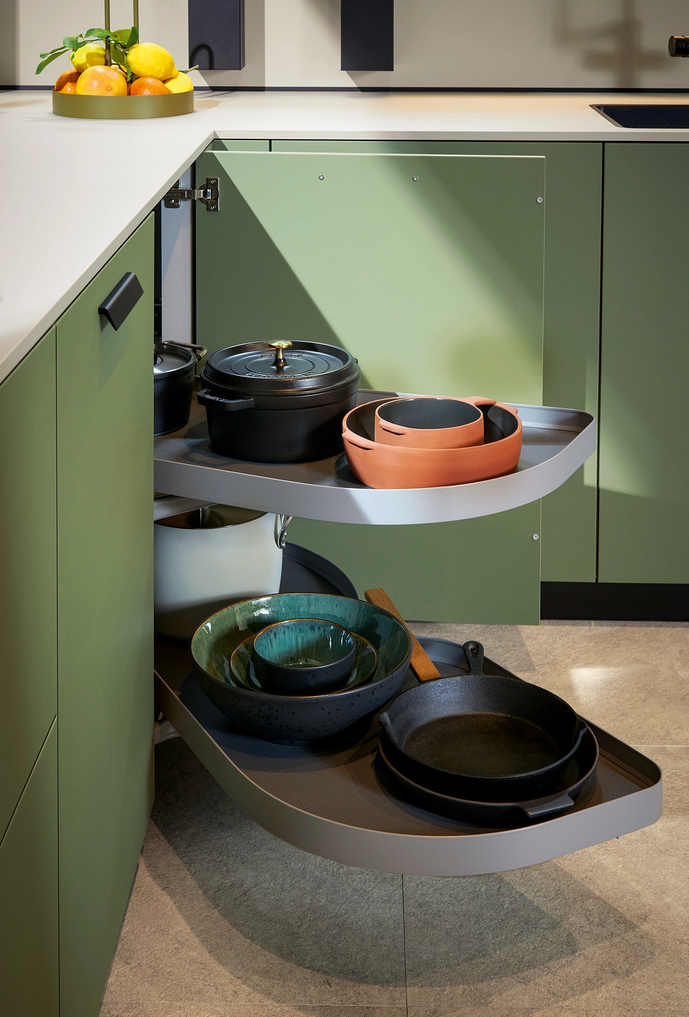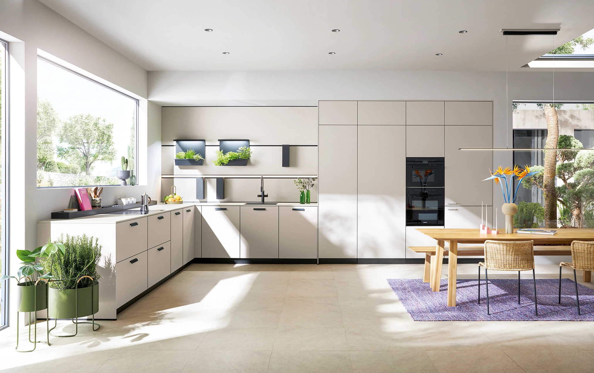Pocit pohody v miestnosti sprostredkúva olivovozelené linoleum vyrobené z prírodných materiálov a drevotrieskové dosky vyrobené výhradne z recyklovaných materiálov. Rad vysokých jednotiek, pracovné dosky a vnútorné časti korpusu majú kamienkovo sivý matný zamatový povrch, ktorý im umožňuje dokonale zapadnúť do celkového obrazu.