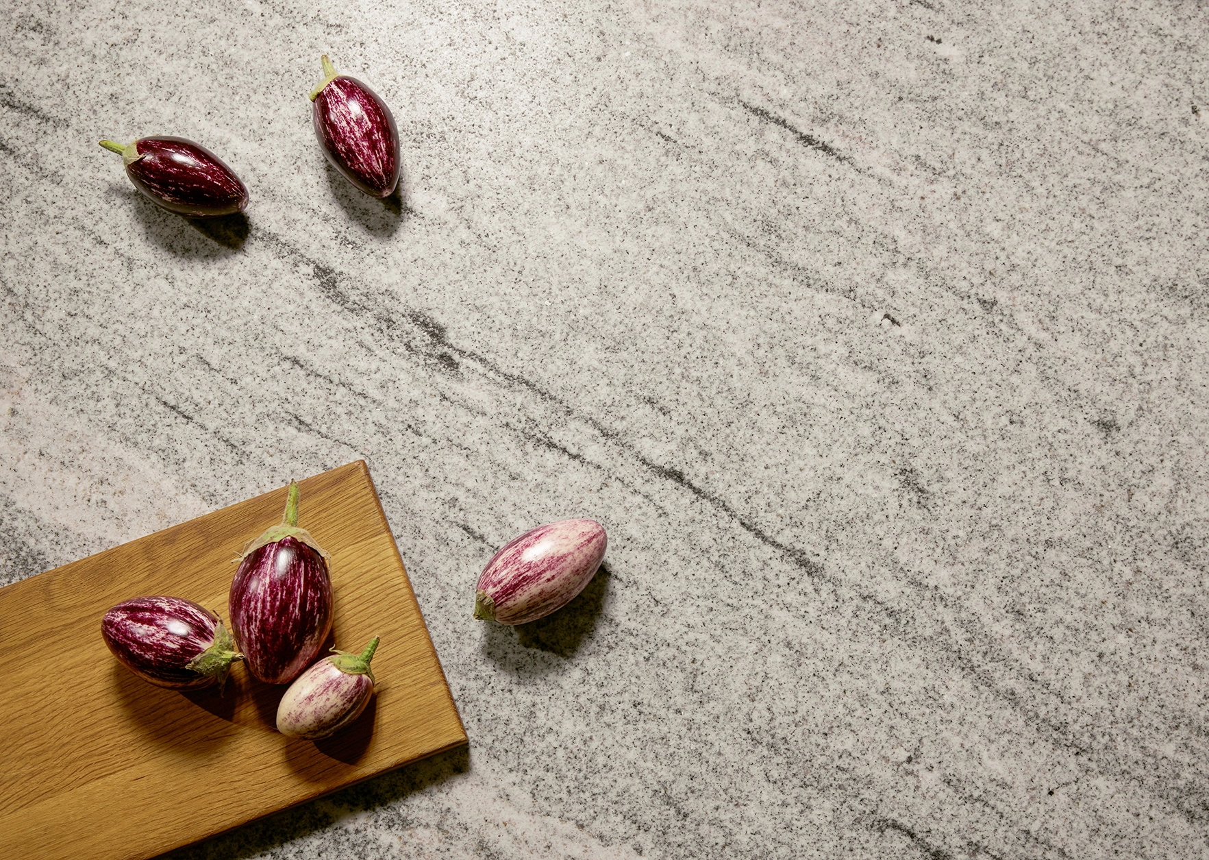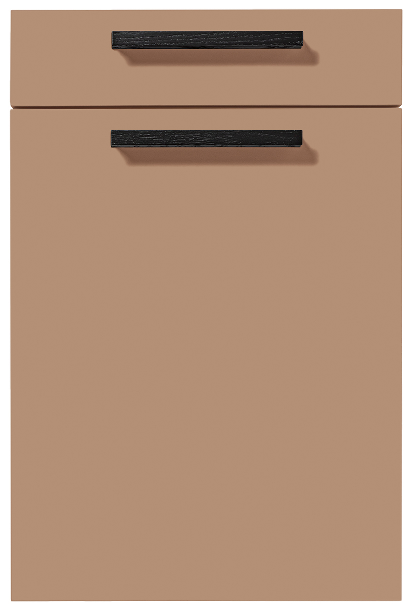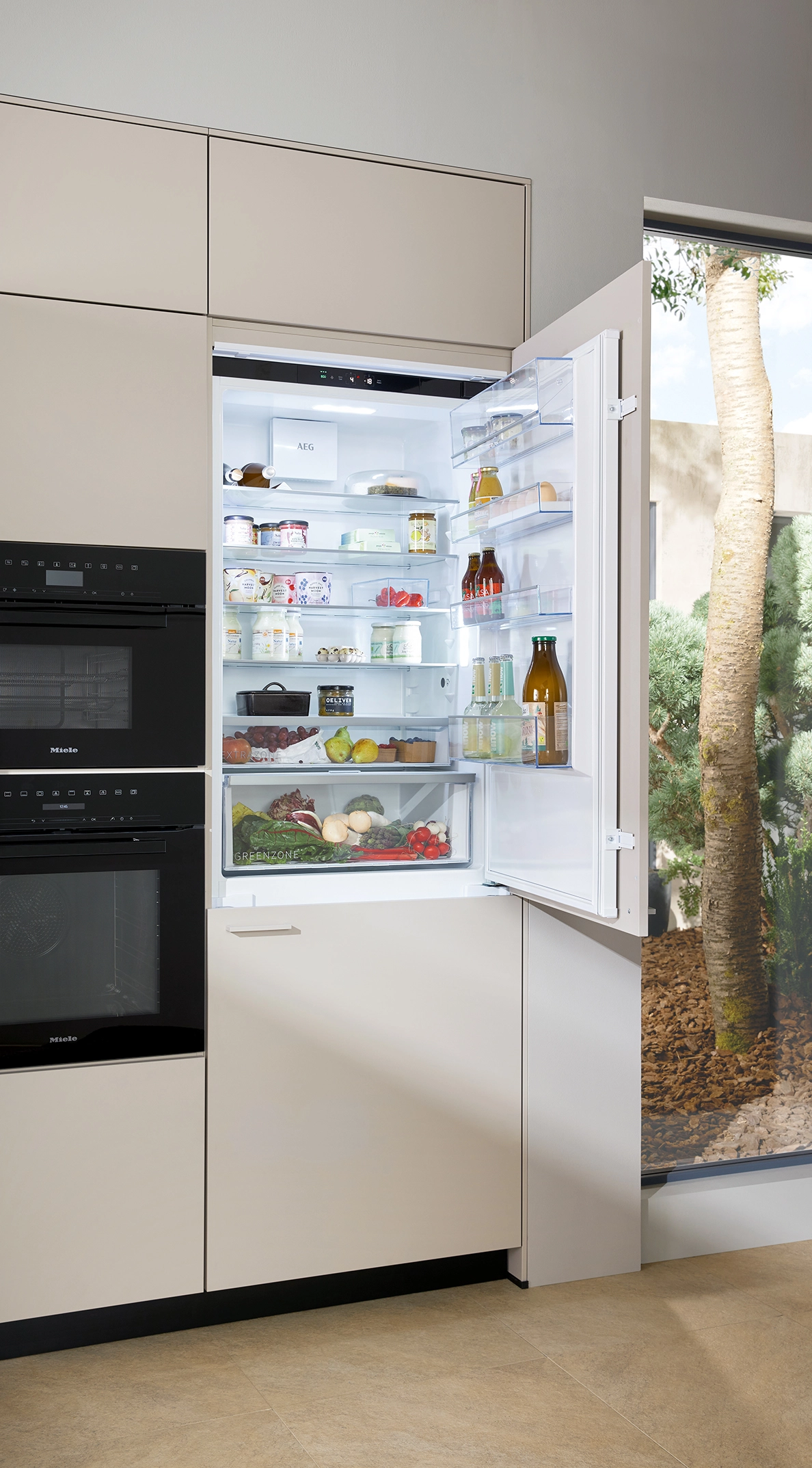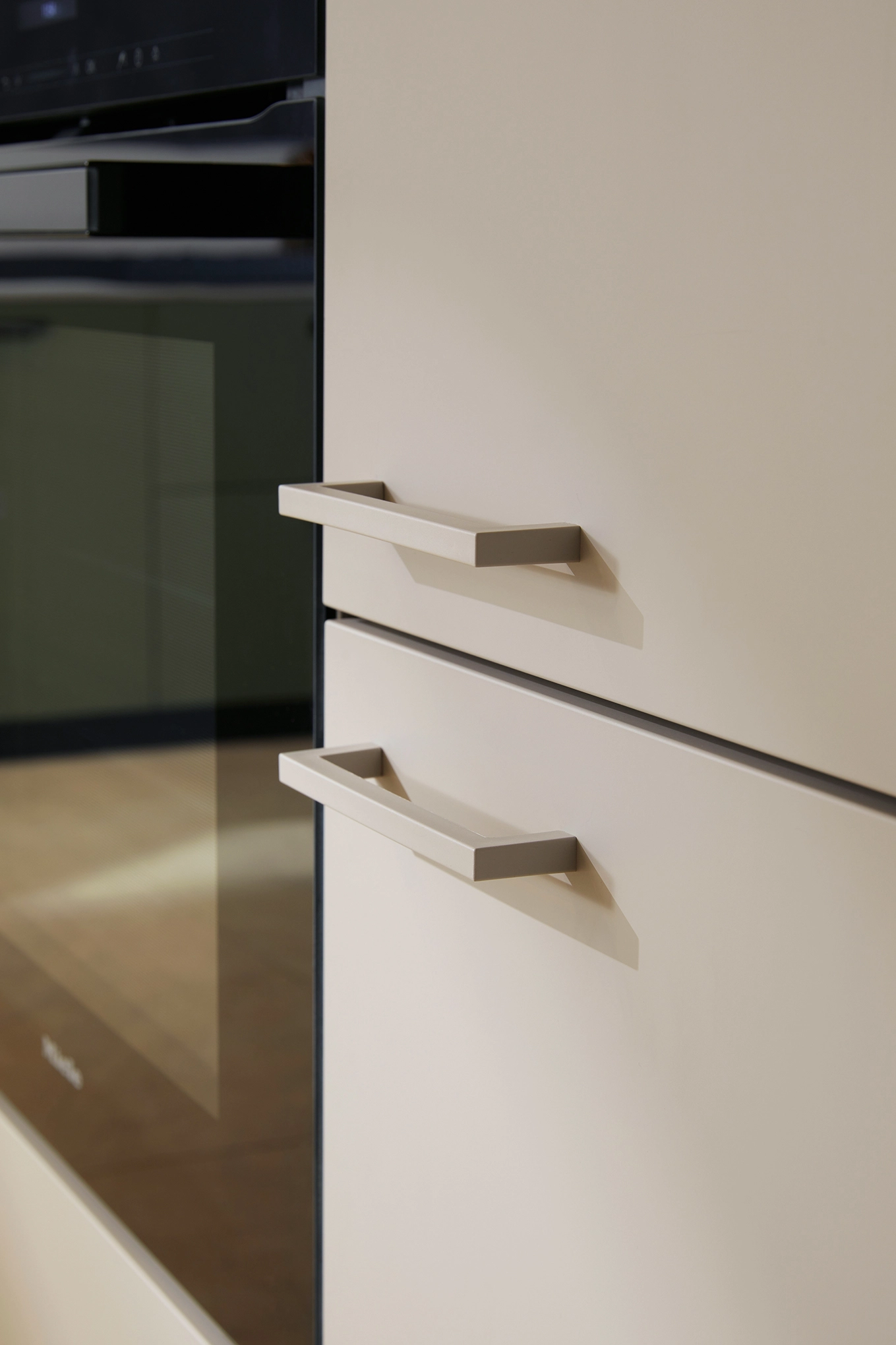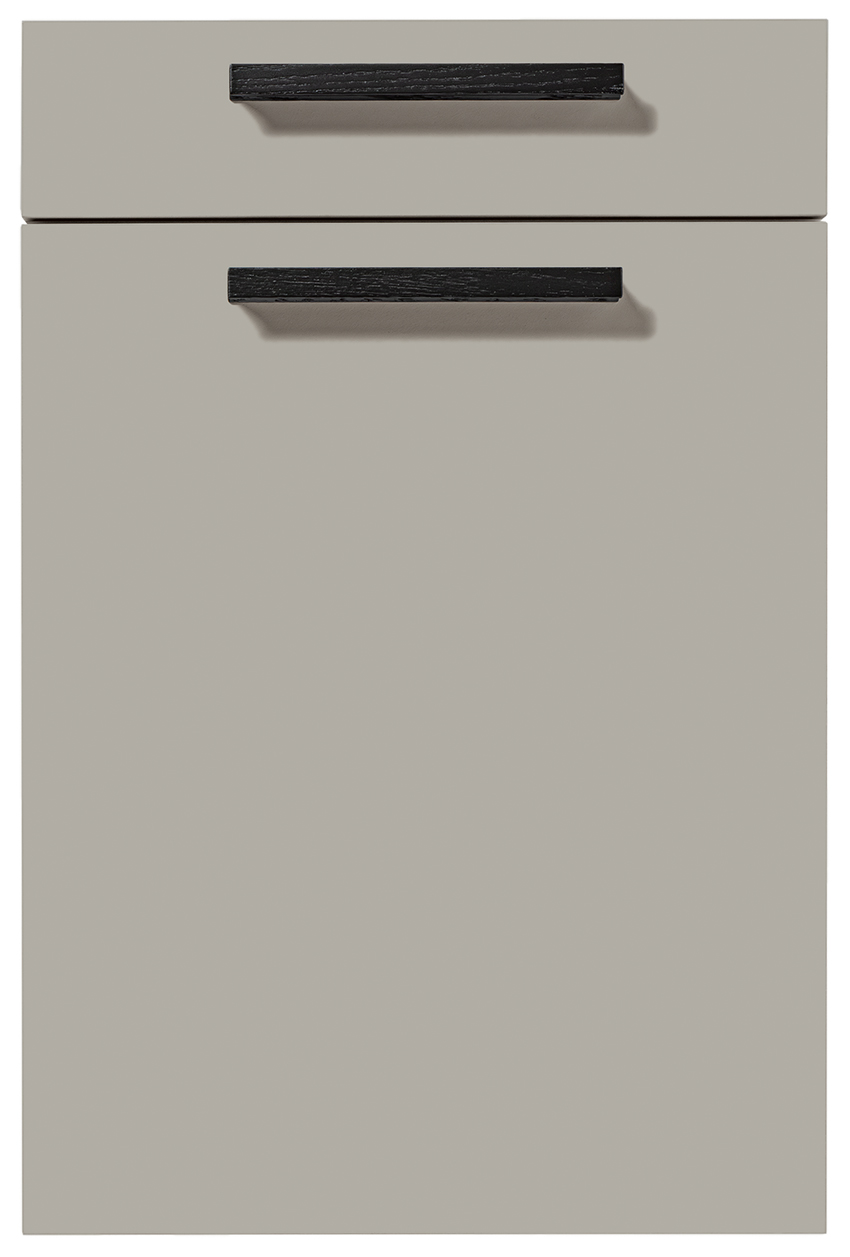 Pocit pohody v miestnosti sprostredkúva olivovozelené linoleum vyrobené z prírodných materiálov a drevotrieskové dosky vyrobené výhradne z recyklovaných materiálov. Rad vysokých jednotiek, pracovné dosky a vnútorné časti korpusu majú kamienkovo sivý matný zamatový povrch, ktorý im umožňuje dokonale zapadnúť do celkového obrazu.