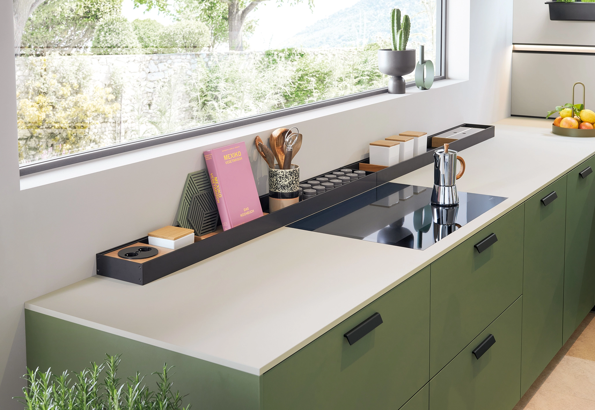 V jasne osvetlenom výklenku nad drezom vytvárajú čerstvé bylinky v panelovom systéme next125 príjemnú atmosféru, zatiaľ čo bylinky a koreniny, kuchárske knihy a náčinie možno štýlovo umiestniť do praktického odkladacieho stojana za varnou doskou.