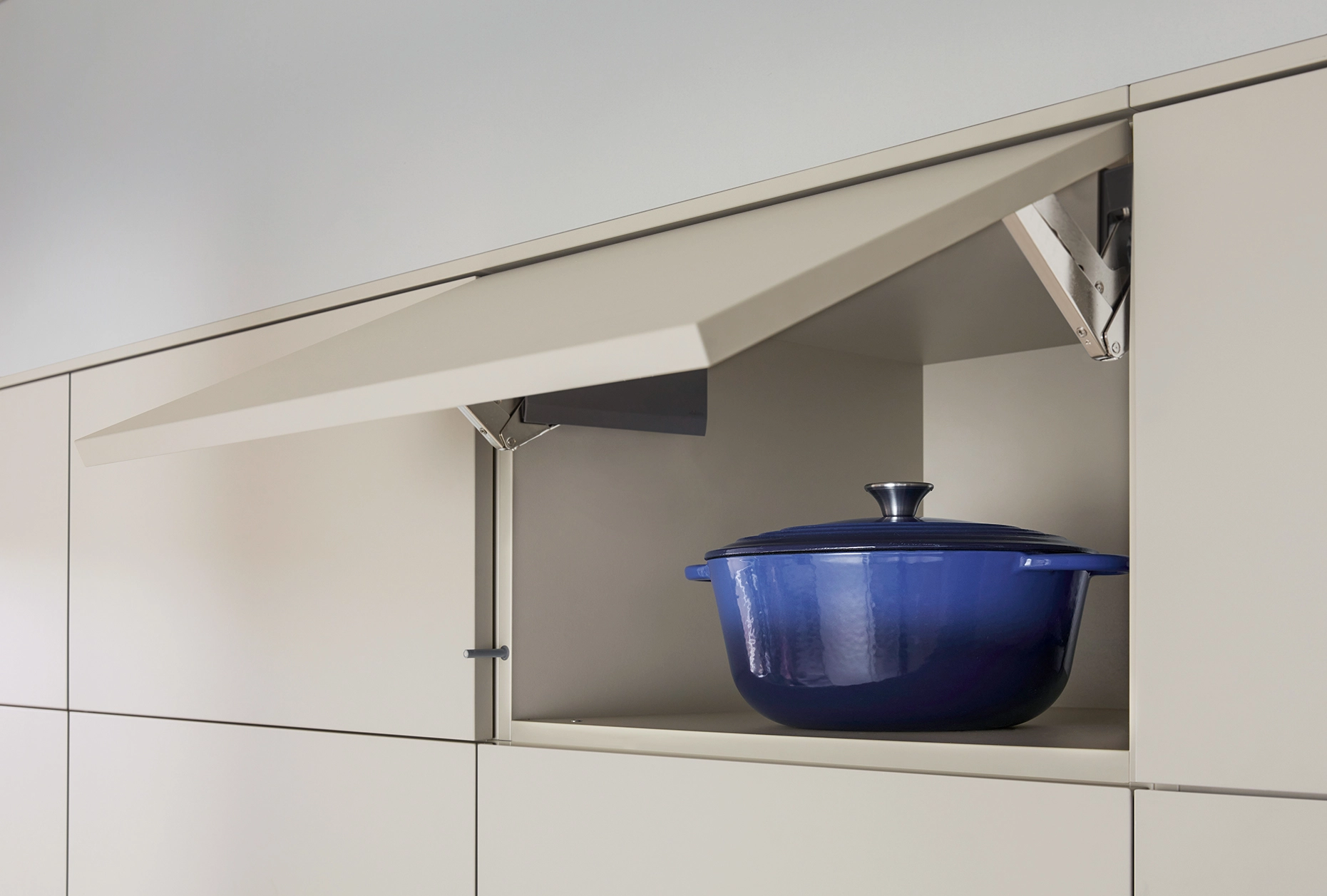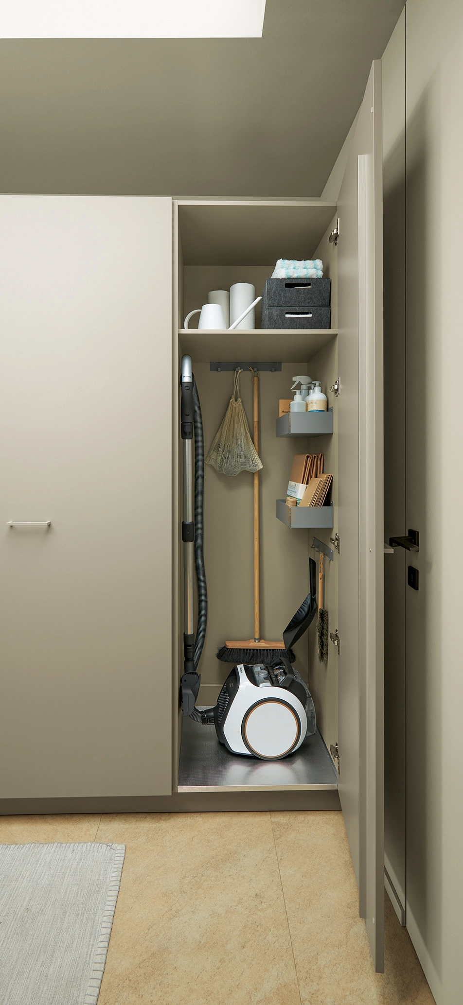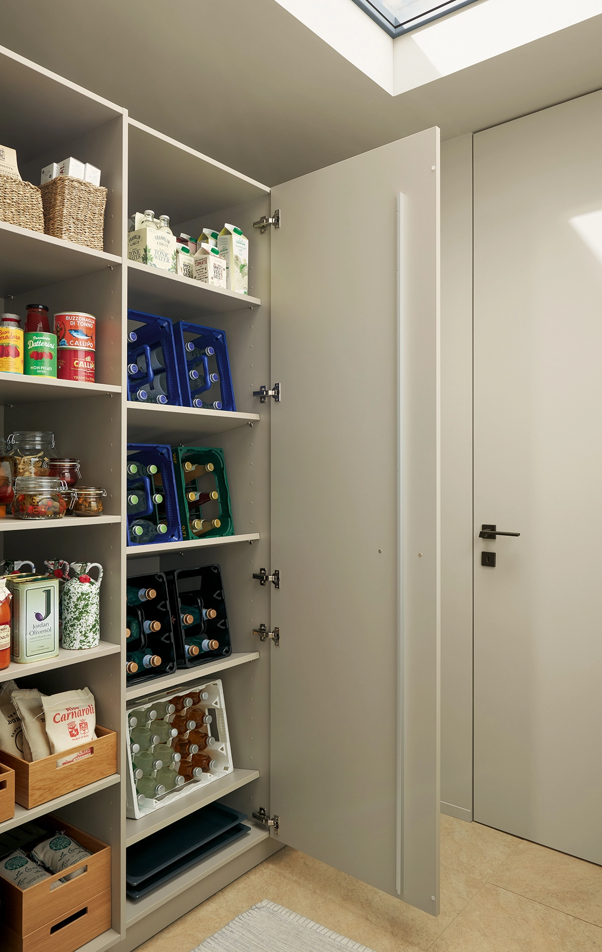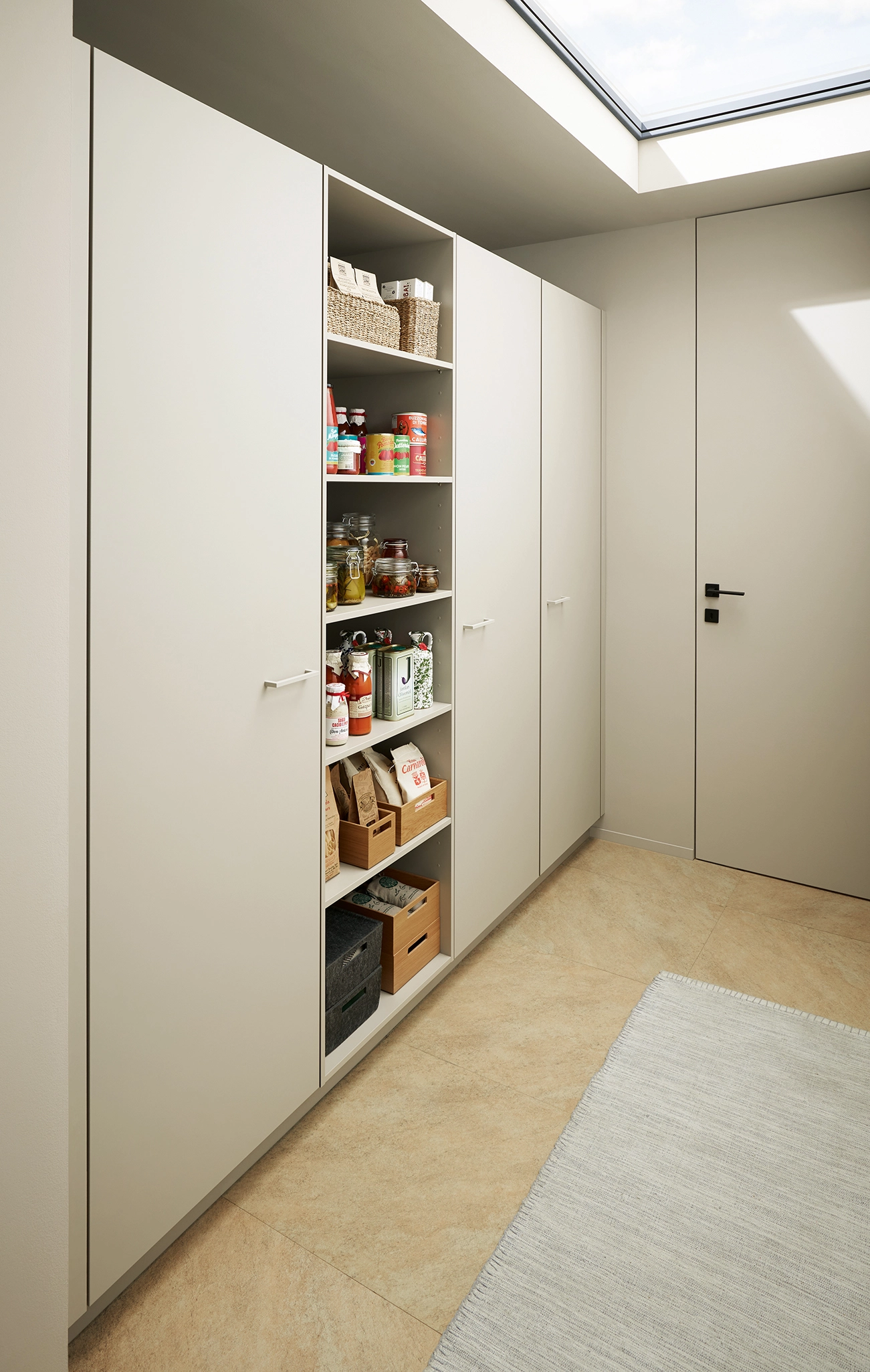 Tí, ktorí hľadajú miesto pre praktické predmety uprostred tohto pokoja a mieru, ho nájdu za dverami špajze, ktorá je maskovaná ako vysoká jednotka. Špajza, ukrytá za vysokými dvierkami, poskytuje prídavné umývadlo a dostatok priestoru na skladovanie zásob alebo vykonávanie domácich prác.