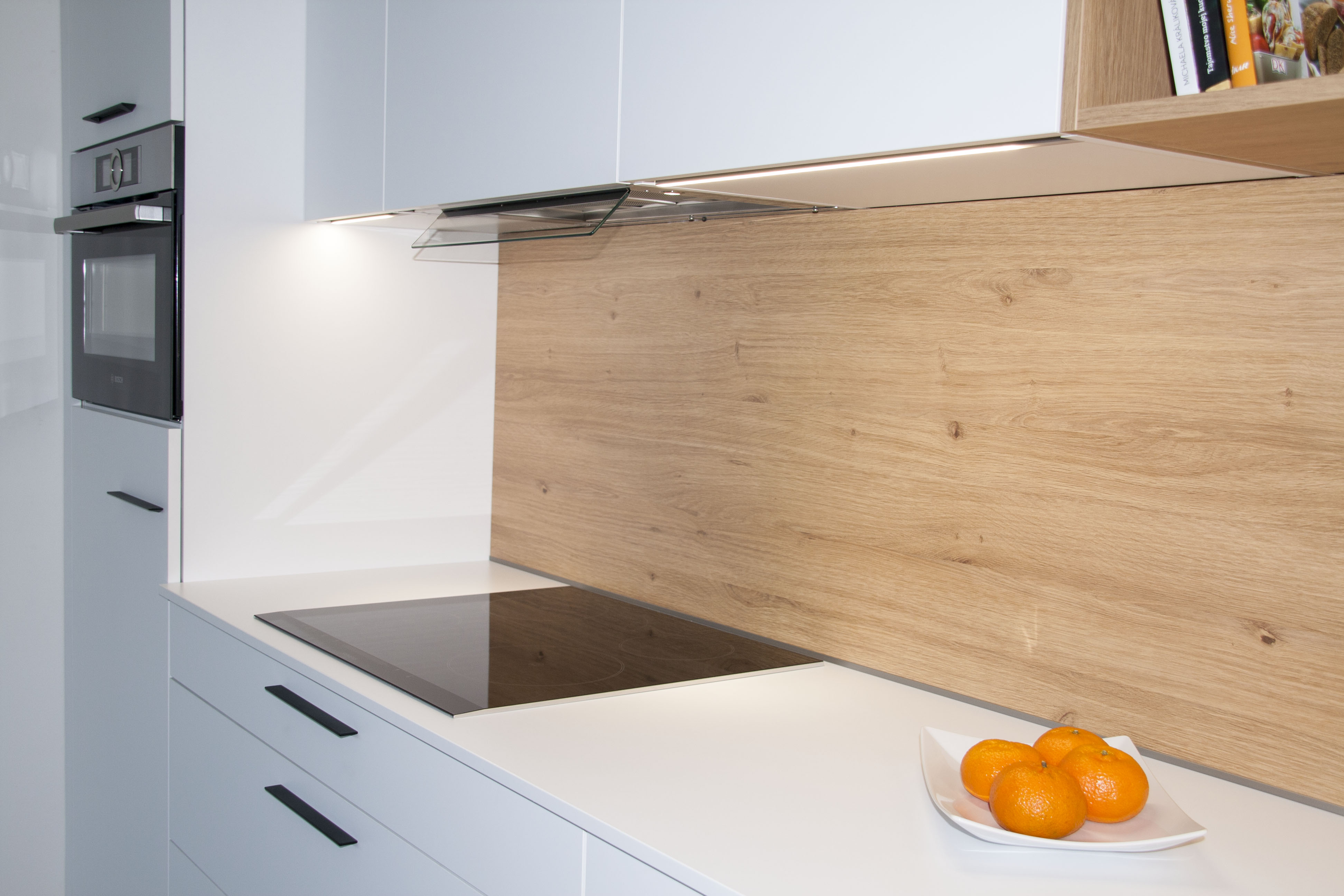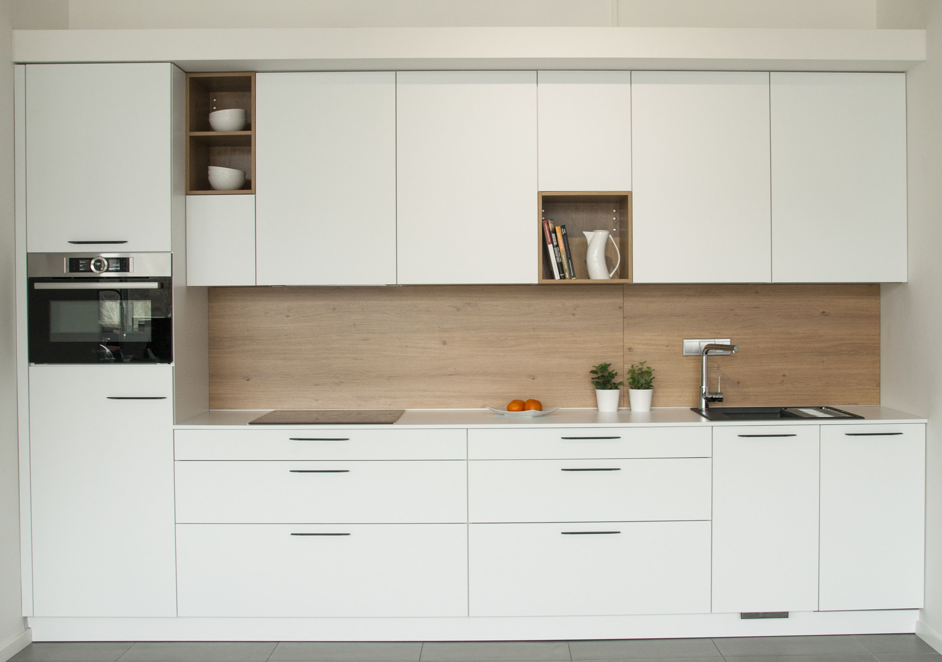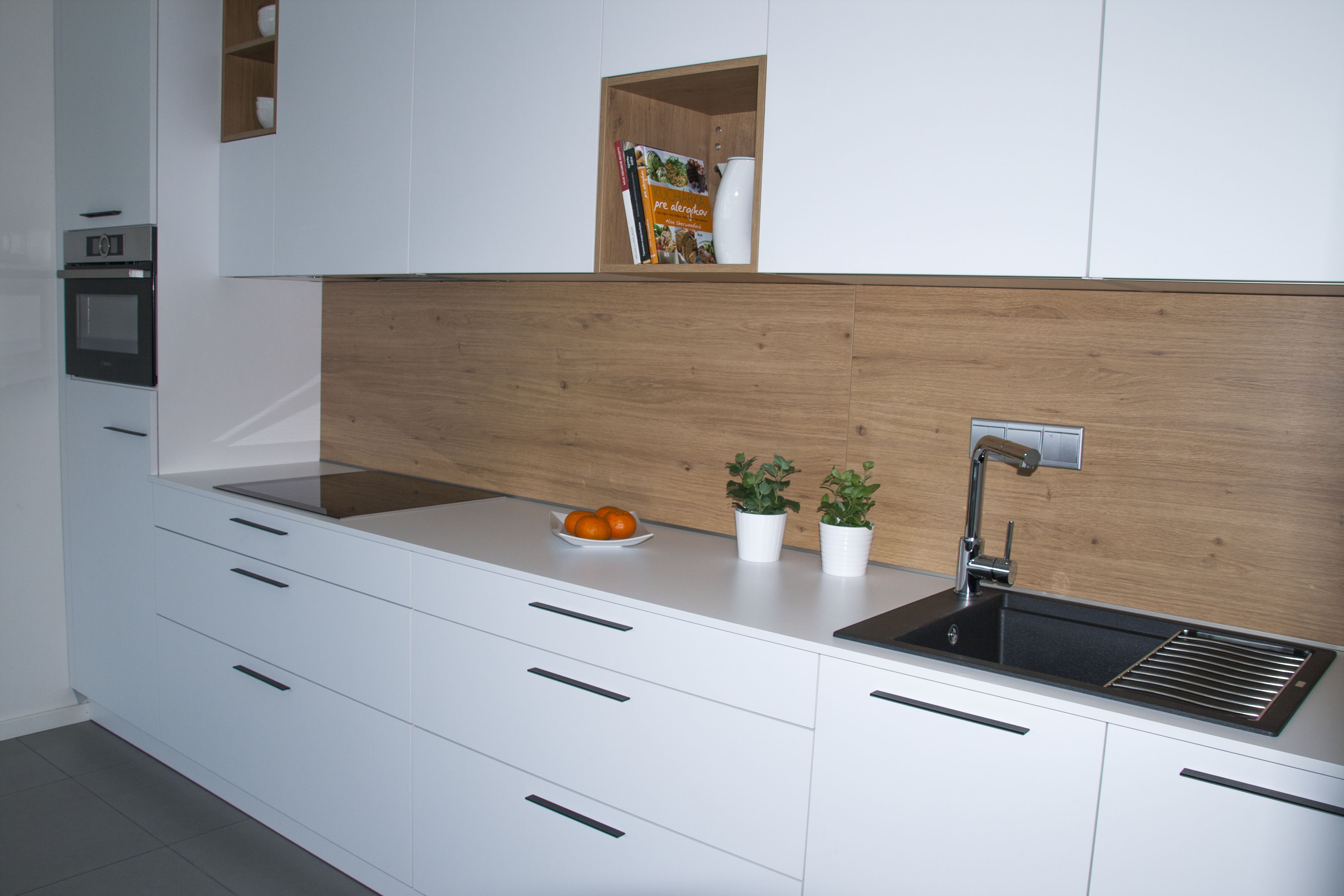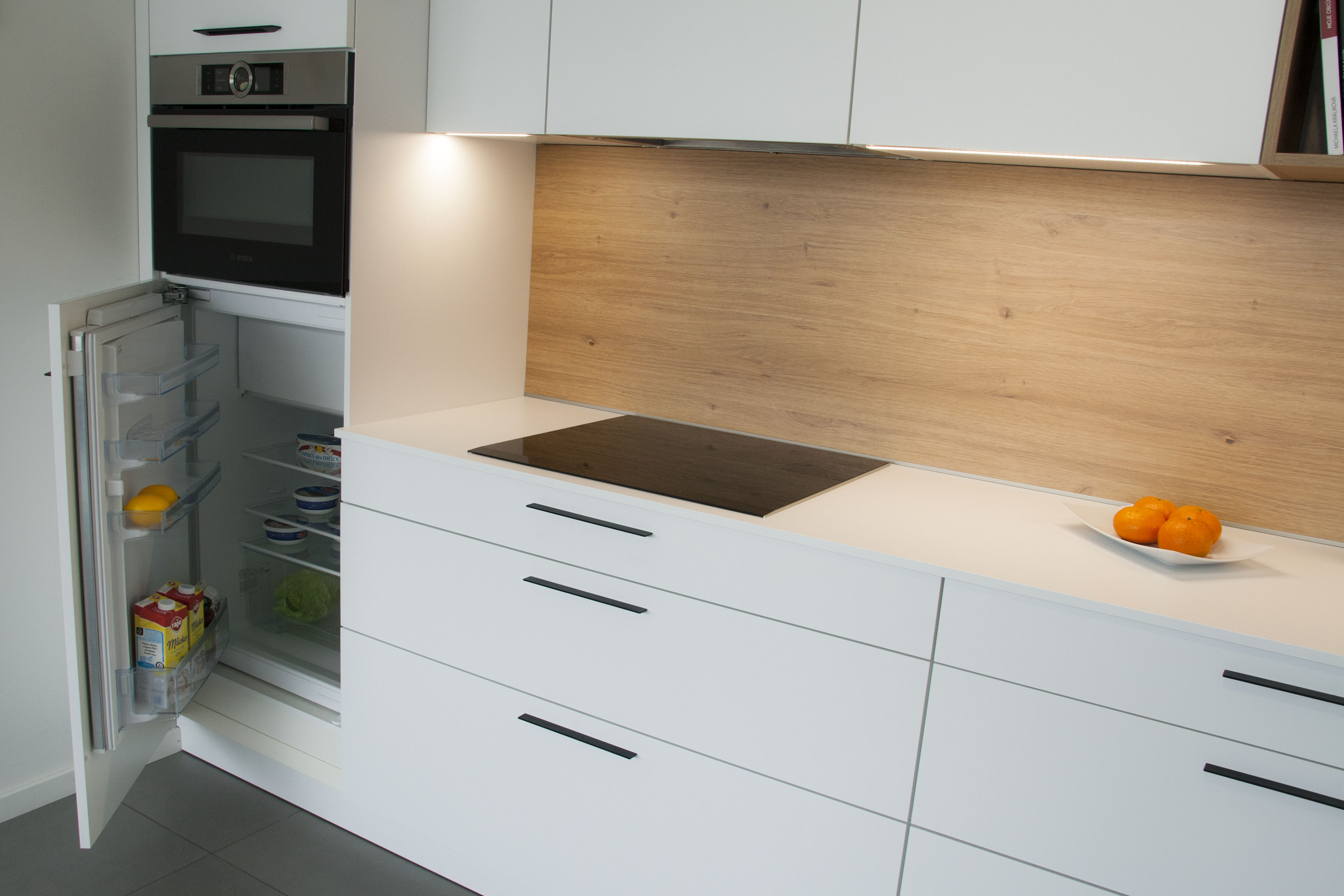 • vo vysokej skrini je zabudovaná chladnička Bosch KIL18V60 s výparníkom, nad ktorou je kompaktná rúra kombinovaná s mikrovlnným ohrevom Bosch CMG656BS1
