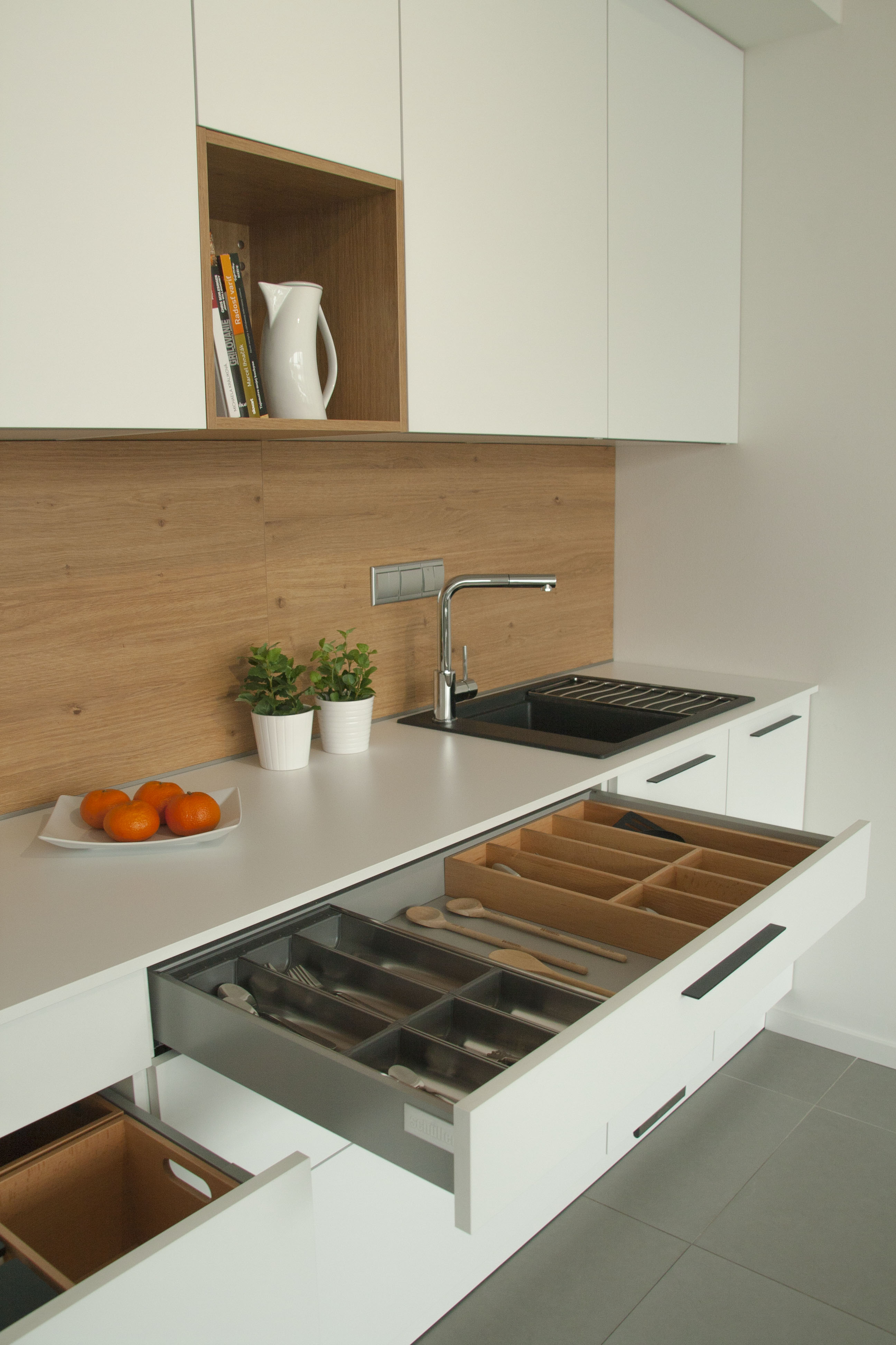 • vedľa drezu Blanco Elon 45S antracit je vstavaná 45 cm široká umývačka riadu Bosch SPV69T70EU TimeLight, ktorá premieta údaje o prevádzke na podlahu