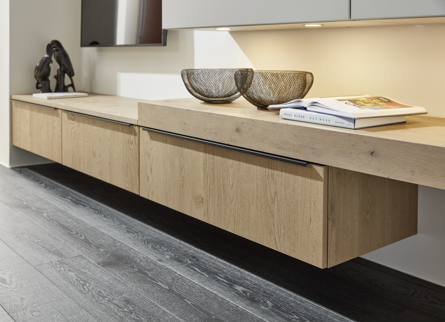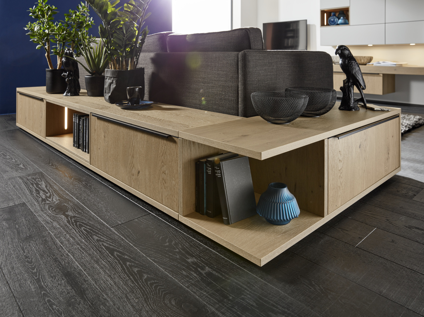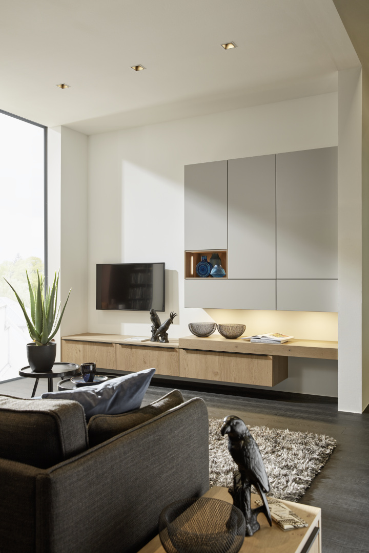 Extrémny stupeň prispôsobiteľnosti robí z tejto nástennej zostavy ideálne riešenie. Spolu s elegantným nábytkom do obývačky vyžaruje pocit čistého relaxu.