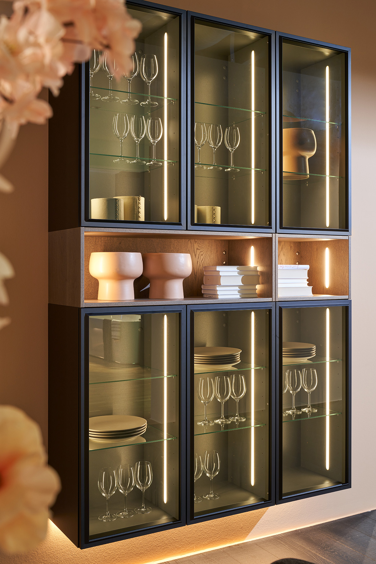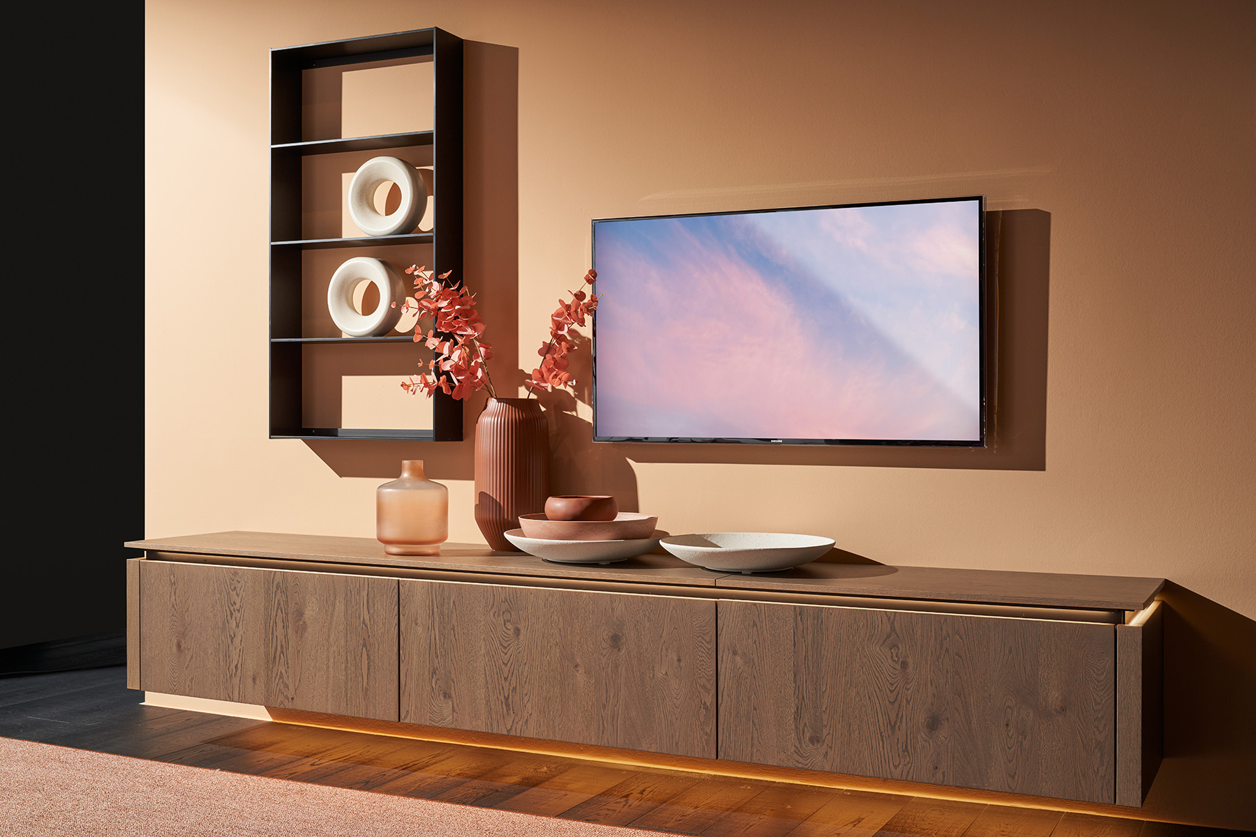 Televízna skrinka v prevedení TAVOLA dub Barolo zaujme každého najmä vďaka osvetlenej dráhe rukoväte, ktorá zvýrazňuje kvalitnú dyhu prednej strany. Jemný detail, ktorý má veľký vplyv. Dizajn dopĺňa čierna polica MotionLine a slúži ako ďalší pútač.
