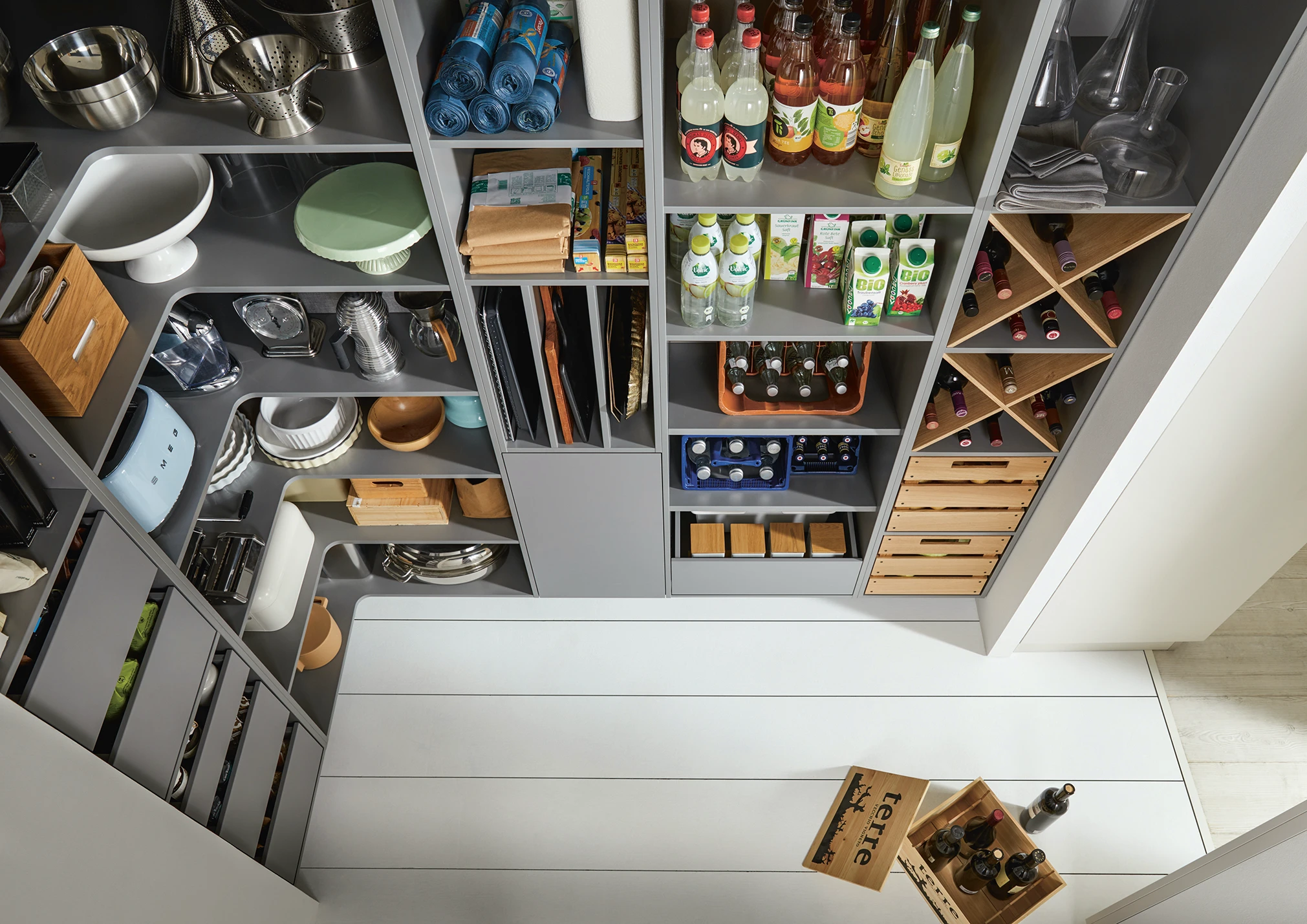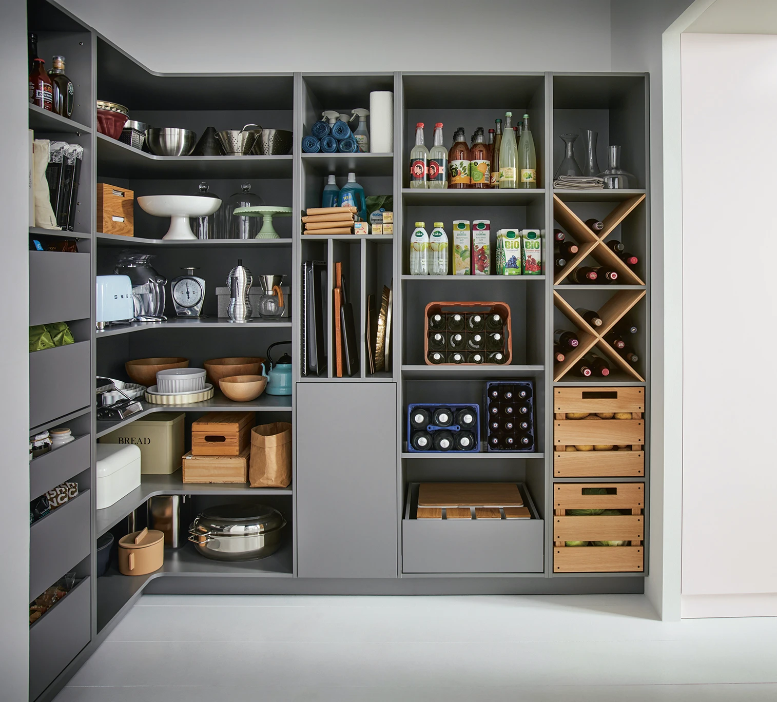 Na nič sa nezabúda – šikovné riešenia ponúkajú jasný prehľad a umožňujú využiť každý centimeter dostupného priestoru. A skvelé na tom je, že špajzu netreba skrývať!