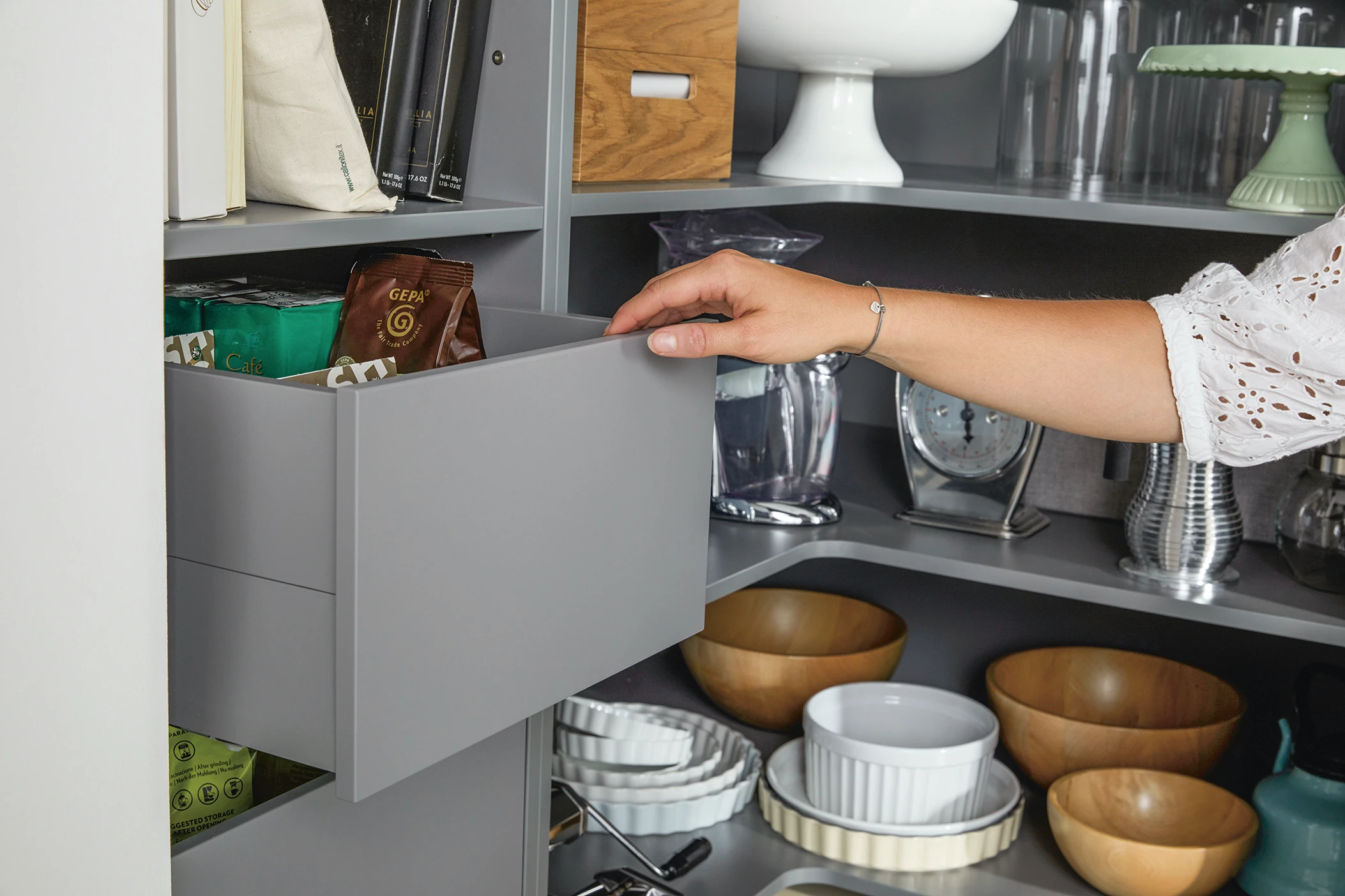 Drobné náčinie a veci, ktoré by nemali byť viditeľné, si okamžite nájdu perfektné miesto vo výsuvoch. Taniere, šálky a spol. môžu byť perfektne vystavené v otvorených poličkách.
