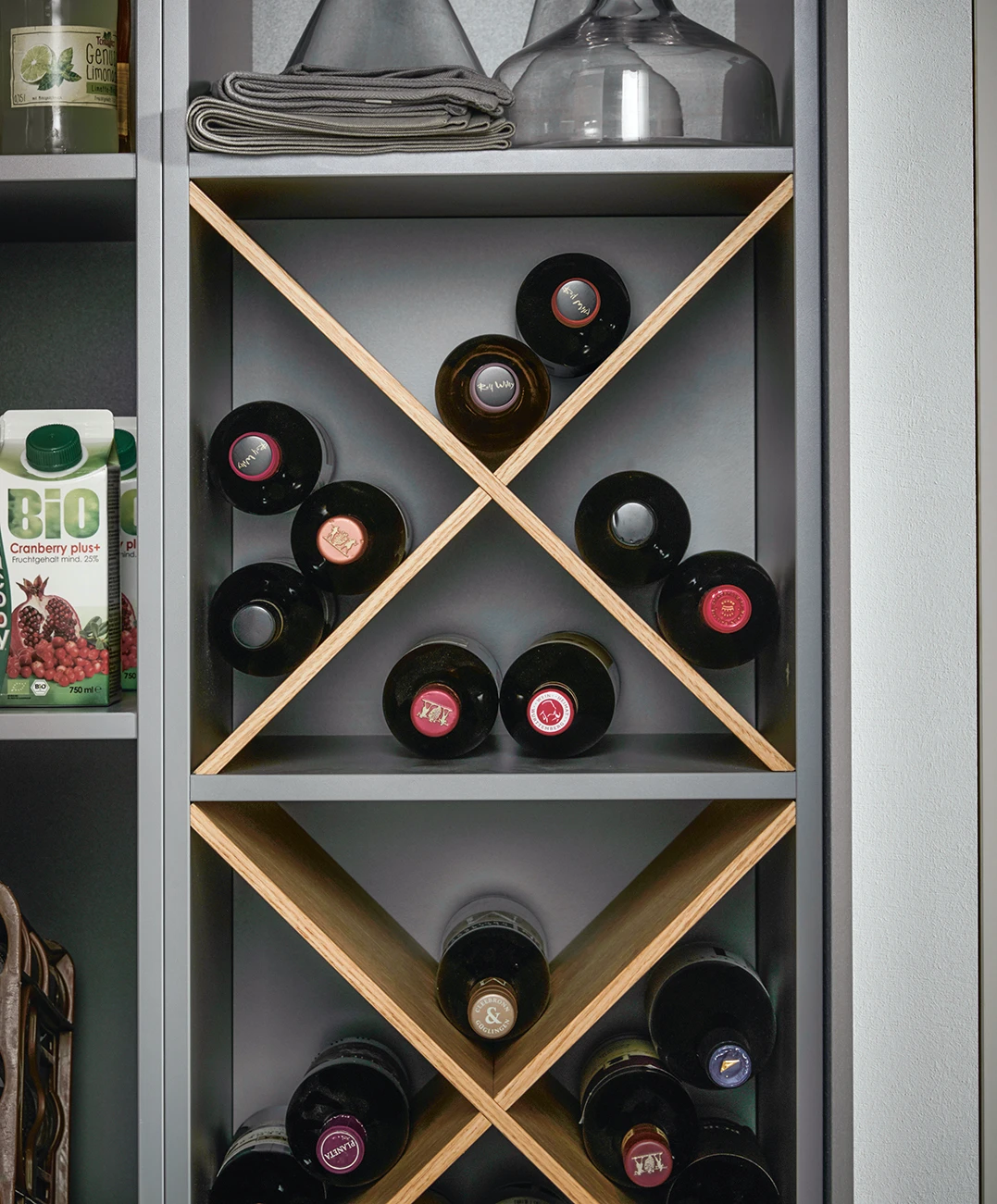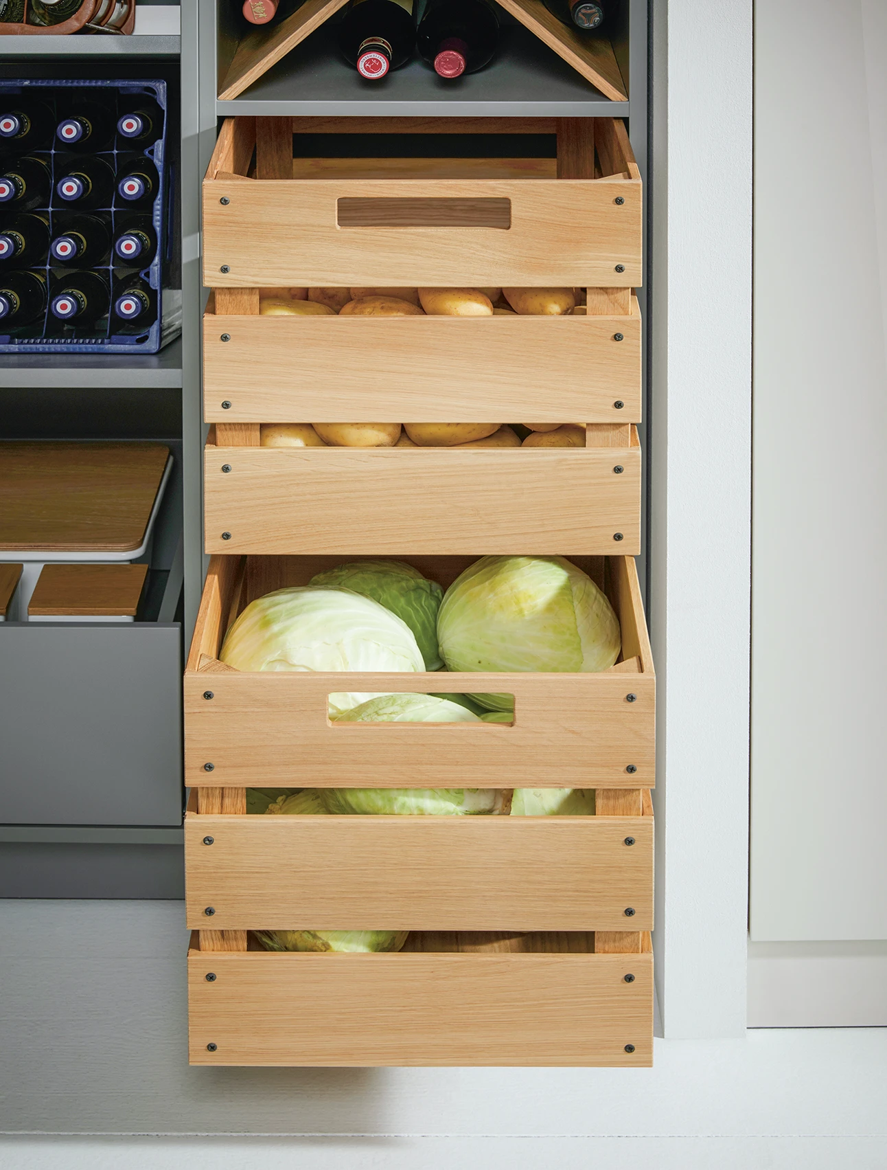 Výsuvy vo vzhľade prepravky predstavujú láskyplné detaily, ktoré umožňujú skladovať ovocie a zeleninu praktickým a štýlovým spôsobom. Vďaka svojmu autentickému a prirodzenému vzhľadu sú výsuvy z dubu zároveň krásnym dizajnovým prvkom v kuchyni a dodávajú homogénnemu dizajnu dvierok svetlejší vzhľad.