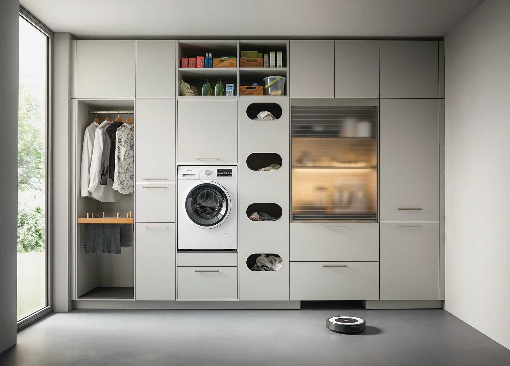 Technická miestnosť – perfektne naplánovaná pracovná plocha, v ktorej s radosťou sušíte bielizeň mimo dohľadu a úhľadne skladujete jedlo a pitie, čistiace prostriedky a dokonca aj obuv. Všetko na jednom mieste, presne tam, kde je to potrebné. Príliš dobré, aby to bola pravda?